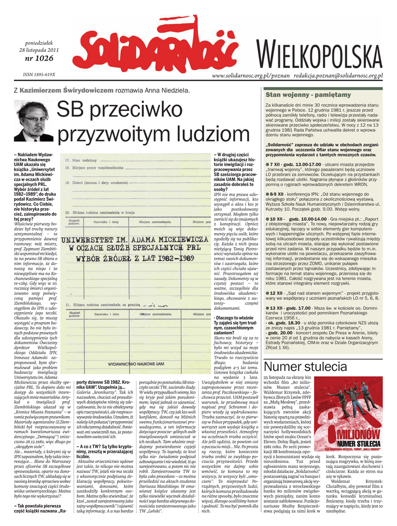 poniedziałek 28 listopada 2011 nr 1026 ISSN 1895-619X SB przeciwko przyzwoitym ludziom www.solidarnosc.org.pl/poznan [email protected] Z Kazimierzem Świrydowiczem rozmawia Anna Niedziela. – Nakładem Wydawnictwa Naukowego UAM ukazała się książka „Uniwersytet im. Adama Mickiewicza w oczach służb specjalnych PRL. Wybór źródeł z lat 1982–1989”, do druku podał Kazimierz Świrydowicz. Co Ciebie, nie historyka przecież, zainspirowało do tej pracy? Właściwie pierwszy bodziec był trochę natury sentymentalnej - to przypomnienie dawnej rozmowy: mój mistrz, prof. Zygmunt Ziembiński wspominał mi kiedyś, że na pewno SB zbiera o nim informacje, że donoszą na niego i że niewątpliwie ma na Kochanowskiego specjalną te-czkę. Gdy więc w 10. rocznicę śmierci organizowano sesję poświęconą pamięci prof. Ziembińskiego, wystąpiłem do IPN o udostępnienie jego teczki. Okazało się, że muszę wystąpić o program badawczy, bo nie było innych podstaw prawnych dla udostępnienia tych dokumentów. Ówczesny dyrektor Wielkopolskiego Oddziału IPN, Ireneusz Adamski zaproponował, bym sformułował jako problem badawczy inwigilację Uniwersytetu im. Adama Mickiewicza przez służby specjalne PRL. To dopiero dało mi dostęp do wszystkich interesujących mnie materiałów. Artykuł o inwigilacji prof. Ziembińskiego ukazał się w „Kronice Miasta Poznania” – w tomie poświęconym prawnikom. Materiały agenturalne (Z.Ziembiński był rozpracowywany w ramach kwestionariusza ewidencyjnego ,,Demagog'”) zniszczono 28.12.1989, więc długo po ,,okrągłym stole''. Ale... materiały, z którymi się w IPN zapoznałem, były takie interesujące.... Słane do Warszawy przez oficerów SB szczegółowe sprawozdania, oparte na donosach licznych TW, układają się w swoistą kronikę sprzeciwu wobec komuny znaczącej części środowiska uniwersyteckiego. Można było tego nie wykorzystać? – Tak powstała pierwsza część książki nazwana „Ra- – W drugiej części książki ukazujesz historie inwigilacji i rozpracowywania przez SB sześciorga pracowników UAM. Na jakiej zasadzie dobrałeś te osoby? IPN nie ma prawa udostępnić informacji, kto wystąpił o akta i kto je jako poszkodowany otrzymał. Mogłem tylko zwrócić się do znajomych z konspiracji. Oprócz moich są więc dokumenty pięciu osób, które zgodziły się na publikację. Każda z nich (poza nieżyjącą Tanią Pietrowicz) wyrażała opinie na temat swoich dokumentów i zastrzegała, które ich części chciała ujawnić. Przestrzegałem tej zasady. Dokumenty są w czystej postaci – to ważne, szczególnie dla środowiska akademickiego, obcowanie z autentycznymi dokumentami. porty dzienne SB 1982. Kronika UAM”. Uzupełnia ją... Galeria „kronikarzy”. Tak ich nazwałem, chociaż od prawdziwych dziejopisów różnią się zdecydowanie, bo to nie obiektywny opis rzeczywistości, ale rozpracowywanieśrodowiska.Uznałem,iż należy ich pokazać i przypomnieć ichnikczemnądziałalność.Ponieważ oni uwiecznili nas, ja postanowiłem uwiecznić ich. – A co z TW? Są tylko kryptonimy, zresztą w przerażającej liczbie. Aktualne orzecznictwo sądowe jest takie, że nikogo nie można nazwać TW, jeżeli nie ma teczki z własnoręcznie podpisaną deklaracją współpracy, pokwitowaniami, donosami, które zaszkodziły konkretnym osobom. Można tylko stwierdzać, że ktoś ,,został zarejestrowany jako tajny współpracownik'' i ujawnić taką informację. A u nas bardzo porządnie po poznańsku SB niszczyło teczki TW, zacierało ślady. W wielu przypadkach wiemy, kto się kryje pod jakim pseudonimem; lepiej jednak to ujawniać, gdy ma się jakieś dowody współpracy. TW, czy jak kto woli konfident, donosił na bliźnich swemu funkcjonariuszowi prowadzącemu, a ten informacje dotyczące poszcze- gólnych osób inwigilowanych umieszczał w ich teczkach. Tam właśnie znajdujemy potwierdzenie czyjejś współpracy. To legendy, że ktoś tylko nie- świadomie podpisał zobowiązanie i nie wiedział, iż go zarejestrowano, a potem nic nie robił. Zarejestrowanie TW to była cała procedura – co można prześledzić na aktach studenta Dariusza Matelskiego. W omawianej książce ukazany jest tylko niewielki wycinek działalności tego bardzo aktywnego donosiciela zarejestrowanego jako TW „Leński”. - Dlaczego to właśnie Ty zająłeś się tym trudnym, czasochłonnym zadaniem? Skoro nie brali się za to fachowcy, historycy – było mi wstyd za moje środowisko akademickie. Trwało to rzeczywiście długo; badania podjąłem 4-5 lat temu. Gotowa książka czekała na wydanie 3 lata. Uwzględniłem w niej zmiany zaproponowane przez recenzenta prof. Paczkowskiego – fachowca przecież. UAM postawił warunek, że przedmowę musi napisać prof. Schramm i dopiero wtedy ją wydrukowano. Trzeba zaznaczyć, że to pierwszy w Polsce przypadek, gdy uniwersytet sam wydaje książkę o własnej przeszłości. Atmosferę na uczelniach trzeba oczyścić. Ale jeśli sądzisz, że powiem coś o poczuciu misji... Nie. Po prostu są rzeczy, które koniecznie trzeba zrobić ze zwykłego poczucia przyzwoitości. Przede wszystkim nie dajmy sobie wmówić, że komuna to my wszyscy, że wszyscy byli „umoczeni”. To nieprawda! Porządnych, przyzwoitych ludzi, których komuna prześladowała na różne sposoby, było znacznie więcej, dlatego ocaliliśmy honor i godność. To ma być pomnik dla nich. Stan wojenny - pamiętamy Za kilkanaście dni minie 30 rocznica wprowadzenia stanu wojennego w Polsce. 12 grudnia 1981 r. jeszcze przed północą zamilkły telefony, radio i telewizja przestały nadawać programy. Oddziały wojska i milicji zostały skierowane skierowane przeciwko społeczeństwu. W nocy z 12 na 13 grudnia 1981 Rada Państwa uchwaliła dekret o wprowadzeniu stanu wojennego. „Solidarność” zaprasza do udziału w obchodach zorganizowanych dla uczczenia Ofiar stanu wojennego oraz przypomnienia wyda