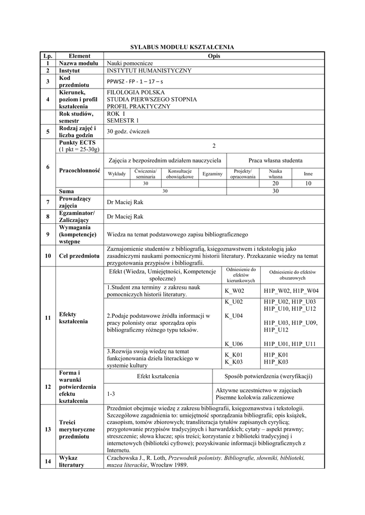 Lp. 1 2 3 4 5 Element Nazwa modułu Instytut Kod przedmiotu Kierunek, poziom i profil kształcenia Rok studiów, semestr Rodzaj zajęć i liczba godzin Punkty ECTS (1 pkt = 25-30g) SYLABUS MODUŁU KSZTAŁCENIA Opis Nauki pomocnicze INSTYTUT HUMANISTYCZNY PPWSZ - FP - 1 – 17 – s FILOLOGIA POLSKA STUDIA PIERWSZEGO STOPNIA PROFIL PRAKTYCZNY ROK I SEMESTR 1 30 godz. ćwiczeń 2 Zajęcia z bezpośrednim udziałem nauczyciela 6 7 8 9 Pracochłonność Suma Prowadzący zajęcia Egzaminator/ Zaliczający Wymagania (kompetencje) wstępne 10 Cel przedmiotu 11 Efekty kształcenia Wykłady Ćwiczenia/ seminaria 30 Konsultacje obowiązkowe 12 13 Treści merytoryczne przedmiotu 14 Wykaz literatury Projekty/ opracowania Nauka własna 20 30 30 Inne 10 Dr Maciej Rak Dr Maciej Rak Wiedza na temat podstawowego zapisu bibliograficznego Zaznajomienie studentów z bibliografią, księgoznawstwem i tekstologią jako zasadniczymi naukami pomocniczymi historii literatury. Przekazanie wiedzy na temat przygotowania przypisów i bibliografii. Odniesienie do Efekt (Wiedza, Umiejętności, Kompetencje Odniesienie do efektów efektów obszarowych społeczne) kierunkowych 1.Student zna terminy z zakresu nauk K_W02 H1P_W02, H1P_W04 pomocniczych historii literatury. K_U02 H1P_U02, H1P_U03 H1P_U10, H1P_U12 2.Podaje podstawowe źródła informacji w K_U04 pracy polonisty oraz sporządza opis H1P_U03, H1P_U09, bibliograficzny różnego typu teksów. H1P_U12 3.Rozwija swoją wiedzę na temat funkcjonowania dzieła literackiego w systemie kultury Forma i warunki potwierdzenia efektu kształcenia Egzaminy Praca własna studenta Efekt kształcenia 1-3 K_U06 H1P_U01, H1P_U11 K_K01 K_K03 H1P_K01 H1P_K03 Sposób potwierdzenia (weryfikacji) Aktywne uczestnictwo w zajęciach Pisemne kolokwia zaliczeniowe Przedmiot obejmuje wiedzę z zakresu bibliografii, księgoznawstwa i tekstologii. Szczegółowe zagadnienia to: umiejętność sporządzania bibliografii; opis książek, czasopism, tomów zbiorowych; transliteracja tytułów zapisanych cyrylicą; przygotowanie przypisów tradycyjnych i harwardzkich; cytaty – aspekt prawny; streszczenie; słowa klucze; spis treści; korzystanie z biblioteki tradycyjnej i internetowych (biblioteki cyfrowe); pozyskiwanie informacji bibliograficznych z Internetu. Czachowska J., R. Loth, Przewodnik polonisty. Bibliografie, słowniki, biblioteki, muzea literackie, Wrocław 1989. podstawowej 15 Wykaz literatury uzupełniającej (pomocniczej) Ptaszycki S., Encyklopedia nauk pomocniczych historii i literatury polskiej, Lublin 1921. Budzyk K., Studia z zakresu nauk pomocniczych i historii literatury polskiej, t. 1, Wrocław 1956. Dahl S., Dzieje książki, tł. E. Garbacik, T. Zapiór, H. Devechy, Wrocław- WarszawaKraków 1965. Korpała J., Krótka historia bibliografii polskiej, Wrocław 1986. Starnawski J., Warsztat bibliograficzny historyka literatur obcych, Warszawa 1988.