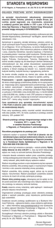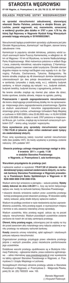 STAROSTA WĘGROWSKI 07-100 Węgrów, ul. Przemysłowa 5, tel. (25) 792 22 23, NIP 8241550901 OGŁASZA PRZETARG USTNY NIEOGRANICZONY na sprzedaż nieruchomości zabudowanej, stanowiącej własność Skarbu Państwa, położonej w obrębie Brzuza, gm. Łochów, powiat węgrowski, woj. mazowieckie, oznaczonej w ewidencji gruntów jako działka nr 3767 o pow. 4,78 ha, dla której Sąd Rejonowy w Węgrowie Wydział Ksiąg Wieczystych prowadzi księgę wieczystą nr SI1W/00053396/1. Nieruchomość będąca przedmiotem sprzedaży użytkowana jest jako Ośrodek Wypoczynkowy „Kamieńczyk” nad Bugiem, stanowi tereny zabudowane i inne. Kamieńczyk to popularny ośrodek letniskowy, położony wśród suchych sosnowych lasów Puszczy Kamienieckiej, w odległości ok. 40 km od Węgrowa i 10 km od Wyszkowa, na terenie Nadbużańskiego Parku Krajobrazowego. Wieś malowniczo położona w widłach Bugu i Liwca, znakomity mikroklimat, naturalne krajobrazy. Z Kamieńczyka prowadzą piesze i rowerowe szlaki turystyczne. Ośrodek stanowi dogodne miejsce na noclegi nad Bugiem oraz wypady m.in. do: Opinogóry, Pułtuska, Ciechanowca, Tykocina, Białegostoku. Na terenie ośrodka znajduje się 48 drewnianych domków letniskowych czteroosobowych (po dwa pokoje dwuosobowe) wyposażonych w sanitariaty (umywalka z ciepłą wodą, w.c.), oddzielny budynek sanitarny, w którym znajdują się natryski i w.c., budynek stołówki, budynek świetlicy, budynek biurowy z agregatownią, portiernia. Na terenie ośrodka znajduje się również plac zabaw dla dzieci, boisko sportowe, ścieżka zdrowia, miejsce na ognisko, parking. Przeznaczenie i sposób zagospodarowania nieruchomości: dla terenu obejmującego przedmiotową działkę nie ma opracowanego miejscowego planu zagospodarowania przestrzennego. Zgodnie ze studium uwarunkowań i kierunków zagospodarowania przestrzennego gminy Łochów, uchwalonego Uchwałami Rady Miejskiej w Łochowie nr IX/81/2003 z dnia 23.06.2003 roku i nr XLIII413/2006 z dnia 6.09.2006 roku, działka nr ewid. 3767 położona w miejscowości Brzuza, gm. Łochów, znajduje się na terenach oznaczonych symbolem CUT – tereny usług, turystyki i wypoczynku. Cena wywoławcza przy sprzedaży nieruchomości wynosi 1.706.170,00 zł (słownie: jeden milion siedemset sześć tysięcy sto siedemdziesiąt złotych). Przez cenę wywoławczą należy rozumieć wartość nieruchomości netto (bez podatku VAT). Do kwoty uzyskanej w przetargu zostanie naliczony 23% podatek VAT. Otwarcie przetargu ustnego nieograniczonego nastąpi w dniu 8 września 2011 r. o godz. 11.00 w siedzibie Starostwa Powiatowego w Węgrowie, ul. Przemysłowa 5, sala konferencyjna. Warunkiem przystąpienia do przetargu jest: • wpłacenie wadium w wysokości 170.617,00 zł (słownie: sto siedemdziesiąt tysięcy sześćset siedemnaście złotych), na rachunek bankowy Starostwa Powiatowego w Węgrowie prowadzony w Powiatowym Banku Spółdzielczym w Węgrowie nr 02 9236 0008 0000 0198 2000 0150. Wadium winno być wniesione w pieniądzu – walucie polskiej. Wpłaty należy dokonać do dnia 2.09.2011 r., liczy się termin faktycznego wpływu ww. kwoty na rachunek bankowy Starostwa Powiatowego; • okazanie dowodu wniesienia wadium przez uczestnika przetargu komisji przetargowej przed otwarciem przetargu. W dowodzie wpłaty należy wskazać, jakiej działki dotyczy wpłacone wadium. Wadium nie podlega zwrotowi w razie niestawienia się bez usprawiedliwienia uczestnika, który przetarg wygrał, w wyznaczonym miejscu i terminie w celu zawarcia notarialnej umowy sprzedaży. Wadium uczestnika, który przetarg wygrał, zalicza się na poczet nabycia nieruchomości. Wadium pozostałych uczestników zostanie zwrócone do trzech dni od daty zamknięcia przetargu. Oferent, który przetarg wygra, zobowiązany jest do wpłaty na trzy dni przed zawarciem aktu notarialnego ceny nabycia ustalonej w wyniku przetargu na wskazany rachunek bankowy. Koszty zawarcia umowy notarialnej, opłat sądowych i skarbowych pokrywa nabywca nieruchomości. Organizatorowi przetargu przysługuje prawo odwołania przetargu jedynie z ważnych powodów, przez niezwłoczne poinformowanie jego uczestników. Dodatkowe warunki przetargu opublikowane są w Biuletynie Informacji Publicznej – ogłoszenia lokalne, prasa codzienna ogólnokrajowa – adres internetowy www.powiatwegrowski.pl oraz wywieszone na tablicy ogłoszeń Starostwa Powiatowego w Węgrowie, ul. Przemysłowa 5 i Urzędu Miejskiego w Łochowie. Szczegółowych informacji odnośnie przetargu udziela w Starostwie Powiatowym w Węgrowie, ul. Przemysłowa 5 - Małgorzata Plewka, pokój 33, tel. (25) 7922223 wew. 105. Starosta Węgrowski (-) Krzysztof Fedorczyk