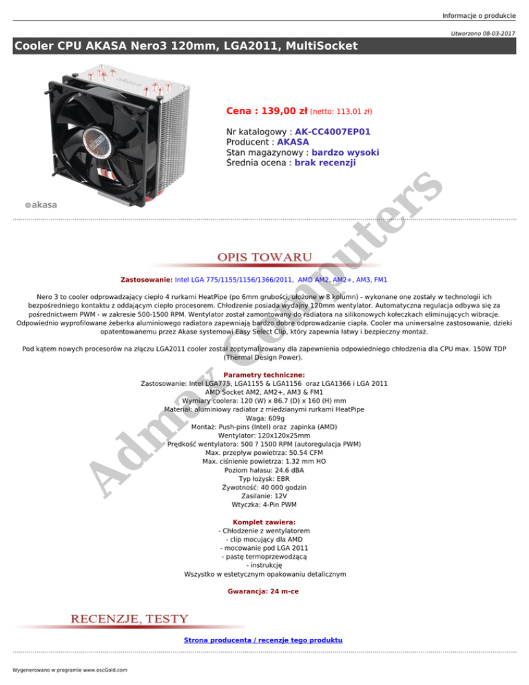 Informacje o produkcie Utworzono 08-03-2017 Cooler CPU AKASA Nero3 120mm, LGA2011, MultiSocket Cena : 139,00 zł (netto: 113,01 zł) pu te r s Nr katalogowy : AK-CC4007EP01 Producent : AKASA Stan magazynowy : bardzo wysoki Średnia ocena : brak recenzji Zastosowanie: Intel LGA 775/1155/1156/1366/2011, AMD AM2, AM2+, AM3, FM1 C om Nero 3 to cooler odprowadzający ciepło 4 rurkami HeatPipe (po 6mm grubości, ułożone w 8 kolumn) - wykonane one zostały w technologii ich bezpośredniego kontaktu z oddającym ciepło procesorem. Chłodzenie posiada wydajny 120mm wentylator. Automatyczna regulacja odbywa się za pośrednictwem PWM - w zakresie 500-1500 RPM. Wentylator został zamontowany do radiatora na silikonowych kołeczkach eliminujących wibracje. Odpowiednio wyprofilowane żeberka aluminiowego radiatora zapewniają bardzo dobre odprowadzanie ciapła. Cooler ma uniwersalne zastosowanie, dzieki opatentowanemu przez Akase systemowi Easy Select Clip, który zapewnia łatwy i bezpieczny montaż. Pod kątem nowych procesorów na złączu LGA2011 cooler został zoptymalizowany dla zapewnienia odpowiedniego chłodzenia dla CPU max. 150W TDP (Thermal Design Power). Ad m ax Parametry techniczne: Zastosowanie: Intel LGA775, LGA1155 & LGA1156 oraz LGA1366 i LGA 2011 AMD Socket AM2, AM2+, AM3 & FM1 Wymiary coolera: 120 (W) x 86.7 (D) x 160 (H) mm Materiał: aluminiowy radiator z miedzianymi rurkami HeatPipe Waga: 609g Montaż: Push-pins (Intel) oraz zapinka (AMD) Wentylator: 120x120x25mm Prędkość wentylatora: 500 ? 1500 RPM (autoregulacja PWM) Max. przepływ powietrza: 50.54 CFM Max. ciśnienie powietrza: 1.32 mm HO Poziom hałasu: 24.6 dBA Typ łożysk: EBR Żywotność: 40 000 godzin Zasilanie: 12V Wtyczka: 4-Pin PWM Komplet zawiera: - Chłodzenie z wentylatorem - clip mocujący dla AMD - mocowanie pod LGA 2011 - pastę termoprzewodzącą - instrukcję Wszystko w estetycznym opakowaniu detalicznym Gwarancja: 24 m-ce kod1006 kod1007 kod1008 kod1009 Strona producenta / recenzje tego produktu Wygenerowano w programie www.oscGold.com kod1010 kod1011 m ax Ad pu C om te r s