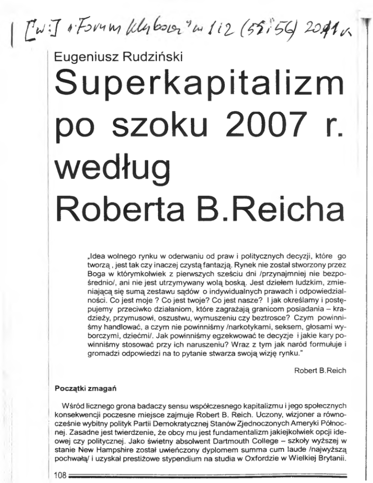; konsekwencji poczesne miejsce zajmuje Robert B. Reich. Uczony, wizjoner a równoi cześnie wybitny polityk Partii Demokratycznej Stanów Zjednoczonych Ameryki Północ