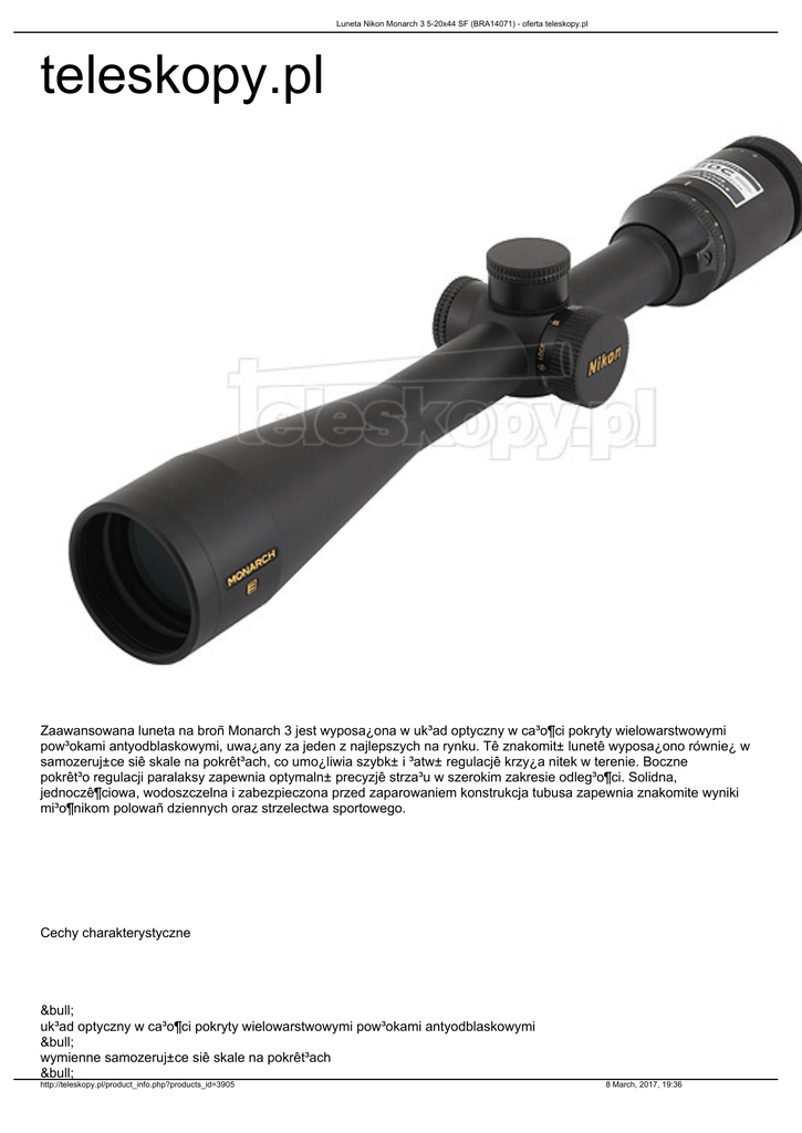 Luneta Nikon Monarch 3 5-20x44 SF (BRA14071) - oferta teleskopy.pl teleskopy.pl Zaawansowana luneta na broñ Monarch 3 jest wyposa¿ona w uk³ad optyczny w ca³o¶ci pokryty wielowarstwowymi pow³okami antyodblaskowymi, uwa¿any za jeden z najlepszych na rynku. Tê znakomit± lunetê wyposa¿ono równie¿ w samozeruj±ce siê skale na pokrêt³ach, co umo¿liwia szybk± i ³atw± regulacjê krzy¿a nitek w terenie. Boczne pokrêt³o regulacji paralaksy zapewnia optymaln± precyzjê strza³u w szerokim zakresie odleg³o¶ci. Solidna, jednoczê¶ciowa, wodoszczelna i zabezpieczona przed zaparowaniem konstrukcja tubusa zapewnia znakomite wyniki mi³o¶nikom polowañ dziennych oraz strzelectwa sportowego. Cechy charakterystyczne • uk³ad optyczny w ca³o¶ci pokryty wielowarstwowymi pow³okami antyodblaskowymi • wymienne samozeruj±ce siê skale na pokrêt³ach • http://teleskopy.pl/product_info.php?products_id=3905 8 March, 2017, 19:36 Luneta Nikon Monarch 3 5-20x44 SF (BRA14071) - oferta teleskopy.pl precyzyjna rêczna regulacja • okular z szybkim ustawianiem ostro¶ci krzy¿a nitek • du¿e, sta³e odsuniêcie ¼renicy wyj¶ciowej • zgrabne, wygodne pokrywki obiektywów • solidna, jednoczê¶ciowa konstrukcja tubusa • wodoszczelno¶æ i zabezpieczenie przed zaparowaniem Parametry techniczne • model: Nikon Monarch 3 5-20x44 BDC • powiêkszenie (x): 5-20x • ¶rednica obiektywu: 44 mm • krzy¿: BDC • ¼renica wyj¶ciowa: 2,2 mm (przy 20-krotnym powiêkszeniu) • odleg³o¶æ ¼renicy wyj¶ciowej: 101,691,4 mm • ¶rednica tubusa: 25,4 mm • ¶rednica tubusa obiektywu: 52 mm • zewnêtrzna ¶rednica okularu: 44 mm • jedno klikniêcie - 1/8 MOA • zakres regulacji (ró¿nica wysoko¶ci i poprawka na wiatr): 34 MOA • regulacja paralaksy: od 45,72 m do nieskoñczono¶ci • pole widzenia: 3,8° - 0,95° / 6,7 - 1,7 m / 100 m • d³ugo¶æ: 357 mm • masa: 540 g Gwarancja 30 lat http://teleskopy.pl/product_info.php?products_id=3905 8 March, 2017, 19:36