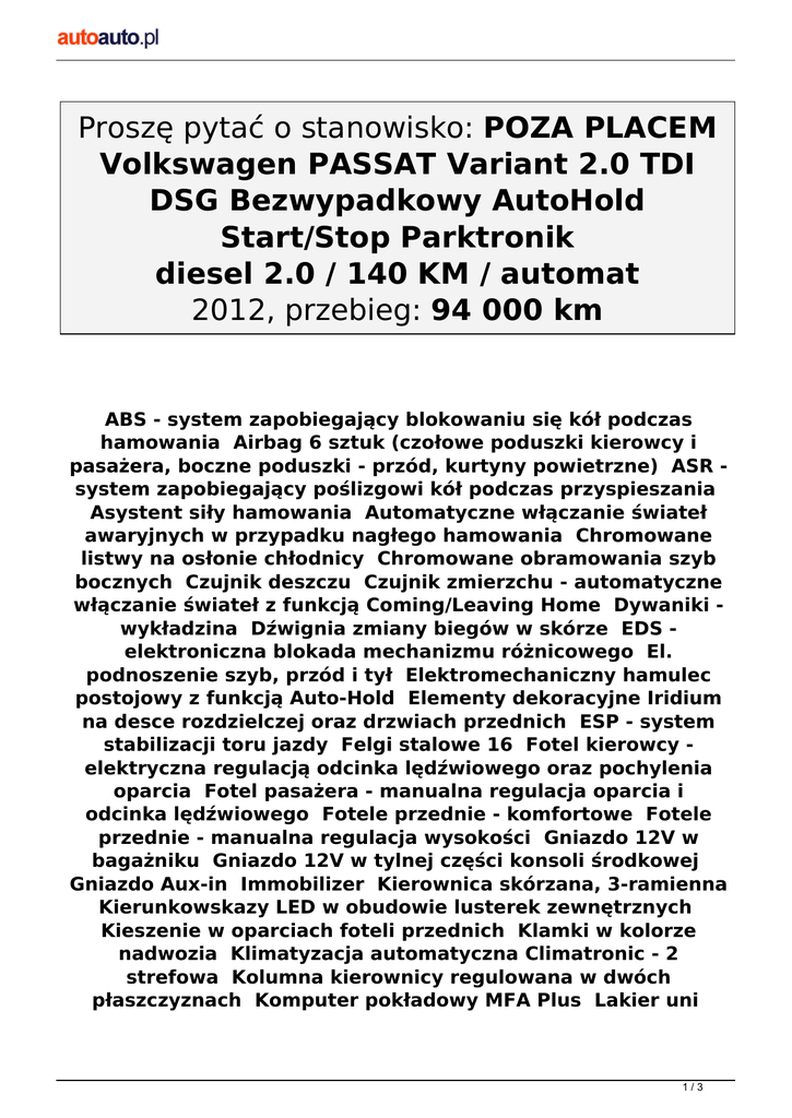 Proszę pytać o stanowisko: POZA PLACEM Volkswagen PASSAT Variant 2.0 TDI DSG Bezwypadkowy AutoHold Start/Stop Parktronik diesel 2.0 / 140 KM / automat 2012, przebieg: 94 000 km ABS - system zapobiegający blokowaniu się kół podczas hamowania Airbag 6 sztuk (czołowe poduszki kierowcy i pasażera, boczne poduszki - przód, kurtyny powietrzne) ASR system zapobiegający poślizgowi kół podczas przyspieszania Asystent siły hamowania Automatyczne włączanie świateł awaryjnych w przypadku nagłego hamowania Chromowane listwy na osłonie chłodnicy Chromowane obramowania szyb bocznych Czujnik deszczu Czujnik zmierzchu - automatyczne włączanie świateł z funkcją Coming/Leaving Home Dywaniki wykładzina Dźwignia zmiany biegów w skórze EDS elektroniczna blokada mechanizmu różnicowego El. podnoszenie szyb, przód i tył Elektromechaniczny hamulec postojowy z funkcją Auto-Hold Elementy dekoracyjne Iridium na desce rozdzielczej oraz drzwiach przednich ESP - system stabilizacji toru jazdy Felgi stalowe 16 Fotel kierowcy elektryczna regulacją odcinka lędźwiowego oraz pochylenia oparcia Fotel pasażera - manualna regulacja oparcia i odcinka lędźwiowego Fotele przednie - komfortowe Fotele przednie - manualna regulacja wysokości Gniazdo 12V w bagażniku Gniazdo 12V w tylnej części konsoli środkowej Gniazdo Aux-in Immobilizer Kierownica skórzana, 3-ramienna Kierunkowskazy LED w obudowie lusterek zewnętrznych Kieszenie w oparciach foteli przednich Klamki w kolorze nadwozia Klimatyzacja automatyczna Climatronic - 2 strefowa Kolumna kierownicy regulowana w dwóch płaszczyznach Komputer pokładowy MFA Plus Lakier uni 1/3 Lampki do czytania - przód/tył Listwy boczne - chromowane Lusterka boczne elektrycznie regulowane i ogrzewane Lusterka boczne w kolorze nadwozia Lusterka make-up w osłonach p/słonecznych, podświetlane Lusterko boczne po stronie kierowcy automatycznie przyciemniające się Lusterko wsteczne przyciemniające się automatycznie MSR- układ przeciwblokujący przy hamowaniu silnikiem Oparcie tylnej kanapy z podłokietnikiem i otworem na długie przedmioty Pasy bezpieczeństwa z przodu i z tyłu, 3-punktowe Pasy bezpieczeństwa z regulacją wysokości i napinaczami - przód Przedni podłokietnik ze schowkiem Radio RCD 310 CD/MP3 + 8 głośników Relingi dachowe - czarne Schowek w desce rozdzielczej po stronie pasażera, podświetlany, zamykany z funkcją chłodzenia Schowek w konsoli dachowej - zamykany Schowek w konsoli środkowej z przodu z 2 miejscami na napoje i gniazdem 12V Sygnalizacja niezapiętych pasów bezpieczeństwa, przód Sygnalizacja zmęczenia kierowcy sygnał dźwiękowy i wizualny na ekranie MFA System odblokowywania tylnej kanapy z bagażnika System odzyskiwania energii przy hamowaniu System stabilizacji toru jazdy przyczepy Szyby barwione Światła do jazdy dziennej Tapicerka materiałowa Matera Tempomat Tylna kanapa składana, dzielona Uchwyty ISOFIX do instalacji fotelika dziecięcego, tył Uchwyty na kubki - przód/tył Uchwyty na torby w bagażniku Wspomaganie układu kierowniczego, elektromechaniczne, progresywne - zależne od prędkości auta Wyłącznik poduszki powietrznej pasażera Zaczepy do mocowania bagażu w bagażniku Zamek centralny z pilotem Zderzaki w kolorze nadwozia ABS; ESP; centralny zamek; czujnik deszczu; czujniki cofania; el. lusterka; el.szyby; immobiliser; klimatyzacja; komputer; poduszka powietrzna; radio / CD; welurowa tapicerka; wspomaganie kierownicy; światła przeciwmgłowe; klimatronik bezwypadkowy; garażowany; pierwszy właściciel; serwisowany w ASO Cena: 54 900 PLN 2/3 brutto Opiekun: Michał Gnoza +48 602 453 700 Al. Krakowska 178, Punkt C 3/3