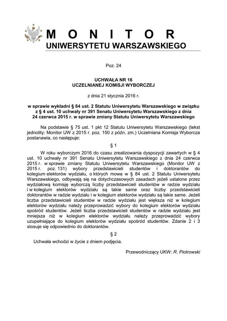 M O N I T O R UNIWERSYTETU WARSZAWSKIEGO Poz. 24 UCHWAŁA NR 16 UCZELNIANEJ KOMISJI WYBORCZEJ z dnia 21 stycznia 2016 r. w sprawie wykładni § 84 ust. 2 Statutu Uniwersytetu Warszawskiego w związku z § 4 ust. 10 uchwały nr 391 Senatu Uniwersytetu Warszawskiego z dnia 24 czerwca 2015 r. w sprawie zmiany Statutu Uniwersytetu Warszawskiego Na podstawie § 75 ust. 1 pkt 12 Statutu Uniwersytetu Warszawskiego (tekst jednolity: Monitor UW z 2015 r. poz. 150 z późn. zm.) Uczelniana Komisja Wyborcza postanawia, co następuje: §1 W roku wyborczym 2016 do czasu zrealizowania dyspozycji zawartych w § 4 ust. 10 uchwały nr 391 Senatu Uniwersytetu Warszawskiego z dnia 24 czerwca 2015 r. w sprawie zmiany Statutu Uniwersytetu Warszawskiego (Monitor UW z 2015 r. poz. 131) wybory przedstawicieli studentów i doktorantów do kolegium elektorów wydziału, o których mowa w § 84 ust. 2 Statutu Uniwersytetu Warszawskiego, odbywają się na dotychczasowych zasadach jeżeli ustalone przez wydziałową komisję wyborczą liczby przedstawicieli studentów w radzie wydziału i w kolegium elektorów wydziału są takie same oraz liczby przedstawicieli doktorantów w radzie wydziału i w kolegium elektorów wydziału są takie same. Jeżeli liczba przedstawicieli studentów w radzie wydziału jest większa niż w kolegium elektorów wydziału należy przeprowadzić wybory do kolegium elektorów wydziału spośród studentów. Jeżeli liczba przedstawicieli studentów w radzie wydziału jest mniejsza niż w kolegium elektorów wydziału należy przeprowadzić wybory uzupełniające do kolegium elektorów wydziału spośród studentów. Zdanie 2 i 3 stosuje się odpowiednio do doktorantów. §2 Uchwała wchodzi w życie z dniem podjęcia. Przewodniczący UKW: R. Piotrowski