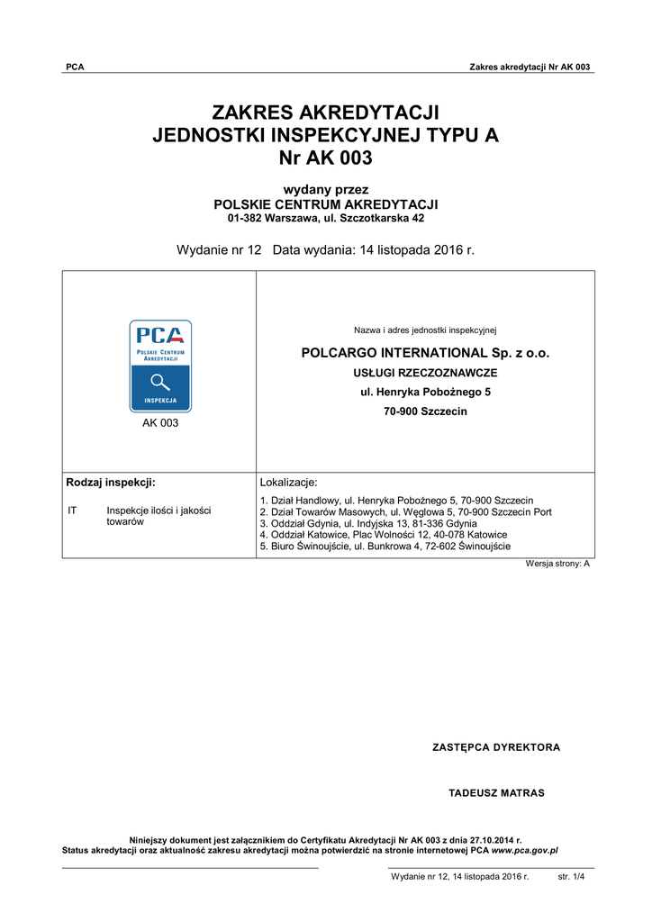 PCA Zakres akredytacji Nr AK 003 ZAKRES AKREDYTACJI JEDNOSTKI INSPEKCYJNEJ TYPU A Nr AK 003 wydany przez POLSKIE CENTRUM AKREDYTACJI 01-382 Warszawa, ul. Szczotkarska 42 Wydanie nr 12 Data wydania: 14 listopada 2016 r. Nazwa i adres jednostki inspekcyjnej POLCARGO INTERNATIONAL Sp. z o.o. USŁUGI RZECZOZNAWCZE ul. Henryka Pobożnego 5 70-900 Szczecin AK 003 Rodzaj inspekcji: IT Inspekcje ilości i jakości towarów Lokalizacje: 1. Dział Handlowy, ul. Henryka Pobożnego 5, 70-900 Szczecin 2. Dział Towarów Masowych, ul. Węglowa 5, 70-900 Szczecin Port 3. Oddział Gdynia, ul. Indyjska 13, 81-336 Gdynia 4. Oddział Katowice, Plac Wolności 12, 40-078 Katowice 5. Biuro Świnoujście, ul. Bunkrowa 4, 72-602 Świnoujście Wersja strony: A ZASTĘPCA DYREKTORA TADEUSZ MATRAS Niniejszy dokument jest załącznikiem do Certyfikatu Akredytacji Nr AK 003 z dnia 27.10.2014 r. Status akredytacji oraz aktualność zakresu akredytacji można potwierdzić na stronie internetowej PCA www.pca.gov.pl Wydanie nr 12, 14 listopada 2016 r. str. 1/4 PCA Zakres akredytacji Nr AK 003 Dział Handlowy, ul. Henryka Pobożnego 5, 70-900 Szczecin Biuro Świnoujście, ul. Bunkrowa 4, 72-602 Świnoujście Symbol inspekcji Rodzaj inspekcji Dziedzina inspekcji Metody i procedury inspekcji IT.1 Inspekcje ilości i jakości towarów Zboża PT-03, wyd. nr 2 z dnia 15.10.2009 Pasze i zboża – Pobieranie próbek, kontrola jakości i ilości IT.2 Inspekcje ilości i jakości towarów Pasze, śruty roślin oleistych PT-03, wyd. nr 2 z dnia 15.10.2009 Pasze i zboża – Pobieranie próbek, kontrola jakości i ilości Dział Towarów Masowych, ul. Węglowa 5, 70-900 Szczecin Port Oddział Gdynia, ul. Indyjska 13, 81-336 Gdynia Biuro Świnoujście, ul. Bunkrowa 4, 72-602 Świnoujście Symbol inspekcji IT.4 Rodzaj inspekcji Inspekcje ilości i jakości towarów Dziedzina inspekcji Metody i procedury inspekcji Paliwa stałe (węgiel kamienny, koks) PT-05, wyd. nr 4 z 12.05.2015 Węgiel i koks – Pobieranie próbek, kontrola jakości i ilości (z wył. pkt. 4.2.2.1; 4.4; 4.6.2) PN-ISO 13909-2:2004 Węgiel kamienny i koks -Mechaniczne pobieranie próbek -Część 2: Węgiel -- Pobieranie próbek ze strug materiału PN-ISO 18283:2008 Węgiel kamienny i koks -- Ręczne pobieranie próbek PN-G-04502:2014-11 Węgiel kamienny i brunatny -Pobieranie i przygotowanie próbek do badań laboratoryjnych -- Metody podstawowe PN-C-06301:1998 Koks i półkoks z węgla kamiennego -- Pobieranie i przygotowanie próbek PN-ISO 1953:1999 Węgiel kamienny -- Analiza ziarnowa metodą przesiewania PN-ISO 728:1999 Koks z węgla kamiennego (nominalna wielkość ziarna większa niż 20 mm) -- Oznaczanie składu ziarnowego metodą analizy sitowej ISO 2325:1986 Coke -- Size analysis (normal top size 20 mm or less) Wersja strony: A Wydanie nr 12, 14 listopada 2016 r. str. 2/4 PCA Zakres akredytacji Nr AK 003 Oddział Katowice, Plac Wolności 12, 40-078 Katowice Symbol inspekcji IT.4 Rodzaj inspekcji Inspekcje ilości i jakości towarów Dziedzina inspekcji Metody i procedury inspekcji Paliwa stałe (węgiel kamienny, koks) PT-05-K, wyd. nr 2 z dnia 15.01.2015 Węgiel kamienny – Pobieranie próbek i kontrola jakości (z wył. pkt. 4.4) PN-G-04502:2014-1 Węgiel kamienny i brunatny -Pobieranie i przygotowanie próbek do badań laboratoryjnych -- Metody podstawowe Dział Handlowy, ul. Henryka Pobożnego 5, 70-900 Szczecin Symbol inspekcji IT.6 Rodzaj inspekcji Inspekcje ilości i jakości towarów Dziedzina inspekcji Metody i procedury inspekcji Ciekłe produkty naftowe (benzyny, olej napędowy, olej opałowy, JET A-1) PT-08, wyd. 4 z 14.07.2014 Paliwa Płynne – Pobieranie próbek, kontrola jakości i ilości Wersja strony: A Wydanie nr 12, 14 listopada 2016 r. str. 3/4 PCA Zakres akredytacji Nr AK 003 Wykaz zmian Zakresu Akredytacji Nr AK 003 Status zmian: wersja pierwotna – A Zatwierdzam status zmian ZASTĘPCA DYREKTORA TADEUSZ MATRAS dnia: 14.11.2016 r. Wydanie nr 12, 14 listopada 2016 r. str. 4/4