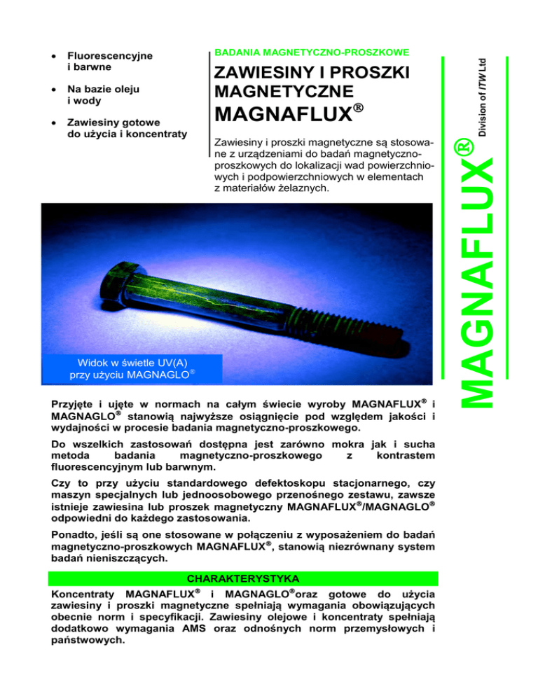 Na bazie oleju i wody Zawiesiny gotowe do użycia i koncentraty MAGNAFLUX Zawiesiny i proszki magnetyczne są stosowane z urządzeniami do badań magnetycznoproszkowych do lokalizacji wad powierzchniowych i podpowierzchniowych w elementach z materiałów żelaznych. Widok w świetle UV(A) przy użyciu MAGNAGLO Przyjęte i ujęte w normach na całym świecie wyroby MAGNAFLUX i MAGNAGLO stanowią najwyższe osiągnięcie pod względem jakości i wydajności w procesie badania magnetyczno-proszkowego. Do wszelkich zastosowań dostępna jest zarówno mokra jak i sucha metoda badania magnetyczno-proszkowego z kontrastem fluorescencyjnym lub barwnym. Czy to przy użyciu standardowego defektoskopu stacjonarnego, czy maszyn specjalnych lub jednoosobowego przenośnego zestawu, zawsze istnieje zawiesina lub proszek magnetyczny MAGNAFLUX/MAGNAGLO odpowiedni do każdego zastosowania. Ponadto, jeśli są one stosowane w połączeniu z wyposażeniem do badań magnetyczno-proszkowych MAGNAFLUX, stanowią niezrównany system badań nieniszczących. CHARAKTERYSTYKA Koncentraty MAGNAFLUX i MAGNAGLOoraz gotowe do użycia zawiesiny i proszki magnetyczne spełniają wymagania obowiązujących obecnie norm i specyfikacji. Zawiesiny olejowe i koncentraty spełniają dodatkowo wymagania AMS oraz odnośnych norm przemysłowych i państwowych. Division of ITW Ltd • ZAWIESINY I PROSZKI MAGNETYCZNE MAGNAFLUX • BADANIA MAGNETYCZNO-PROSZKOWE Fluorescencyjne i barwne • KONCENTRATY ZAWIESIN FLUORESCENCYJNYCH MAGNAGLO MAGNAGLO 14A - opakowania 1 kg, 5 kg Może tworzyć zawiesiny w oleju lub wodzie, w której rozpuszczony został proszek Magnaflux WA 2B lub WA 4E. MAGNAGLO WB 12 - opakowania 500 ml Ciekły koncentrat Magnaglo 14A wymieszany z uzdatniaczami wodnymi i inhibitorami korozji. Magnaglo WB 12 nie zawiera azotanów. MAGNAGLO MG410 - opakowania 1 kg Ultrajaskrawy materiał Magnaglo tworzący zawiesiny olejowe i wodne, w których rozpuszczone został Magnaflux WA2B lub WA4E. STĘŻENIE 14A WA2B WA4E W OLEJU 1,25 g/l - W WODZIE 1,25 g/l 10 g/l 1 % v/v WIELKOŚĆ CZĄSTEK 7 - 9 μm WB12 - 500 ml daje 25 l 7 - 9 μm MG410 WA2B WA4E 1,0-1,5 g/l - 1,0 - 1,5 g/l 10 g/l 1 % v/v 8 - 12 μm ZAWIESINY GOTOWE DO UŻYCIA MAGNAGLO 14HF - aerozol 400 ml oraz 4 x 5 l., 25 l. Gotowa do użycia zawiesina zawierająca Magnaglo 14A w wysokozapalnym nośniku Carrier II o słabym zapachu. MAGNAGLO 410HF - aerozol 400 ml oraz 25 l. Gotowa do użycia zawiesina zawierająca Magnaglo MG 410HF w wysokozapalnym nośniku Carrier II o słabym zapachu. MAGNAFLUX 7HF - aerozol 400 ml oraz 4 x 5 l. Gotowa do użycia zawiesina zawierająca Magnaflux 7C w wysokozapalnym nośniku Carrier II o słabym zapachu. TEMP. ZAPŁ. (PMCC) min. 93°C LEPKOŚĆ w 21°C 3,45 cS GĘSTOŚĆ 0,81 WIELKOŚĆ CZĄSTEK 7 - 9 μm OBJĘTOŚĆ OSADZANIA 0,1 - 0,35 ml min. 93°C 3,45 cS 0.81 8 - 12 μm 0,1 - 0,35 ml min. 93°C 3,45 cS 0.81 2 - 6 μm 1,5 - 2,4 ml KONCENTRATY ZAWIESIN CZARNYCH MAGNAFLUX WB27 BLACK - opakowania 1 litr Zrównoważona mieszanka Magnaflux 7C z Magnaflux WA2B stanowiąca koncentrat wodny do bezpośredniego rozpuszczania w wodzie na czarną zawiesinę magnetyczną. 27B - 2 - 6 μm 20ml/l UZDATNIACZE WODY MAGNAFLUX WA4E - opakowania 5 l. Ciekły uzdatniacz wody bardzo skutecznie wspomagający tworzenie zawiesiny cząstek Magnaflux lub Magnaglo, zwilża powierzchnie i chroni je przed korozją podczas badania. Magnaflux WA4E pozostawia lekką ochronę antykorozyjną także po badaniu. WA4E 1 % v/v CIEKŁY NOŚNIK TEMP. ZAPŁONU (PMCC) MAGNAFLUX CARRIER II - opakowania 25 l., 200 l. Mieszanka destylatów węglowodorowych przeznaczona do tworzenia zawiesin cząstek magnetycznych. Zapewnia dobrą ruchliwość cząstek i skutecznie wspomaga tworzenia zawiesiny. min. 93°C FARBA KONTRASTOWA-PODKŁADOWA TEMP. ZAPŁONU (PMCC) MAGNAFLUX WCP2 - aerozol 400 ml, 4 x 5 l. Szybkoschnąca biała farba kontrastowa do nakładania w postaci cienkiej powłoki przed badaniem, w którym wymagany jest zwiększony kontrast. < 0°C PROSZKI MAGNETYCZNE DO METODY SUCHEJ - opakowania 1 kg Suche proszki Magnaflux są dostępne w różnych kolorach, dając dobry kontrast na różnorodnych powierzchniach. W przypadku słabego kontrastu można przed badaniem nałożyć cienką warstwę WCP2. MAGNAFLUX® WYRÓB 1Grey 3A Black 8A Red BARWA szara czarna czerwona WIELK. CZĄSTEK 1 - 150 μm 1 - 150 μm 1 - 150 μm ZAKRES TEMP. 0 - 315°C 0 - 230°C 0 - 175°C A Division of ITW Ltd. Faraday Road, South Dorcan Industrial Estate,Swindon SN3 5HE, Wiltshire. U.K. Email [email protected] NDT System, 01-643 WARSZAWA, ul. Twardowskiego 21, tel. 022 8325030, fax. 022 8339677, e-mail: [email protected], www.ndt-system.com.pl