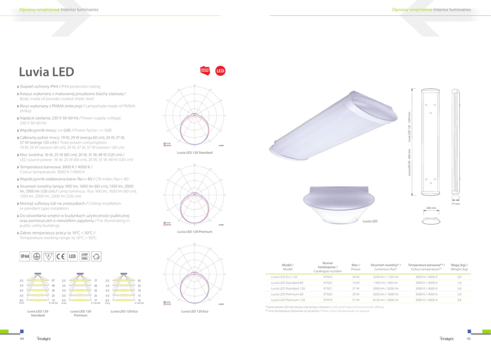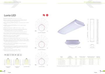 Oprawy wnętrzowe Interior luminaires Oprawy wnętrzowe Interior luminaires Luvia LED Stopień ochrony IP44 / IP44 protection rating Korpus wykonany z malowanej proszkowo blachy stalowej / Body made of powder coated sheet steel Luvia LED 120 - 1293 mm Klosz wykonany z PMMA (mleczny) / Lampshade made of PMMA (milky) Napięcie zasilania: 230 V 50-60 Hz / Power supply voltage: 230 V 50-60 Hz Współczynnik mocy: >= 0,85 / Power factor: >= 0,85 Luvia LED 60 - 683 mm Całkowity pobór mocy: 19 W, 29 W (wersja 60 cm), 24 W, 37 W, 57 W (wersja 120 cm) / Total power consumption: 19 W, 29 W (version 60 cm), 24 W, 37 W, 57 W (version 120 cm) Luvia LED 120 Standard Moc świetlna: 16 W, 25 W (60 cm), 20 W, 31 W, 49 W (120 cm) / LED source power: 16 W, 25 W (60 cm), 20 W, 31 W, 49 W (120 cm) Temperatura barwowa: 3000 K / 4000 K / Colour temperature: 3000 K / 4000 K Współczynnik oddawania barw: Ra>= 80 / CRI index: Ra>= 80 Strumień świetlny lampy: 900 lm, 1600 lm (60 cm), 1350 lm, 2000 lm, 3300 lm (120 cm) / Lamp luminous flux: 900 lm, 1600 lm (60 cm), 1350 lm, 2000 lm, 3300 lm (120 cm) Montaż sufitowy lub na zwieszakach / Ceiling installation or pendant type instalation 77 mm 208 mm Do oświetlania wnętrz w budynkach użyteczności publicznej oraz pomieszczeń o niewielkim zapyleniu / For illuminating in public utility buildings Luvia LED Luvia LED 120 Premium Zakres temperatury pracy: ta 10°C ÷ 50°C / Temperature working range: ta 10°C ÷ 50°C IP44 LED 230V 50Hz Model / Model 67 2.5 77 2.5 45 2.5 3.0 48 3.0 55 3.0 32 4.0 29 4.0 33 4.0 19 5.0 20 5.0 23 5.0 6.0 15 6.0 17 6.0 E max [lx] H [m] Luvia LED 120 Standard 44 E max [lx] H [m] Luvia LED 120 Premium H [m] Moc / Power Strumień świetlny* / Luminous flux* Temperatura barwowa** / Colour temperature** Waga (kg) / Weight (kg) Luvia LED Eco 120 97923 24 W 2500 lm / 1350 lm 3000 K / 4000 K 3,0 Luvia LED Standard 60 97922 19 W 1950 lm / 900 lm 3000 K / 4000 K 1,6 Luvia LED Standard 120 97921 37 W 3900 lm / 2000 lm 3000 K / 4000 K 3,0 13 Luvia LED Premium 60 97920 29 W 3050 lm / 1600 lm 3000 K / 4000 K 2,0 10 Luvia LED Premium 120 97919 57 W 6150 lm / 3000 lm 3000 K / 4000 K 3,8 E max [lx] Luvia LED 120 Eco Numer katalogowy / Catalogue number Luvia LED 120 Eco * Dane panela LED bez klosza oraz lampy z kloszem / LED panel data without and with diffuser ** Inne temperatury barwowe na życzenie / Other colour temperatures on request 45