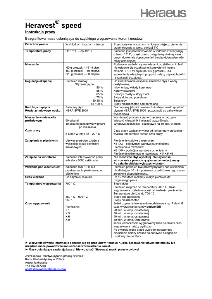 ® Heravest speed Instrukcja pracy Bezgrafitowa masa osłaniająca do szybkiego wygrzewania koron i mostów. Przechowywanie W chłodnym i suchym miejscu Temperatura pracy Od 15° C – do 19° C Mieszanie 60 g proszek – 15 ml płyn 160 g proszek – 40 ml płyn 320 g proszek – 80 ml płyn Regulacja ekspansji Pierścień stalowy Stężenie płynu: 50 % 55 % 65 % 75 % 80-85 % 85-100 % Redukcja napięcia Powierzchniowego wosku Mieszanie w mieszadle próżniowym Zalecany płyn: HERA SWE 2000 90 sekund 10 sekund pozostawić w próżni po mieszaniu Czas pracy 5-6 min w temp 18 – 22 ° C Zatapianie w pierścieniu Używać pierścieni z taśmą wyścielającą lub pierścieni silikonowych Zatapiać na wibratorze Zalecana intensywność pracy wibratora 6000 cykli / min. Wiązanie pod ciścnieniem Czas wiązania Zalecane max 10 minut przetrzymania pierścienia pod ciśnieniem Co najmniej 15 minut Temperatura wygrzewania 700 ° C 850 ° C – 900 ° C 950 ° Czas wygrzewania Pierścienie: X1 X3 X6 X9 Przechowywać w suchym i chłonym miejscu, płynu nie przechowywać w temp. poniżej 5°C Zalecane jest przechowywanie w lodówce z wentylacją o temp. 17° C, dzięki czemu osiągniemy dłuższy czas pracy, doskonałe dopasowanie i bardzo dobrą płynność masy osłaniającej Podawane wartości są wartościami przybliżonymi. Jeśli nie osiągnie się oczekiwanej konsystencji można zmienić 1,5 ml płynu na 160 g proszku. Dla zapewnienia właściwych proporcji należy używać butelki i strzykawki dozującej. Do zredukowania ekspansji zmieszać płyn z wodą destylowaną Inlay, onlay, wkłady koronowe Korony stożkowe Korony i mosty – stopy złota Stopy złota pod porcelanę Teleskopy Stopy nieszlachetne pod porcelanę Dla poprawy jakości powierzchni odlewu wosk spryskać płynem HERA SWE 2000 i pozostawić do całkowitego wyschnięcia Wymieszać proszek z płynem ręcznie w naczyniu Włączyć mieszalnik i mieszać przez 90 sek., Wyłączyć mieszalnik i pozostawić na 10 sek. w próżni Czas pracy uzależniony jest od temperatury otoczenia – wyższa temperatura skraca czas pracy Pierścienie stalowe o rozmiarze: X1 i X3 – pojedyncza warstwa suchej taśmy Pierścienie o rozmiarze: X6 i X9 – podwójna warstwa suchej taśmy Pierścienie silikonowe o rozmiarze: X1/ X3/ X6 Nie stosować zbyt wysokiej intensywności wibrowania z powodu ryzyka sedymentacji masy. Po zalaniu obiektu wyłączyć wibrator. Pierścień powinien być przetrzymywany pod ciśnieniem nie dłużej jak 10 min. ponieważ przedłużenie tego czasu zredukuje ekspansję masy. Po 15 minutach możemy włożyć pierścień do rozgrzanego pieca Stopy złota Pierścień rozgrzać do temperatury 900 ° C. Czas wygrzewania uzależniony jest od wielkości pierścienia. Temperaturę obniżyć do 700 ° C Stopy pod porcelanę Stopy nieszlachetne Jeżeli używamy tworzyw do modelowania np. Palavit G czas wygrzewania należy podwoić!!! 20 min. w temp. ostatecznej 30 min. w temp. ostatecznej 40 min. w temp. ostatecznej 50 min. w temp. Ostatecznej Jeżeli jednocześnie wygrzewamy kilka pierścieni czas wygrzewania należy wydłużyć. Po otwarciu pieca przed wyjęciem następnego pierścienia należy czekać na ponowne osiągnięcie ustalonej temperatury. ► Wszystkie zawarte informacje odnoszą się do produktów Heraeus Kulzer. Stosowanie innych materiałów lub urządzeń może powodować konieczność wprowadzenia korekt. ► Masy osłaniające zawierają kwarc! Nie wdychać! Stosować maski przeciwpyłowe! Jeżeli macie Państwo pytania proszę dzwonić : Konsultant medyczny w Polsce: Agata Jankowska +48 602 267218 [email protected]