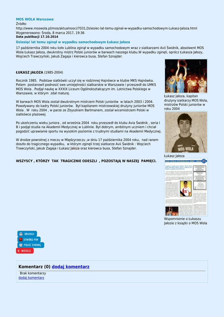 MOS WOLA Warszawa Źródło: http://www.moswola.pl/mos/aktualnosci/7031,Dziesiec-lat-temu-zginal-w-wypadku-samochodowym-Lukasz-Jaloza.html Wygenerowano: Środa, 8 marca 2017, 19:36 Data publikacji 17.10.2014 Dziesięć lat temu zginął w wypadku samochodowym Łukasz Jałoza 17 października 2004 roku koło Lublina zginął w wypadku samochodowym wraz z siatkarzami Avii Świdnik, absolwent MOS Wola Łukasz Jałoza, dwukrotny mistrz Polski juniorów w barwach naszego klubu.W wypadku zginęli, oprócz Łukasza Jałozy, Wojciech Trawczyński, Jakub Zagaja i kierowca busa, Stefan Sznajder. ŁUKASZ JAŁOZA (1985-2004) Rocznik 1985. Podstaw siatkówki uczył się w rodzinnej Hajnówce w klubie MKS Hajnówka. Potem postanowił podnosić swe umiejętności siatkarskie w Warszawie i przeszedł do UMKS MOS Wola . Podjął naukę w XXXIX Liceum Ogólnokształcącym im. Lotnictwa Polskiego w Warszawie, w którym zdał maturę. W barwach MOS Wola został dwukrotnym mistrzem Polski juniorów w latach 2003 i 2004. Powoływany do kadry Polski juniorów. Był kapitanem mistrzowskiej drużyny juniorów MOS Wola . W roku 2004 , w parze ze Zbyszkiem Bartmanem, został wicemistrzem Polski w siatkówce plażowej. Łukasz Jałoza, kapitan drużyny siatkarzy MOS Wola, mistrzów Polski juniorów w roku 2004 Po ukończeniu wieku juniora , od września 2004 roku przeszedł do klubu Avia Świdnik , seria I B i podjął studia na Akademii Medycznej w Lublinie. Był dobrym, ambitnym uczniem i chciał pogodzić uprawianie sportu na wysokim poziomie z trudnymi studiami na Akademii Medycznej. W drodze powrotnej z meczu w Międzyrzeczu ,w dniu 17 października 2004 roku, nad ranem doszło do tragicznego wypadku, w którym zginęli trzej siatkarze Avii Świdnik : Wojciech Trawczyński, Jakub Zagaja i Łukasz Jałoza oraz kierowca busa, Stefan Sznajder. Łukasz Jałoza WSZYSCY , KTÓRZY TAK TRAGICZNIE ODESZLI , POZOSTAJĄ W NASZEJ PAMIĘCI. Wspomnienie o Łukaszu Jałozie z książki o MOS Wola Komentarz (0) dodaj komentarz Brak komentarzy dodaj komentarz