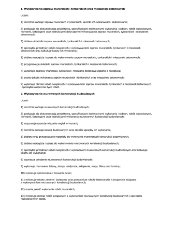 1. Wykonywanie zapraw murarskich i tynkarskich oraz mieszanek betonowych Uczeń: 1) rozróżnia rodzaje zapraw murarskich i tynkarskich, określa ich właściwości i zastosowanie; 2) posługuje się dokumentacją projektową, specyfikacjami technicznymi wykonania i odbioru robót budowlanych, normami, katalogami oraz instrukcjami dotyczącymi wykonywania zapraw murarskich, tynkarskich i mieszanek betonowych; 3) dobiera składniki zapraw murarskich, tynkarskich i mieszanek betonowych; 4) sporządza przedmiar robót związanych z wykonywaniem zapraw murarskich, tynkarskich i mieszanek betonowych oraz kalkuluje koszty ich wykonania; 5) dobiera narzędzia i sprzęt do wykonywania zapraw murarskich, tynkarskich i mieszanek betonowych; 6) przygotowuje składniki zapraw murarskich, tynkarskich i mieszanek betonowych; 7) wykonuje zaprawy murarskie, tynkarskie i mieszanki betonowe zgodnie z recepturą; 8) ocenia jakość wykonania zapraw murarskich i tynkarskich oraz mieszanek betonowych; 9) wykonuje obmiar robót związanych z wykonywaniem zapraw murarskich, tynkarskich i mieszanek betonowych i sporządza rozliczenie tych robót. 2. Wykonywanie murowanych konstrukcji budowlanych Uczeń: 1) rozróżnia rodzaje murowanych konstrukcji budowlanych; 2) posługuje się dokumentacją projektową, specyfikacjami technicznymi wykonania i odbioru robót budowlanych, normami, katalogami oraz instrukcjami wykonania murowanych konstrukcji budowlanych; 3) rozpoznaje sposoby wiązania cegieł w murach; 4) rozróżnia rodzaje izolacji budowlanych oraz określa sposoby ich wykonania; 5) dobiera oraz przygotowuje materiały do wykonania murowanych konstrukcji budowlanych; 6) dobiera narzędzia i sprzęt do wykonywania murowanych konstrukcji budowlanych; 7) sporządza przedmiar robót związanych z wykonaniem murowanych konstrukcji budowlanych oraz kalkuluje koszty ich wykonania; 8) wyznacza położenie murowanych konstrukcji budowlanych; 9) wykonuje murowane ściany, stropy, nadproża, sklepienia, słupy, filary oraz kominy; 10) wykonuje spoinowanie i licowanie ścian; 11) wykonuje roboty ziemne i izolacyjne oraz pomocnicze roboty betoniarskie i zbrojarskie związane z wykonywaniem murowanych konstrukcji budowlanych; 12) ocenia jakość wykonania robót murarskich; 13) wykonuje obmiar robót związanych z wykonaniem murowanych konstrukcji budowlanych i sporządza rozliczenie tych robót. 3. Wykonywanie tynków Uczeń: 1) rozróżnia rodzaje tynków; 2) posługuje się dokumentacją projektową, specyfikacjami technicznymi wykonania i odbioru robót budowlanych, normami, katalogami oraz instrukcjami wykonania tynków; 3) dobiera oraz przygotowuje materiały do wykonywania tynków wewnętrznych i zewnętrznych; 4) dobiera narzędzia i sprzęt do wykonania tynków wewnętrznych i zewnętrznych; 5) sporządza przedmiar robót związanych z wykonaniem tynków wewnętrznych i zewnętrznych oraz kalkuluje koszty ich wykonania; 6) przygotowuje podłoże do wykonania tynków wewnętrznych i zewnętrznych; 7) wykonuje tynki wewnętrzne i zewnętrzne; 8) wykonuje czynności związane z wykańczaniem powierzchni tynkowanych oraz osadzaniem kratek wentylacyjnych i innych elementów; 9) rozpoznaje rodzaje uszkodzeń tynków wewnętrznych i zewnętrznych oraz dobiera sposoby ich naprawy; 10) wykonuje naprawę tynków wewnętrznych i zewnętrznych; 11) ocenia jakość wykonania robót tynkarskich; 12) wykonuje obmiar związanych z wykonaniem tynków wewnętrznych i zewnętrznych i sporządza rozliczenie tych robót. 4. Wykonywanie remontów oraz rozbiórki murowanych konstrukcji budowlanych Uczeń: 1) posługuje się dokumentacją projektową, specyfikacjami technicznymi wykonania i odbioru robót budowlanych, normami, katalogami oraz instrukcjami wykonania robót remontowych i rozbiórkowych murowanych konstrukcji budowlanych; 2) dobiera oraz przygotowuje materiały budowlane do wykonywania remontu murowanych konstrukcji budowlanych; 3) sporządza przedmiar robót związanych z wykonaniem remontu i rozbiórki murowanych konstrukcji budowlanych oraz kalkuluje koszty ich wykonania; 4) dobiera narzędzia i sprzęt do wykonywania robót związanych z remontem oraz rozbiórką murowanych konstrukcji budowlanych; 5) wykonuje roboty murarskie związane z remontami murowanych konstrukcji budowlanych; 6) wykonuje roboty rozbiórkowe murowanych konstrukcji budowlanych; 7) ocenia jakość wykonania robót remontowych i rozbiórkowych murowanych konstrukcji budowlanych; 8) wykonuje obmiar robót związanych z wykonywaniem remontu i rozbiórki murowanych konstrukcji budowlanych i sporządza rozliczenie tych robót.