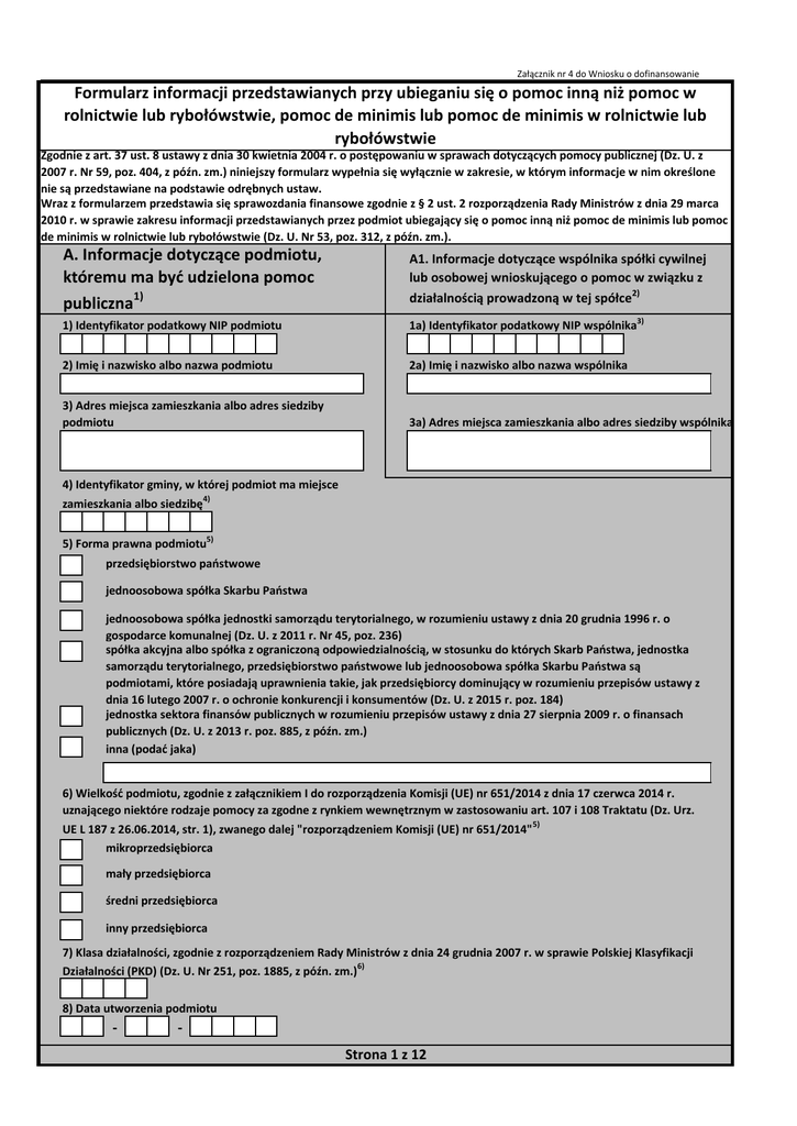 Załącznik nr 4 do Wniosku o dofinansowanie Formularz informacji przedstawianych przy ubieganiu się o pomoc inną niż pomoc w rolnictwie lub rybołówstwie, pomoc de minimis lub pomoc de minimis w rolnictwie lub rybołówstwie Zgodnie z art. 37 ust. 8 ustawy z dnia 30 kwietnia 2004 r. o postępowaniu w sprawach dotyczących pomocy publicznej (Dz. U. z 2007 r. Nr 59, poz. 404, z późn. zm.) niniejszy formularz wypełnia się wyłącznie w zakresie, w którym informacje w nim określone nie są przedstawiane na podstawie odrębnych ustaw. Wraz z formularzem przedstawia się sprawozdania finansowe zgodnie z § 2 ust. 2 rozporządzenia Rady Ministrów z dnia 29 marca 2010 r. w sprawie zakresu informacji przedstawianych przez podmiot ubiegający się o pomoc inną niż pomoc de minimis lub pomoc de minimis w rolnictwie lub rybołówstwie (Dz. U. Nr 53, poz. 312, z późn. zm.). A. Informacje dotyczące podmiotu, któremu ma być udzielona pomoc publiczna1) A1. Informacje dotyczące wspólnika spółki cywilnej lub osobowej wnioskującego o pomoc w związku z działalnością prowadzoną w tej spółce2) 1) Identyfikator podatkowy NIP podmiotu 1a) Identyfikator podatkowy NIP wspólnika3) 2) Imię i nazwisko albo nazwa podmiotu 2a) Imię i nazwisko albo nazwa wspólnika 3) Adres miejsca zamieszkania albo adres siedziby podmiotu 3a) Adres miejsca zamieszkania albo adres siedziby wspólnika 4) Identyfikator gminy, w której podmiot ma miejsce zamieszkania albo siedzibę4) 5) Forma prawna podmiotu5) przedsiębiorstwo państwowe jednoosobowa spółka Skarbu Państwa jednoosobowa spółka jednostki samorządu terytorialnego, w rozumieniu ustawy z dnia 20 grudnia 1996 r. o gospodarce komunalnej (Dz. U. z 2011 r. Nr 45, poz. 236) spółka akcyjna albo spółka z ograniczoną odpowiedzialnością, w stosunku do których Skarb Państwa, jednostka samorządu terytorialnego, przedsiębiorstwo państwowe lub jednoosobowa spółka Skarbu Państwa są podmiotami, które posiadają uprawnienia takie, jak przedsiębiorcy dominujący w rozumieniu przepisów ustawy z dnia 16 lutego 2007 r. o ochronie konkurencji i konsumentów (Dz. U. z 2015 r. poz. 184) jednostka sektora finansów publicznych w rozumieniu przepisów ustawy z dnia 27 sierpnia 2009 r. o finansach publicznych (Dz. U. z 2013 r. poz. 885, z późn. zm.) inna (podać jaka) 6) Wielkość podmiotu, zgodnie z załącznikiem I do rozporządzenia Komisji (UE) nr 651/2014 z dnia 17 czerwca 2014 r. uznającego niektóre rodzaje pomocy za zgodne z rynkiem wewnętrznym w zastosowaniu art. 107 i 108 Traktatu (Dz. Urz. UE L 187 z 26.06.2014, str. 1), zwanego dalej "rozporządzeniem Komisji (UE) nr 651/2014"5) mikroprzedsiębiorca mały przedsiębiorca średni przedsiębiorca inny przedsiębiorca 7) Klasa działalności, zgodnie z rozporządzeniem Rady Ministrów z dnia 24 grudnia 2007 r. w sprawie Polskiej Klasyfikacji Działalności (PKD) (Dz. U. Nr 251, poz. 1885, z późn. zm.)6) 8) Data utworzenia podmiotu - Strona 1 z 12 9) Powiązania z innymi przedsiębiorcami Czy pomiędzy podmiotem a innymi przedsiębiorcami istnieją powiązania polegające na tym, że: a) jeden przedsiębiorca posiada w drugim większość praw głosu? tak nie b) jeden przedsiębiorca ma prawo powołać lub odwołać większość członków organu zarządzającego lub nadzorującego innego przedsiębiorcy? tak nie c) jeden przedsiębiorca ma prawo wywierać dominujący wpływ na innego przedsiębiorcę zgodnie z umową zawartą z tym przedsiębiorcą lub jego dokumentami założycielskimi? tak nie d) jeden przedsiębiorca, który jest akcjonariuszem lub wspólnikiem innego przedsiębiorcy lub jego członkiem, zgodnie z porozumieniem z innymi akcjonariuszami, wspólnikami lub członkami tego przedsiębiorcy, samodzielnie kontroluje większość praw głosu u tego przedsiębiorcy? tak nie e) przedsiębiorca pozostaje w jakimkolwiek ze stosunków opisanych w lit. a-d poprzez jednego innego przedsiębiorcę lub kilku innych przedsiębiorców? tak nie f) przedsiębiorca pozostaje w jakimkolwiek ze stosunków opisanych w lit. a-d za pośrednictwem osoby fizycznej lub grupy osób fizycznych działających wspólnie oraz prowadzi swoją działalność lub część działalności na tym samym rynku właściwym lub rynkach pokrewnych7)? tak nie W przypadku zaznaczenia przynajmniej jednej odpowiedzi twierdzącej w lit. a - f, należy podać identyfikator podatkowy NIP wszystkich powiązanych z podmiotem przedsiębiorców: Strona 2 z 12 B. Informacje dotyczące sytuacji ekonomicznej podmiotu, któremu ma być udzielona pomoc publiczna8) 1) Czy, w przypadku spółki akcyjnej, spółki z ograniczoną odpowiedzialnością oraz spółki komandytowo-akcyjnej, wysokość niepokrytych strat przewyższa 50 % wysokości kapitału zarejestrowanego9)? tak 2) Czy, w przypadku spółki jawnej, spółki komandytowej, spółki partnerskiej oraz spółki cywilnej, wysokość niepokrytych strat przewyższa 50 % wysokości jej kapitału według ksiąg spółki? tak nie nie dotyczy nie nie dotyczy 3) Czy podmiot spełnia kryteria kwalifikujące go do objęcia postępowaniem upadłościowym? tak nie 4) Czy podmiot otrzymał pomoc na ratowanie i nie spłacił do tej pory pożyczki lub nadal jest stroną umowy gwarancji lub otrzymał pomoc na restrukturyzację i nadal realizuje plan restrukturyzacyjny? tak nie 5) Czy, w przypadku podmiotu innego niż mikro, mały lub średni przedsiębiorca, w ciągu ostatnich dwóch lat stosunek długów do kapitału własnego był większy niż 7,5 a stosunek zysku operacyjnego powiększonego o amortyzację do odsetek był niższy niż 1? tak nie nie dotyczy 6) Czy w odniesieniu do okresu ostatnich 3 lat poprzedzających dzień wystąpienia z wnioskiem o udzielenie pomocy:10) a) podmiot odnotowuje rosnące straty? tak nie b) obroty podmiotu maleją? tak nie c) zwiększeniu ulegają zapasy podmiotu lub niewykorzystany potencjał do świadczenia usług? tak nie d) podmiot ma nadw