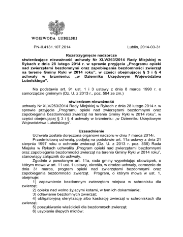 WOJEWODA LUBELSKI PN-II.4131.107.2014 Lublin, 2014-03-31 Rozstrzygnięcie nadzorcze stwierdzające nieważność uchwały Nr XLV/263/2014 Rady Miejskiej w Rykach z dnia 28 lutego 2014 r. w sprawie przyjęcia „Programu opieki nad zwierzętami bezdomnymi oraz zapobiegania bezdomności zwierząt na terenie Gminy Ryki w 2014 roku”, w części obejmującej § 3 i § 4 uchwały w brzmieniu: „w Dzienniku Urzędowym Województwa Lubelskiego”. Na podstawie art. 91 ust. 1 i 3 ustawy z dnia 8 marca 1990 r. o samorządzie gminnym (Dz. U. z 2013 r., poz. 594 ze zm.) stwierdzam nieważność uchwały Nr XLV/263/2014 Rady Miejskiej w Rykach z dnia 28 lutego 2014 r. w sprawie przyjęcia „Programu opieki nad zwierzętami bezdomnymi oraz zapobiegania bezdomności zwierząt na terenie Gminy Ryki w 2014 roku”, w części obejmującej § 3 i § 4 uchwały w brzmieniu: „w Dzienniku Urzędowym Województwa Lubelskiego”. Uzasadnienie Uchwała została doręczona organowi nadzoru w dniu 7 marca 2014r. Przedmiotową uchwałą, podjętą na podstawie art. 11a ustawy z dnia 21 sierpnia 1997 roku o ochronie zwierząt (Dz. U. z 2013 r. poz. 856) Rada Miejska w Rykach uchwaliła „Program opieki nad zwierzętami bezdomnymi oraz zapobiegania bezdomności zwierząt na terenie Gminy Ryki w 2014 roku”, stanowiący załącznik do uchwały. Zgodnie z powołanym art. 11a, rada gminy wypełniając obowiązek, o którym mowa w art. 11 ust. 1 ustawy, określa, w drodze uchwały, corocznie do dnia 31 marca, program opieki nad zwierzętami bezdomnymi oraz zapobiegania bezdomności zwierząt. Program, o którym mowa w ust. 1, obejmuje: 1) zapewnienie bezdomnym zwierzętom miejsca w schronisku dla zwierząt; 2) opiekę nad wolno żyjącymi kotami, w tym ich dokarmianie; 3) odławianie bezdomnych zwierząt; 4) obligatoryjną sterylizację albo kastrację zwierząt w schroniskach dla zwierząt; 5) poszukiwanie właścicieli dla bezdomnych zwierząt; 6) usypianie ślepych miotów; 2 7) wskazanie gospodarstwa rolnego w celu zapewnienia miejsca dla zwierząt gospodarskich; 8) zapewnienie całodobowej opieki weterynaryjnej w przypadkach zdarzeń drogowych z udziałem zwierząt (ust. 2). Katalog zagadnień przekazanych cytowanym przepisem do uregulowania ma charakter zamknięty, co oznacza, że organy stanowiące nie mogą określać w programie opieki nad zwierzętami bezdomnymi oraz zapobiegania bezdomności zwierząt kwestii, które wykraczają poza jego zakres. Organ gminy podejmując uchwałę w przedmiocie programu opieki nad bezdomnymi zwierzętami i zapobiegania bezdomności zwierząt musi ściśle uwzględniać wytyczne zawarte w upoważnieniu. Istotą analizy prawidłowości uchwały w przedmiotowej sprawie jest więc wskazanie zakresu, jakie obejmuje upoważnienie ustawowe, a w konsekwencji ocena, czy Rada wypełniła cały zakres spraw przekazanych przez ustawodawcę do uregulowania, jednocześnie nie przekraczając kompetencji przyznanych normą ustawową. W § 3 uchwały, Rada Miejska wskazała, że „traci moc uchwała Nr XXXI/177/2013 Rady Miejskiej w Rykach z dnia 25 stycznia 2013 r. w sprawie przyjęcia „Programu opieki nad zwierzętami bezdomnymi oraz zapobiegania bezdomności zwierząt na terenie Gminy Ryki w 2013 r. (Dz. Urz. Woj. Lub. z dnia 19.02.2013 r., poz. 1027)” Zamieszczenie przepisu § 3 w uchwale Nr XLV/263/2014 pozostaje w sprzeczności z przytoczonym powyżej art. 11a ust. 1 ustawy o ochronie zwierząt, zgodnie z którym uchwała w sprawie programu opieki nad zwierzętami bezdomnymi oraz zapobiegania bezdomności zwierząt jest podejmowana na okres jednego roku, a co za tym idzie - po upływie tego okresu przestaje obowiązywać. Regulacja § 3 uchwały jest zatem normatywnie zbędna. Rada Miejska nie była władna regulować kwestii utraty mocy obowiązującej przez uchwałę Nr XXXI/177/2013, bowiem to zagadnienie normuje wprost powołany art. 11a ust. 1 ustawy o ochronie zwierząt. Uchylanie przepisów, które już nie obowiązują, jest wadliwe w kontekście zasad prawidłowej legislacji, a nadto może być przyczyną dezinformacji wynikającej z faktu zamieszczenia wadliwych zapisów w uchwale. W § 4 uchwały Rada postanowiła, że „Uchwała wchodzi w życie po upływie 14 dni od ogłoszenia w Dzienniku Urzędowym Województwa Lubelskiego”. W ocenie organu nadzoru, przedmiotowa regulacja nie znajduje uzasadnienia prawnego i pozostaje w sprzeczności z art. 13 ustawy z dnia 20 lipca 2000 r. o ogłaszaniu aktów normatywnych i niektórych innych aktów prawnych (Dz. U. z 2011 r. Nr 197, poz. 1172, ze zm.). Przepis ten określa katalog aktów prawnych podlegających ogłoszeniu w wojewódzkim dzienniku urzędowym, który obejmuje: 1) akty prawa miejscowego stanowione przez wojewodę i organy administracji niezespolonej; 3 2) akty prawa miejscowego stanowione przez sejmik województwa, organ powiatu oraz organ gminy, w tym statuty województwa, powiatu i gminy; 3) statuty związków międzygminnych oraz statuty związków powiatów; 4) akty Prezesa Rady Ministrów uchylające akty prawa miejscowego stanowionego przez wojewodę i organy administracji niezespolonej; 5) wyroki sądu administracyjnego uwzględniające skargi na akty prawa miejscowego stanowionego przez: wojewodę i organy administracji niezespolonej, organ samorządu województwa, organ powiatu i organ gminy; 6) porozumienia w sprawie wykonywania zadań publicznych zawarte: a) między jednostkami samorządu terytorialnego, b) między jednostkami samorządu terytorialnego i organami administracji rządowej; 7) uchwały budżetowe gminy, powiatu i województwa oraz sprawozdanie z wykonania budżetu gminy, powiatu i województwa; 8) obwieszczenia o wygaśnięciu mandatu wójta (burmistrza, prezydenta miasta) oraz o rozwiązaniu sejmiku województwa, rady powiatu lub rady gminy; 8a) rozstrzygnięcia nadzorcze dotyczące aktów prawa miejscowego stanowionych przez jednostki samorządu terytorialnego; 9) statut urzędu 
