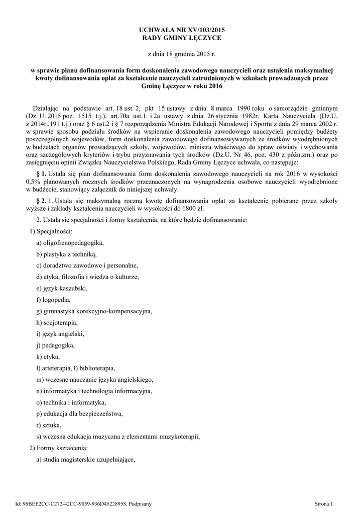 UCHWAŁA NR XV/103/2015 RADY GMINY ŁĘCZYCE z dnia 18 grudnia 2015 r. w sprawie planu dofinansowania form doskonalenia zawodowego nauczycieli oraz ustalenia maksymalnej kwoty dofinansowania opłat za kształcenie nauczycieli zatrudnionych w szkołach prowadzonych przez Gminę Łęczyce w roku 2016 Działając na podstawie art. 18 ust. 2, pkt 15 ustawy z dnia 8 marca 1990 roku o samorządzie gminnym (Dz. U. 2015 poz. 1515 t.j.), art.70a ust.1 i 2a ustawy z dnia 26 stycznia 1982r. Karta Nauczyciela (Dz.U. z 2014r.,191 t.j.) oraz § 6 ust.2 i § 7 rozporządzenia Ministra Edukacji Narodowej i Sportu z dnia 29 marca 2002 r. w sprawie sposobu podziału środków na wspieranie doskonalenia zawodowego nauczycieli pomiędzy budżety poszczególnych wojewodów, form doskonalenia zawodowego dofinansowywanych ze środków wyodrębnionych w budżetach organów prowadzących szkoły, wojewodów, ministra właściwego do spraw oświaty i wychowania oraz szczegółowych kryteriów i trybu przyznawania tych środków (Dz.U. Nr 46, poz. 430 z późn.zm.) oraz po zasięgnięciu opinii Związku Nauczycielstwa Polskiego, Rada Gminy Łęczyce uchwala, co następuje: § 1. Ustala się plan dofinansowania form doskonalenia zawodowego nauczycieli na rok 2016 w wysokości 0,5% planowanych rocznych środków przeznaczonych na wynagrodzenia osobowe nauczycieli wyodrębnione w budżecie, stanowiący załącznik do niniejszej uchwały. § 2. 1. Ustala się maksymalną roczną kwotę dofinansowania opłat za kształcenie pobierane przez szkoły wyższe i zakłady kształcenia nauczycieli w wysokości do 1800 zł. 2. Ustala się specjalności i formy kształcenia, na które będzie dofinansowanie: 1) Specjalności: a) oligofrenopedagogika, b) plastyka z techniką, c) doradztwo zawodowe i personalne, d) etyka, filozofia i wiedza o kulturze, e) język kaszubski, f) logopedia, g) gimnastyka korekcyjno-kompensacyjna, h) socjoterapia, i) język angielski, j) pedagogika, k) etyka, l) arteterapia, ł) biblioterapia, m) wczesne nauczanie języka angielskiego, n) informatyka i technologia informacyjna, o) technika i informatyka, p) edukacja dla bezpieczeństwa, r) sztuka, s) wczesna edukacja muzyczna z elementami muzykoterapii, 2) Formy kształcenia: a) studia magisterskie uzupełniające, Id: 96BEE2CC-C272-42CC-9059-936D45228958. Podpisany Strona 1 b) studia licencjackie kierunkowe, c) studia podyplomowe, d) kursy kwalifikacyjne, kursy doskonalące, e) szkolenia, w tym rad pedagogicznych, seminaria, warsztaty, konferencje, f) egzamin państwowy nadający kwalifikacje zawodowe nauczycielom. § 3. Wykonanie uchwały powierza się Wójtowi Gminy Łęczyce. § 4. Tracą moc uchwały: 1) Uchwała Nr III/17/2014 Rady Gminy Łęczyce z dnia 30 grudnia 2014 r. w sprawie planu dofinasowania form doskonalenia zawodowego nauczycieli oraz ustalenia maksymalnej kwoty dofinansowania opłat za kształcenie nauczycieli zatrudnionych w szkołach prowadzonych przez Gminę Łęczyce w roku 2015; 2) Uchwała Nr V/11/2015 Rady Gminy Łęczyce z dnia 2 lutego 2015r. zmieniająca uchwałę Rady Gminy Łęczyce w sprawie planu dofinasowania form doskonalenia zawodowego nauczycieli oraz ustalenia maksymalnej kwoty dofinansowania opłat za kształcenie nauczycieli zatrudnionych w szkołach prowadzonych przez Gminę Łęczyce w roku 2015; § 5. Uchwała wchodzi w życie z dniem podjęcia i ma zastosowanie od 01.01.2016 r. Przewodniczący Rady Gminy w Łęczycach Krzysztof Licau Id: 96BEE2CC-C272-42CC-9059-936D45228958. Podpisany Strona 2 Załącznik do Uchwały Nr XV/103/2015 Rady Gminy Łęczyce z dnia 18 grudnia 2015 r. Plan dofinansowania form doskonalenia zawodowego nauczycieli na rok 2016 § 1. 1. Środki na wspieranie doskonalenia zawodowego nauczycieli wyodrębniono w budżecie gminy na 2016 rok w wysokości 53 273 zł. 2. Dokonuje się podziału według załączonej tabeli. Ze środków na dokształcanie i doskonalenie nauczycieli dofinasowuje się: Studia magisterskie uzupełniające Studia podyplomowe Kursy kwalifikacyjne Kursy doskonalące Szkolenia Seminaria Warsztaty Konferencje Egzamin państwowy nadający kwalifikacje zawodowe nauczycielom Przejazdy oraz zakwaterowanie i wyżywienie nauczycieli, którzy na podstawie skierowania udzielonego przez dyrektora szkoły uczestniczą w różnych formach doskonalenia zawodowego, a w szczególności uzupełniają lub podnoszą kwalifikacje Id: 96BEE2CC-C272-42CC-9059-936D45228958. Podpisany Przydzielone środki w złotych 29 620 20 403 3 250 Strona 1