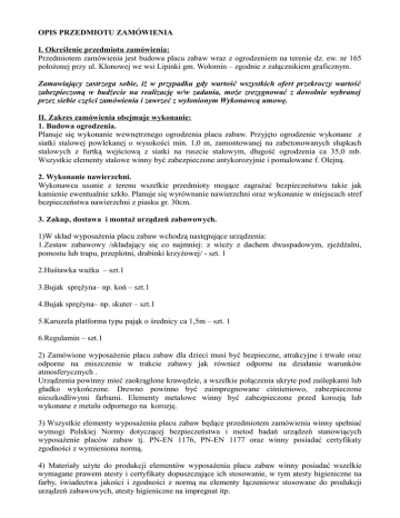 OPIS PRZEDMIOTU ZAMÓWIENIA I. Określenie przedmiotu zamówienia: Przedmiotem zamówienia jest budowa placu zabaw wraz z ogrodzeniem na terenie dz. ew. nr 165 położonej przy ul. Klonowej we wsi Lipinki gm. Wołomin – zgodnie z załącznikiem graficznym. Zamawiający zastrzega sobie, iż w przypadku gdy wartość wszystkich ofert przekroczy wartość zabezpieczoną w budżecie na realizację w/w zadania, może zrezygnować z dowolnie wybranej przez siebie części zamówienia i zawrzeć z wyłonionym Wykonawcą umowę. II. Zakres zamówienia obejmuje wykonanie: 1. Budowa ogrodzenia. Planuje się wykonanie wewnętrznego ogrodzenia placu zabaw. Przyjęto ogrodzenie wykonane z siatki stalowej powlekanej o wysokości min. 1,0 m, zamontowanej na zabetonowanych słupkach stalowych z furtką wejściową z siatki na ruszcie stalowym, długość ogrodzenia ca 35,0 mb. Wszystkie elementy stalowe winny być zabezpieczone antykorozyjnie i pomalowane f. Olejną. 2. Wykonanie nawierzchni. Wykonawca usunie z terenu wszelkie przedmioty mogące zagrażać bezpieczeństwu takie jak kamienie ewentualnie szkło. Planuje się wyrównanie nawierzchni oraz wykonanie w miejscach stref bezpieczeństwa nawierzchni z piasku gr. 30cm. 3. Zakup, dostawa i montaż urządzeń zabawowych. 1)W skład wyposażenia placu zabaw wchodzą następujące urządzenia: 1.Zestaw zabawowy /składający się co najmniej: z wieży z dachem dwuspadowym, zjeżdżalni, pomostu lub trapu, przeplotni, drabinki krzyżowej/ - szt. 1 2.Huśtawka ważka – szt.1 3.Bujak sprężyna– np. koń – szt.1 4.Bujak sprężyna– np. skuter – szt.1 5.Karuzela platforma typu pająk o średnicy ca 1,5m – szt. 1 6.Regulamin – szt.1 2) Zamówione wyposażenie placu zabaw dla dzieci musi być bezpieczne, atrakcyjne i trwałe oraz odporne na zniszczenie w trakcie zabawy jak również odporne na działanie warunków atmosferycznych . Urządzenia powinny mieć zaokrąglone krawędzie, a wszelkie połączenia ukryte pod zaślepkami lub gładko wykończone. Drewno powinno być zaimpregnowane ciśnieniowo, zabezpieczone nieszkodliwymi farbami. Elementy metalowe winny być zabezpieczone przed korozją lub wykonane z metalu odpornego na korozję. 3) Wszystkie elementy wyposażenia placu zabaw będące przedmiotem zamówienia winny spełniać wymogi Polskiej Normy dotyczącej bezpieczeństwa i metod badań urządzeń stanowiących wyposażenie placów zabaw tj. PN-EN 1176, PN-EN 1177 oraz winny posiadać certyfikaty zgodności z wymieniona normą. 4) Materiały użyte do produkcji elementów wyposażenia placu zabaw winny posiadać wszelkie wymagane prawem atesty i certyfikaty dopuszczające ich stosowanie, w tym atesty higieniczne na farby, świadectwa jakości i zgodności z normą na elementy łączeniowe stosowane do produkcji urządzeń zabawowych, atesty higieniczne na impregnat itp. 5) Oferowane przez Wykonawcę elementy wyposażenia placu zabaw winny być fabrycznie nowe. Wykonawca do formularza ofertowego dołączy w/w dokumenty o których mowa wyżej tj. certyfikaty, atesty oraz karty katalogowe wraz ze zdjęciem, wizualizację bądż rysunkiem urzadzeń zabawowych załącznik do formularza ofertowego III. Wymagania odnośnie wykonawcy: 1) posiadanie uprawnień do wykonywania określonej działalności lub czynności, jeżeli przepisy prawa nakładają ich posiadania, na potwierdzenie Wykonawca złoży stosowne dokumenty tj: aktualny odpis z właściwego rejestru lub aktualne zaświadczenie o wpisie do ewidencji działalności gospodarczej lub kserokopię dowodu osobistego oraz oświadczenie – załącznik do formularza ofertowego 2) posiadanie wiedzy i doświadczenia, Wykonawca wykaże, że w okresie ostatnich pięciu lat przed upływem terminu składania ofert, a jeżeli okres prowadzenia działalności jest krótszy – w tym okresie, wykonał, 2 roboty w zakresie niezbędnym do wykazania spełnienia warunku wiedzy i doświadczenia. Przez roboty w zakresie niezbędnym do wykazania spełnienia warunku wiedzy i doświadczenia Zamawiający rozumie min. 2 roboty polegające na budowie placu zabaw o wartości minimum 20.000,00zł brutto każda, na potwierdzenie Wykonawca złoży stosowny wykaz – załącznik do formularza ofertowego 3) wykonawca do realizacji zamówienia będzie dysponował kierownikiem budowy posiadającym doświadczenie zawodowe oraz odpowiednie uprawnienia budowlane do kierowania robotami budowlanymi będącymi przedmiotem postępowania oraz posiadać aktualne zaświadczenie o przynależności do odpowiedniej izby samorządu zawodowego IV. Dane wyjściowe i zalecenia Zamawiającego: 1)opracowanie przedmiotu zamówienia musi być poprzedzone szczegółową wizją w terenie 2) dostarczone urządzenia zabawowe będą spełniać wszystkie wymogi jakościowe i techniczne określone w ofercie. 3) lokalizacja urządzeń objętych przedmiotem zamówienia winna być zgodna z załączonym projektem zagospodarowania działki. V. Obowiązki Wykonawcy : 1)wykonać przedmiot umowy z należytą starannością, zgodnie z: dokumentacją formalno-prawną, zasadami współczesnej wiedzy technicznej (sztuką budowlaną), zgodnie z obowiązującymi przepisami i normami oraz na ustalonych umową warunkach, w ścisłej współpracy z Zamawiającym; 2)nad realizowanymi robotami zapewnić kierownictwo zawodowe. posiadające odpowiednie uprawnienia 3)protokolarne przyjęcie ( w formie protokołu wprowadzenia ) od inwestora teren budowy; 4)Wykonawca zobowiązany jest do dokonania na własny koszt niezwłocznej naprawy wszelkich szkód powstałych z winy Wykonawcy, wobec osób trzecich, na terenie robót oraz poza terenem; 5)dozorowanie budowy, ochrona mienia znajdującego się na placu budowy; 6)ochrona środowiska naturalnego; 7)udzielenie 36 miesięcznej gwarancji na przedmiot umowy 8)usuwanie wad i usterek w trakcie realizacji robót i w okresie rękojmii i gwarancji 9)wykonanie wszelkich zaleceń wynikających z zapisów protokołów sporządz