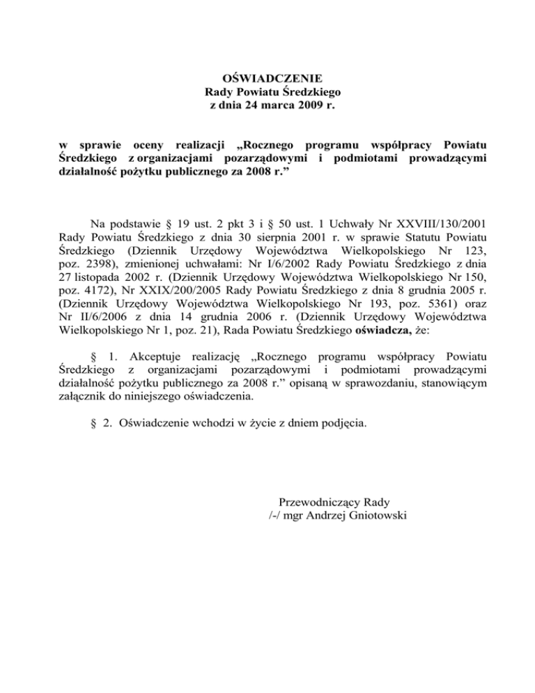 OŚWIADCZENIE Rady Powiatu Średzkiego z dnia 24 marca 2009 r. w sprawie oceny realizacji „Rocznego programu wsp‚łpracy Powiatu Średzkiego z organizacjami pozarządowymi i podmiotami prowadzącymi działalność pożytku publicznego za 2008 r.” Na podstawie € 19 ust. 2 pkt 3 i € 50 ust. 1 Uchwały Nr XXVIII/130/2001 Rady Powiatu Średzkiego z dnia 30 sierpnia 2001 r. w sprawie Statutu Powiatu Średzkiego (Dziennik Urzędowy Wojew„dztwa Wielkopolskiego Nr 123, poz. 2398), zmienionej uchwałami: Nr I/6/2002 Rady Powiatu Średzkiego z dnia 27 listopada 2002 r. (Dziennik Urzędowy Wojew„dztwa Wielkopolskiego Nr 150, poz. 4172), Nr XXIX/200/2005 Rady Powiatu Średzkiego z dnia 8 grudnia 2005 r. (Dziennik Urzędowy Wojew„dztwa Wielkopolskiego Nr 193, poz. 5361) oraz Nr II/6/2006 z dnia 14 grudnia 2006 r. (Dziennik Urzędowy Wojew„dztwa Wielkopolskiego Nr 1, poz. 21), Rada Powiatu Średzkiego oświadcza, że: • 1. Akceptuje realizację „Rocznego programu wsp„łpracy Powiatu Średzkiego z organizacjami pozarządowymi i podmiotami prowadzącymi działalność pożytku publicznego za 2008 r.” opisaną w sprawozdaniu, stanowiącym załącznik do niniejszego oświadczenia. • 2. Oświadczenie wchodzi w życie z dniem podjęcia. Przewodniczący Rady /-/ mgr Andrzej Gniotowski Uzasadnienie do Oświadczenia Rady Powiatu Średzkiego z dnia 24 marca 2009 roku w sprawie oceny realizacji „Rocznego programu wspƒłpracy Powiatu Średzkiego z organizacjami pozarządowymi i podmiotami prowadzącymi działalność pożytku publicznego za 2008 r.” Zgodnie z pkt IX „Karty wsp•łpracy Powiatu Średzkiego z organizacjami pozarządowymi”, przyjętej Uchwałą Nr XXIX/203/2005 Rady Powiatu Średzkiego z dnia 8 grudnia 2005 r., Koordynator ds. wsp•łpracy z organizacjami pozarządowymi przedstawia do akceptacji Radzie Powiatu Średzkiego, sprawozdanie z realizacji wsp•łpracy w minionym roku, w tym z realizacji zadań publicznych zleconych organizacjom pozarządowym. Opracowane przez Koordynatora ds. wsp•łpracy z organizacjami pozarządowymi sprawozdanie z przebiegu realizacji „Rocznego programu wsp•łpracy Powiatu Średzkiego z organizacjami pozarządowymi i podmiotami prowadzącymi działalność pożytku publicznego za 2008 r.”, pozwala zaakceptować jego realizację.