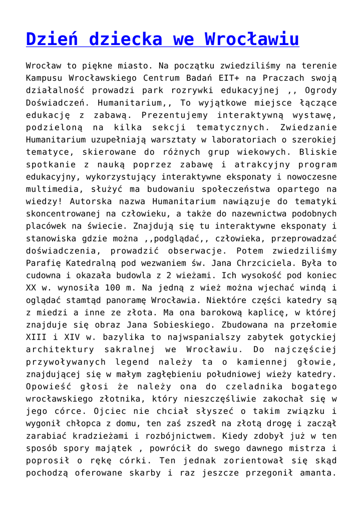 Dzień dziecka we Wrocławiu Wrocław to piękne miasto. Na początku zwiedziliśmy na terenie Kampusu Wrocławskiego Centrum Badań EIT+ na Praczach swoją działalność prowadzi park rozrywki edukacyjnej ,, Ogrody Doświadczeń. Humanitarium,, To wyjątkowe miejsce łączące edukację z podzieloną zabawą. Prezentujemy interaktywną wystawę, na kilka sekcji tematycznych. Zwiedzanie Humanitarium uzupełniają warsztaty w laboratoriach o szerokiej tematyce, skierowane do różnych grup wiekowych. Bliskie spotkanie z nauką poprzez zabawę i atrakcyjny program edukacyjny, wykorzystujący interaktywne eksponaty i nowoczesne multimedia, służyć ma budowaniu społeczeństwa opartego na wiedzy! Autorska nazwa Humanitarium nawiązuje do tematyki skoncentrowanej na człowieku, a także do nazewnictwa podobnych placówek na świecie. Znajdują się tu interaktywne eksponaty i stanowiska gdzie można ,,podglądać,, człowieka, przeprowadzać doświadczenia, prowadzić obserwacje. Potem zwiedziliśmy Parafię Katedralną pod wezwaniem św. Jana Chrzciciela. Była to cudowna i okazała budowla z 2 wieżami. Ich wysokość pod koniec XX w. wynosiła 100 m. Na jedną z wież można wjechać windą i oglądać stamtąd panoramę Wrocławia. Niektóre części katedry są z miedzi a inne ze złota. Ma ona barokową kaplicę, w której znajduje się obraz Jana Sobieskiego. Zbudowana na przełomie XIII i XIV w. bazylika to najwspanialszy zabytek gotyckiej architektury sakralnej we Wrocławiu. Do najczęściej przywoływanych legend należy ta o kamiennej głowie, znajdującej się w małym zagłębieniu południowej wieży katedry. Opowieść głosi że należy ona do czeladnika bogatego wrocławskiego złotnika, który nieszczęśliwie zakochał się w jego córce. Ojciec nie chciał słyszeć o takim związku i wygonił chłopca z domu, ten zaś zszedł na złotą drogę i zaczął zarabiać kradzieżami i rozbójnictwem. Kiedy zdobył już w ten sposób spory majątek , powrócił do swego dawnego mistrza i poprosił o rękę córki. Ten jednak zorientował się skąd pochodzą oferowane skarby i raz jeszcze przegonił amanta. Odtrącony zaś w akcie rozpaczy i zemsty podpalił jego dom, a następnie obserwował pożogę z małego okienka na wieży katedry. Kara przyszła szybciej niż się spodziewał i mury zacisnęły się na jego szyi, a skamieniała głowa na wieki stała eis ostrzeżeniem dla innych chcących pójść w jego ślady. Inna opowieść wiąże się z głową lwa bez grzywy. Jej brak historia tłumaczy sporem, jaki wybuchł pomiędzy kamieniarzem, który wyrzeźbił figurę, a mistrzem który nie zapłacił mu całej obiecanej kwoty. Kamieniarz ze złością uderzył w lwa, chcąc go zniszczyć, ale niespodzianie odpadła tylko grzywa. Uznano to za boską interwencję, która pozbawiła skąpego mistrza tej części pracy za którą nie zapłacił. W kwietniu 1241, w obawie przed mongolskim najazdem miasto zostało opuszczone przez mieszkańców i spalone. Zamek wrocławski w którym bronił się Henryk II Pobożny, pozostał niezdobyty dzięki cudownemu zjawisku, które ukazało się na niebie powodując odstąpienie Tatarów od oblężenia. Tradycja która przekazał m.in. Jan Długosz uznała to za skutek modlitw przeora wrocławskich dominikanów Czesława Odrowąża późniejszego błogosławionego i patrona miasta. W centrum miasta robiliśmy zdjęcia przy oryginalnej szklanej fontannie. Wart też zobaczyć najstarszą część Wrocławia Ostrów Tumski. W mieście tym można odpocząć także w zoo, ogrodzie botanicznym czy ogrodzie japońskim. W centrum miasta rozpościera się założony w XVIII w. Park Szczytnicki, w którym rośnie 370 gatunków drzew i krzewów oraz znajduje się oryginalny Ogród Japoński. Zaprojektowany i utrzymany w japońskie sztuce ogrodniczej. Szczególna uwagę należy zwrócić na dość dużą ilość i ponad stuletnie drzewa platany. Ratusz i Piwnica Świdnicka,, Kto nie był w Piwnicy Świdnickiej ten nie był we Wrocławiu,, jak głosił niegdyś napis na ścianach we wnętrzu lokalu. Często twierdzi się że jest to najstarsza restauracja w Europie, choć jeśli jest to prawda, to dotyczy to samego budynku, gdyż restauracja zmieniała funkcje i właścicieli. Najstarsze ślady działania przybytku pochodzą z roku 1303, zaś na rok 1332 datowany jest rachunek świadczący o sprowadzaniu ze Świdnicy piwa jęczmiennego, któremu restauracja zawdzięcza swą nazwę. Nad wejściem do piwnicy można zobaczyć 2 płaskorzeźby-pijanego chwiejącego się mężczyzny i czyhającej na niego żony z pantoflem w dłoni. To ostrzeżenie dla tych którzy ochoczo poddadzą się urokowi piwa.Przed Halą Stulecia w drodze na Fontane można zobaczyć iglicę. Największa fontanna w Polsce i jedna z największych w Europie. Jej uroczyste otwarcie miało miejsce 4.06.09r. przy okazji 20 rocznicy pierwszych wolnych wyborów w powojennej Polsce. Usytuowana w malowniczym krajobrazie Parku Szczytnickiego przy historycznym kompleksie Hali Stulecia oraz Wrocławskim Centrum Kongresowym wzbudza zainteresowanie turystów. Widowisko wody i ognia wzbogacą obrazy rzucane przez projektor na ekran wodny a także światła laserów i dźwięki muzyki.Kamienice we Wrocławiu prezentują style począwszy od baroku poprzez klasycyzm, historyzm, secesję aż po modernizu. W budynku Banku Zachodniego na rogu rynku i placu Solnego działa jedyny we Wrocławiu paternoster czyli winda bez drzwi. Wrocław ma 4 największą liczbę mostów (kładek) w Europie plasuje się za Wenecją, Amsterdamem, Petersburgiem. Wrocławski ratusz jest jednym z najstarszych ratuszy w Polsce. Na wysokiej wieży mieści się najstarszy w Polsce dzwon zegarowy i najstarszy z 1368 zegar wieżowy. Plac solny dawny średniowieczny plac targowy swym narożnikiem styka się z Rynkiem. Ponadto Wrocław jako jedno z nielicznych miast w Europie oprócz dużej ilości mostów i kładek ma również za