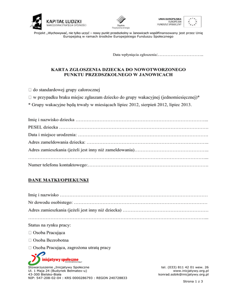 Projekt „Wychowywać, nie tylko uczyć – nowy punkt przedszkolny w Janowicach współfinansowany jest przez Unię Europejską w ramach środków Europejskiego Funduszu Społecznego Data wpłynięcia zgłoszenia:……………………….. KARTA ZGŁOSZENIA DZIECKA DO NOWOTWORZONEGO PUNKTU PRZEDSZKOLNEGO W JANOWICACH * Grupy wakacyjne będą trwały w miesiącach lipiec 2012, sierpień 2012, lipiec 2013. Imię i nazwisko dziecka ………………………………………………………………………... PESEL dziecka …………………………………………………………………………………. Data i miejsce urodzenia: ………………………………………………………………………. Adres zameldowania dziecka: ………………………………………………………………….. Adres zamieszkania (jeżeli jest inny niż zameldowania)……………………………………….. …………………………………………………………………………………………………... Numer telefonu kontaktowego:…………………………………………………………………. DANE MATKI/OPIEKUNKI Imię i nazwisko ………………………………………………………………………………… Nr dowodu osobistego: ………………………………………………………………………… Adres zamieszkania (jeżeli jest inny niż dziecka) ……………………………………………… …………………………………………………………………………………………………... Status na rynku pracy: Pracująca, zagrożona utratą pracy Stowarzyszenie „Inicjatywy Społeczne Ul. 1 Maja 24 (Budynek Belmatex-u) 43-300 Bielsko-Biała NIP: 547-208-02-04 : KRS 0000286793 : REGON 240728833 tel. (033) 811 42 01 wew. 26 www.inicjatywy.org.pl [email protected] Strona 1 z 3 Projekt „Wychowywać, nie tylko uczyć – nowy punkt przedszkolny w Janowicach współfinansowany jest przez Unię Europejską w ramach środków Europejskiego Funduszu Społecznego DANE OJCA/OPIEKUNA Imię i nazwisko ………………………………………………………………………………… Nr dowodu osobistego: ………………………………………………………………………… Adres zamieszkania (jeżeli jest inny niż dziecka) ……………………………………………… …………………………………………………………………………………………………... Status na rynku pracy: STAN RODZINY Ilość osób dorosłych: ………. Ilość dzieci: ………. stanowiących jedną rodzinę Dodatkowe informacje o dziecku lub rodzinie (zainteresowania, szczególne zdolności, problemy zdrowotne – alergie, uczulenia, itp., inne ważne informacje na temat dziecka i sytuacji rodzinnej): ………………………………………………………………………………………………….. …………………………………………………………………………………………………. …………………………………………………………………………………………………. OŚWIADCZENIE WARUNKOWE W przypadku przyjęcia dziecka do kilku placówek przedszkolnych, poślę dziecko do: projektu dofinansowanego przez Unię Europejską Stowarzyszenie „Inicjatywy Społeczne Ul. 1 Maja 24 (Budynek Belmatex-u) 43-300 Bielsko-Biała NIP: 547-208-02-04 : KRS 0000286793 : REGON 240728833 tel. (033) 811 42 01 wew. 26 www.inicjatywy.org.pl [email protected] Strona 2 z 3 Projekt „Wychowywać, nie tylko uczyć – nowy punkt przedszkolny w Janowicach współfinansowany jest przez Unię Europejską w ramach środków Europejskiego Funduszu Społecznego Zgłaszam chęć czynnego uczestnictwa w projekcie dziecka Zostałem(am) poinformowany(a), iż projekt „Wychowywać, nie tylko uczyć – nowy punkt przedszkolny w Janowicach” jest współfinansowany ze środków Europejskiego Funduszu Społecznego. Zobowiązuję się do uczestnictwa dziecka w projekcje, zajęciach oraz do udzielania niezbędnych informacji dla celów monitoringu i ewaluacji. OŚWIADCZENIE OPIEKUNA O WYRAŻENIU ZGODY NA PRZETWARZANIE DANYCH OSOBOWYCH W związku z chęcią przystąpienia do Projektu „Wychowywać, nie tylko uczyć – nowy punkt przedszkolny w Janowicach” realizowanego w ramach Programu Operacyjnego Kapitał Ludzki wyrażam zgodę na przetwarzanie moich danych osobowych. Oświadczam, iż przyjmuje do wiadomości, że: 1) administratorem tak zebranych danych osobowych jest Stowarzyszenie Inicajatywy Społeczne 2) moje dane osobowe będą przetwarzane wyłącznie w celu realizacji przedmiotowego projektu 3) moje dane osobowe mogą zostać udostępnione innym podmiotom w celu ewaluacji, jak również w celu realizacji zadań związanych z monitoringiem i sprawozdawczością w ramach Programu Operacyjnego Kapitał Ludzki; 4) podanie danych jest dobrowolne, aczkolwiek odmowa ich podania jest równoznaczna z brakiem możliwości udzielenia wsparcia w ramach Projektu; 5) mam prawo dostępu do treści swoich danych do swoich danych i ich poprawiania. …………………………….. …………………………………. …………………………….. miejscowość, data podpis matki (opiekunki) podpis ojca (opiekuna) Zajęcia przedszkolne dla dzieci realizowane będą przez 2 lata całkowicie bezpłatnie. Unia Europejska przy współfinansowaniu Gminy w ramach Europejskiego Funduszu Społecznego dofinansuje wszystkie zajęcia, w tym zajęcia dodatkowe z: logopedii, rytmiki, język angielskiego, sztuki (plastyczno-ceramiczne-garncarstwo). Zapewniamy również bezpłatne wyżywienie w okresie realizacji projektu. Stowarzyszenie „Inicjatywy Społeczne Ul. 1 Maja 24 (Budynek Belmatex-u) 43-300 Bielsko-Biała NIP: 547-208-02-04 : KRS 0000286793 : REGON 240728833 tel. (033) 811 42 01 wew. 26 www.inicjatywy.org
