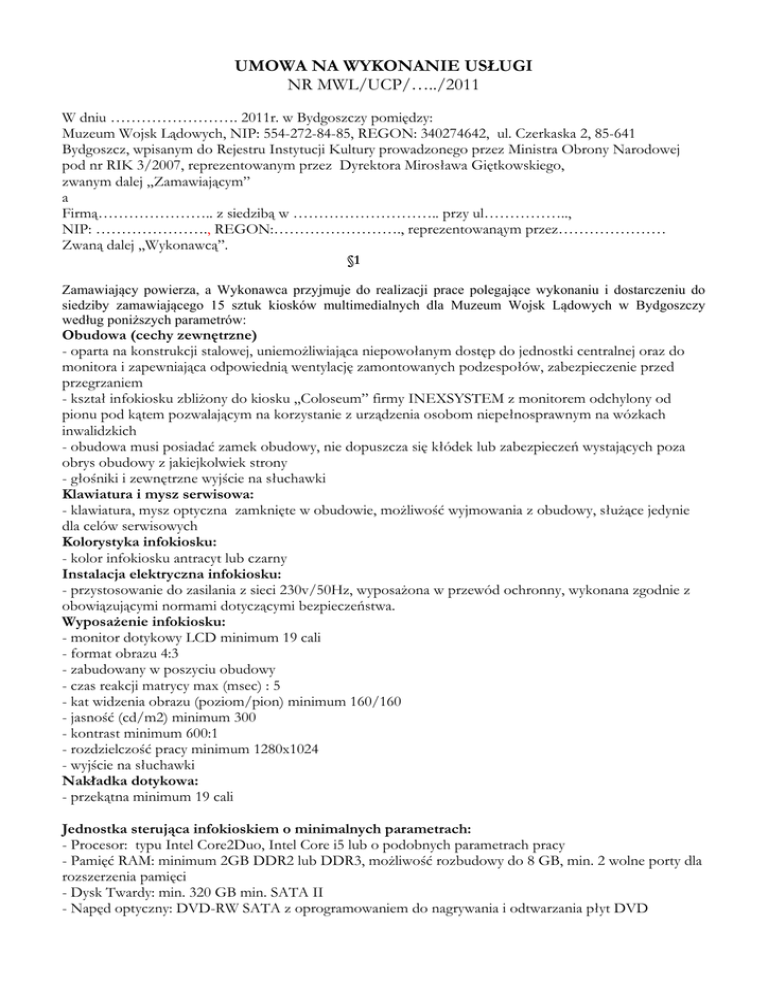 UMOWA NA WYKONANIE USŁUGI NR MWL/UCP/…../2011 W dniu ……………………. 2011r. w Bydgoszczy pomiędzy: Muzeum Wojsk Lądowych, NIP: 554-272-84-85, REGON: 340274642, ul. Czerkaska 2, 85-641 Bydgoszcz, wpisanym do Rejestru Instytucji Kultury prowadzonego przez Ministra Obrony Narodowej pod nr RIK 3/2007, reprezentowanym przez Dyrektora Mirosława Giętkowskiego, zwanym dalej „Zamawiającym” a Firmą………………….. z siedzibą w ……………………….. przy ul…………….., NIP: …………………., REGON:……………………., reprezentowanąym przez………………… Zwaną dalej „Wykonawcą”. §1 Zamawiający powierza, a Wykonawca przyjmuje do realizacji prace polegające wykonaniu i dostarczeniu do siedziby zamawiającego 15 sztuk kiosków multimedialnych dla Muzeum Wojsk Lądowych w Bydgoszczy według poniższych parametrów: Obudowa (cechy zewnętrzne) - oparta na konstrukcji stalowej, uniemożliwiająca niepowołanym dostęp do jednostki centralnej oraz do monitora i zapewniająca odpowiednią wentylację zamontowanych podzespołów, zabezpieczenie przed przegrzaniem - kształ infokiosku zbliżony do kiosku „Coloseum” firmy INEXSYSTEM z monitorem odchylony od pionu pod kątem pozwalającym na korzystanie z urządzenia osobom niepełnosprawnym na wózkach inwalidzkich - obudowa musi posiadać zamek obudowy, nie dopuszcza się kłódek lub zabezpieczeń wystających poza obrys obudowy z jakiejkolwiek strony - głośniki i zewnętrzne wyjście na słuchawki Klawiatura i mysz serwisowa: - klawiatura, mysz optyczna zamknięte w obudowie, możliwość wyjmowania z obudowy, służące jedynie dla celów serwisowych Kolorystyka infokiosku: - kolor infokiosku antracyt lub czarny Instalacja elektryczna infokiosku: - przystosowanie do zasilania z sieci 230v/50Hz, wyposażona w przewód ochronny, wykonana zgodnie z obowiązującymi normami dotyczącymi bezpieczeństwa. Wyposażenie infokiosku: - monitor dotykowy LCD minimum 19 cali - format obrazu 4:3 - zabudowany w poszyciu obudowy - czas reakcji matrycy max (msec) : 5 - kat widzenia obrazu (poziom/pion) minimum 160/160 - jasność (cd/m2) minimum 300 - kontrast minimum 600:1 - rozdzielczość pracy minimum 1280x1024 - wyjście na słuchawki Nakładka dotykowa: - przekątna minimum 19 cali Jednostka sterująca infokioskiem o minimalnych parametrach: - Procesor: typu Intel Core2Duo, Intel Core i5 lub o podobnych parametrach pracy - Pamięć RAM: minimum 2GB DDR2 lub DDR3, możliwość rozbudowy do 8 GB, min. 2 wolne porty dla rozszerzenia pamięci - Dysk Twardy: min. 320 GB min. SATA II - Napęd optyczny: DVD-RW SATA z oprogramowaniem do nagrywania i odtwarzania płyt DVD - Płyta główna: dostosowana do modelu procesora z wbudowana karta graficzną, minimum jednym portem SATA III, minimum jednym portem PCI-Express x16 oraz kontrolerem USB 3.0, - Karta graficzna: zintegrowana z płyta główną VGA - Karat dźwiękowa: zintegrowana z płyta główną w standardzie High Definition - Karat sieciowa: zintegrowana z płytą główną 100/1000 Mbit/s - Porty I/O: min. 2 porty USB 2.0 - System operacyjny – Windows 7 Proffesional minimum 32bit z licencją na system operacyjny, aktualizacja oprogramowania bezpłatna w okresie minimum 36 miesiecy Gwarancja i serwis: - Wymagany okres gwarancji na kioski multimedialne wynosi 36 miesięcy od daty odbioru - Zapewnienie serwisu w okresie gwarancji §2 Całkowity koszt wykonania prac objętych umową ustala się na kwotę netto w wysokości ………………………….zł. (słownie: …………………………. złotych 00/100), kwotę VAT: …………………………… zł (słownie: ……………………… złotych 00/100) co daje kwotę brutto w wysokości …………………………. zł (słownie: ………………………… złotych 00/100). §3 Termin wykonania prac , o których mowa w § 1 oraz ich dostarczenia do siedziby muzeum ustala się na dzień 15 listopada 2011 r. §4 Odbiór przedmiotu umowy przez Zamawiającego potwierdzone będzie protokołem odbioru, który będzie podstawą do wystawienia faktury VAT przez Wykonawcę §5 Płatność za wykonaną usługę będzie dokonana przelewem na rachunek bankowy Wykonawcy w terminie 30 dni licząc od dnia doręczenia Zamawiającemu faktury VAT. §6 1. W przypadku stwierdzenia jakichkolwiek wad w przekazanym przedmiocie umowy Zamawiający zawiadomi o nich Wykonawcę na piśmie (reklamacja). Wykonawca zobowiązany jest ustosunkować się do zawiadomienia o wadach w terminie 7 dni od dnia jego otrzymania. Brak ustosunkowania się w tym terminie oznacza uznanie reklamacji za zasadną. 2. Uznanie reklamacji za zasadną oznacza akceptację wszystkich uwag Zamawiającego zawartych w zawiadomieniu o wadach i w oparciu o nie usunięcie wad w przedmiocie umowy. 3. Brak uznania reklamacji uprawnia Zamawiającego do odstąpienia od umowy. 4. Wykonawca zobowiązuje się do usunięcia wskazanych przez Zamawiającego wad w terminie 14 dni od daty otrzymania zawiadomienia. §7 Strony postanawiają, że Zamawiający może odstąpić od umowy z winy Wykonawcy w przypadku naruszenia obowiązków przewidzianych w umowie do dnia 10 listopada 2011 roku. §8 1. W przypadku przekroczenia przez Wykonawcę terminu realizacji przedmiotu umowy określonego w § 3 umowy zobowiązany jest on do zapłaty na rzecz Zamawiającego kwoty stanowiącej równowartość 0,10% kwoty określonej w § 2 za każdy dzień zwłoki. Kara, o której mowa wyżej ma charakter zaliczany tj. podlega potrąceniu z kwoty należnej Wykonawcy. 2. W przypadku niezrealizowania przez Wykonawcę przedmiotu umowy po upływie 14 dni od terminu określonego w § 3 , umowę uznaje się za niewykonaną. Za niewykonanie przedmiotu umowy Wykonawca zobowiązany jest do zapłaty na rzecz Zamawiającego kwoty stanowiącej równowartość 30 % kwoty określonej w § 2 tytułem kary umownej. 3. W przypadku odstąpienia przez Wykonawcę od realizacj