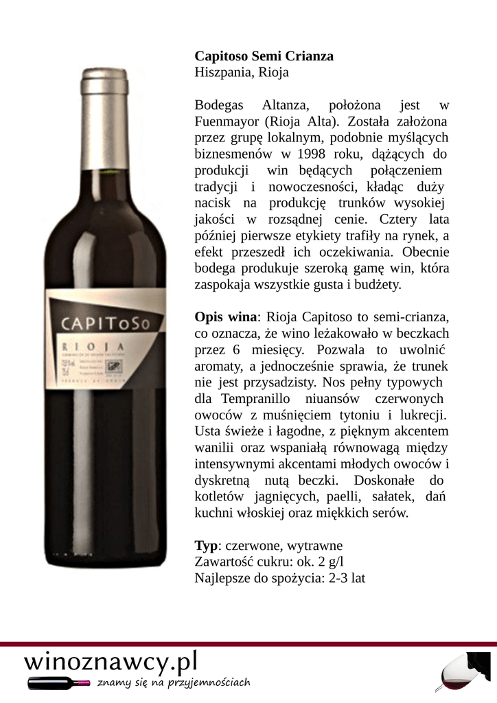 Capitoso Semi Crianza Hiszpania, Rioja Bodegas Altanza, położona jest w Fuenmayor (Rioja Alta). Została założona przez grupę lokalnym, podobnie myślących biznesmenów w 1998 roku, dążących do produkcji win będących połączeniem tradycji i nowoczesności, kładąc duży nacisk na produkcję trunków wysokiej jakości w rozsądnej cenie. Cztery lata później pierwsze etykiety trafiły na rynek, a efekt przeszedł ich oczekiwania. Obecnie bodega produkuje szeroką gamę win, która zaspokaja wszystkie gusta i budżety. Opis wina: Rioja Capitoso to semi-crianza, co oznacza, że wino leżakowało w beczkach przez 6 miesięcy. Pozwala to uwolnić aromaty, a jednocześnie sprawia, że trunek nie jest przysadzisty. Nos pełny typowych dla Tempranillo niuansów czerwonych owoców z muśnięciem tytoniu i lukrecji. Usta świeże i łagodne, z pięknym akcentem wanilii oraz wspaniałą równowagą między intensywnymi akcentami młodych owoców i dyskretną nutą beczki. Doskonałe do kotletów jagnięcych, paelli, sałatek, dań kuchni włoskiej oraz miękkich serów. Typ: czerwone, wytrawne Zawartość cukru: ok. 2 g/l Najlepsze do spożycia: 2-3 lat