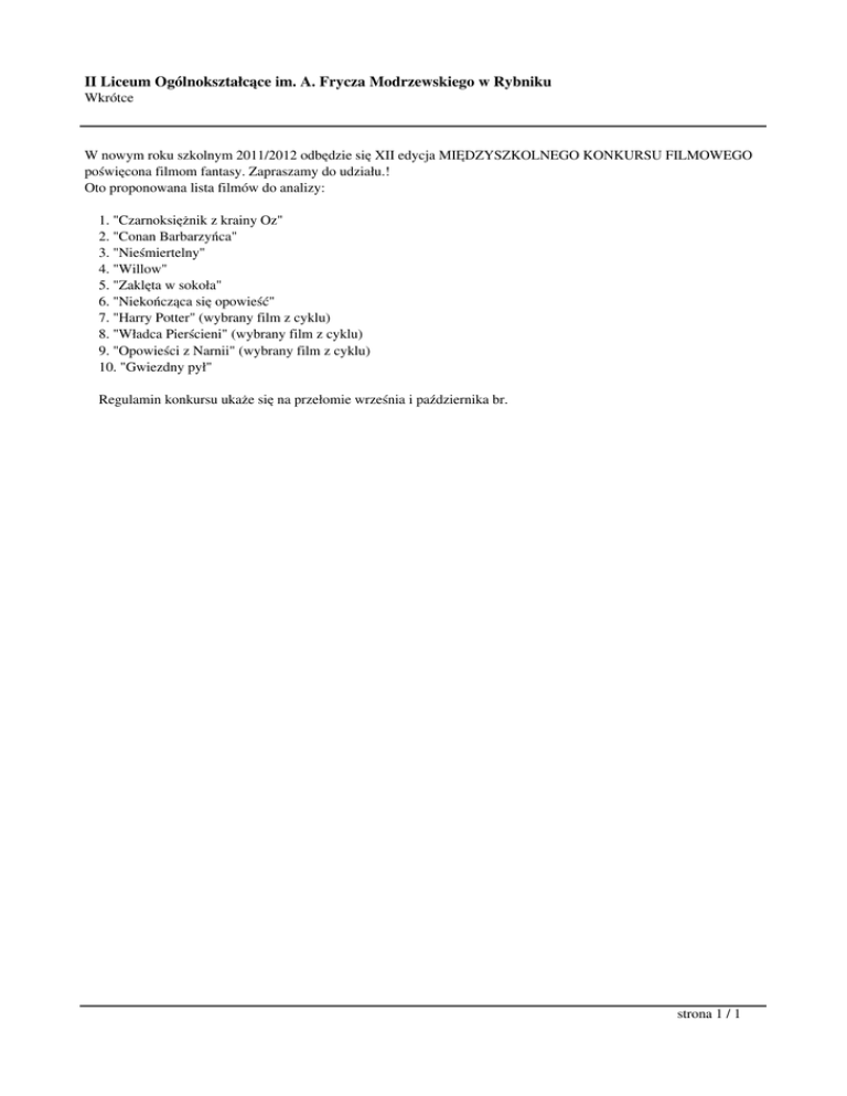 II Liceum Ogólnokształcące im. A. Frycza Modrzewskiego w Rybniku Wkrótce W nowym roku szkolnym 2011/2012 odbędzie się XII edycja MIĘDZYSZKOLNEGO KONKURSU FILMOWEGO poświęcona filmom fantasy. Zapraszamy do udziału.! Oto proponowana lista filmów do analizy: 1. "Czarnoksiężnik z krainy Oz" 2. "Conan Barbarzyńca" 3. "Nieśmiertelny" 4. "Willow" 5. "Zaklęta w sokoła" 6. "Niekończąca się opowieść" 7. "Harry Potter" (wybrany film z cyklu) 8. "Władca Pierścieni" (wybrany film z cyklu) 9. "Opowieści z Narnii" (wybrany film z cyklu) 10. "Gwiezdny pył" Regulamin konkursu ukaże się na przełomie września i października br. strona 1 / 1
