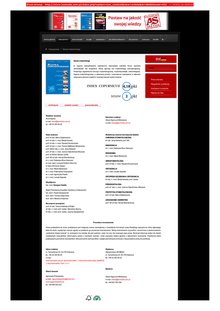 Zrzut strony: http://www.asmedia.com.pl/index.php?option=com_content&view=article&id=586&Itemid=432 strona główna czasopisma Czasopisma prenumerata książki wydarzenia dla reklamodawców dla autorów polecamy kontakt <--kliknij na adresie ftp Sztuka Implantologii Sztuka Implantologii to wysoce specjalistyczne czasopismo stanowiące szerokie forum wymiany doświadczeń dla wszystkich, którzy zajmują się implantologią stomatologiczną. Prezentuje zagadnienia chirurgii implantologicznej, implantoprotetyki, osteointegracji, higieny implantologicznej, a zwłaszcza porady i nowoczesne rozwiązania w zakresie utrzymania zdrowia miękkich i twardych tkanek wokół implantu. szukaj... Prenumerata Regulamin publikacji Archiwum numerów Napisz do Nas archiwum ostatni numer prenumerata Redaktor naczelna Anna Spyrka e-mail: [email protected] tel. +48 32 355 06 20 Sekretarz redakcji Oliwia Sigmund-Miśkiewicz e-mail: [email protected] Rada naukowa prof. dr hab. Maria Gołębiewska prof. dr hab. n. med. Beata Kawala prof. dr hab. n. med. Ryszard Koczorowski prof. dr hab. n. med. Teresa Matthews-Brzozowska prof. UM dr hab. n. med. Jerzy Sokalski prof. dr hab. n. med. Joanna Wysokińska-Miszczuk prof. dr William Becker (USA) prof. UE dr hab. Henryk Brandenburg dr n. med. Katarzyna Brus-Sawczuk dr med. dent. Leonard Kożdoń (Niemcy) dr Zeev Ormianer (Izrael) dr n. med. Marek Bladowski dr n. med. Przemysław Kopczyński dr n. med. Agnieszka Pawlik dr n. med. Leszek Szywała Redaktorzy naukowi (tematyczni) działów CHIRURGIA STOMATOLOGICZNA dr hab. Jerzy Sokalski prof. UM ENDODONCJA dr n. med. Katarzyna Brus-Sawczuk ERGONOMIA dr n. med. Marek Bladowski GEROSTOMATOLOGIA prof. dr hab. n. med. Ryszard Koczorowski ORTODONCJA dr n. med. Leszek Szywała ORTOPEDIA SZCZEKOWA I ORTODONCJA dr hab. n. med. Beata Kawala, prof. nadzw. Współpraca lek. med. Grzegorz Hudzik, PERIODONTOLOGIA prof. dr. hab. n. med. Joanna Wysokińska–Miszczuk Śląski Państwowy Inspektor Sanitarny w Katowicach lek. stom. Paweł Szczepaniak tech. dent. Tomasz Dąbrowski tech. dent. Marzena Kotyńska PROTETYKA STOMATOLOGICZNA prof. dr hab. Maria Gołębiewska ZARZADZANIE I MARKETING prof. UE dr hab. Henryk Brandenburg Recenzenci zewnętrzni prof. dr hab. Teresa Katarzyna Różyło dr hab. n. med. prof. nadzw. Stanisław Sporny dr hab. n. med. prof. nadzw. Joanna Szczepańska Procedura recenzowania Praca przekazana do druku poddawana jest wstępnej ocenie wewnętrznej o charakterze formalnym przez Redakcję czasopisma. Autor zgłaszając tekst do druku, wyraża tym samym zgodę na poddanie go procesowi recenzowania. Teksty recenzowane są poufnie i anonimowo z zastosowaniem „podwójnie ślepej recenzji”, tj. recenzenci nie wiedzą, kto jest autorem, autor nie wie, kto recenzuje jego pracę. Recenzji dokonuje jeden lub dwóch niezależnych recenzentów. Informujemy autora o wynikach recenzji i autor poprawia artykuł zgodnie z zaleceniami recenzenta. Poprawiony tekst przekazujemy ponownie recenzentowi, który ponownie opiniuje tekst i wydaje jednoznaczny wniosek o dopuszczenie pracy do publikacji. Adres redakcji ul. Tymiankowa 23, 40-750 Katowice tel. +48 32 355 06 20 e-mail: www.asmedia.com.pl'; document.write( '' ); document.write( addy_text49232 ); document.write( '<\/a>' ); //--> Wydawca Wydawnictwo AS MEDIA ul. Tymiankowa 23, 40-750 Katowice tel. +48 32 355 06 20 Reklama Skład i łamanie Agnieszka Prokopenko e-mail: [email protected] www.agaprokopenko.pl tel. +48 695 922 027 Oliwia Sigmund-Miśkiewicz e-mail: [email protected] tel. +48 602 706 399 Zrzut strony: http://www.asmedia.com.pl/index.php?option=com_content&view=article&id=586&Itemid=432 <--kliknij na adresie Półrocznik, koszt prenumeraty rocznej 50 zł Księgarnia K o nta k t O wyd a wni c twi e Wydawnictwo AS MEDIA ul. Tymiankowa 23, 40-750 Katowice tel. (0-32) 355 06 20, +48(032) 355 06 21 e-mail: [email protected] Wydawnictwo AS MEDIA działa na rynku branży medycznej od 2003 roku. Jesteśmy wydawcą czterech specjalistycznych czasopism z zakresu stomatologii i implantologii, oferujemy również literaturę światowej klasy. Na s k ró ty Prenumerata Książki Koszyk
