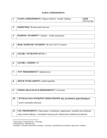 KARTA PRZEDMIOTU 1. NAZWA PRZEDMIOTU: Zajęcia ruchowe