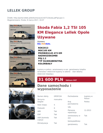 LELLEK GROUP Źródło: http://portal.lellek.pl/lel/komis/auto14273,Skoda.pdf?grupa=1 Wygenerowano: Środa, 8 marca 2017, 19:37 Skoda Fabia 1,2 TSI 105 KM Elegance Lellek Opole Używane Używany Das WeltAuto. ROK2013 MOC105 KM PRZEBIEG145 473 KM NADWOZIEKOMBI POJ.1.2 TYP SILNIKABENZYNA KOLORBIAŁY kupiony w polsce serwisowany w aso garażowany książka serwisowa I właściciel kupiony w salonie stan idealny właściciel niepalący 31 600 PLN faktura VAT Dane samochodu i wyposażenie Numer oferty OPOFC04 Skrzynia biegów manualna Ilość miejsc 5 Poduszki 6 ABS Tak ESP Tak ASR (kontrola trakcji) Tak Klimatyzacja Tak Pochodzenie kupiony w Polsce Kraj pochodzenia Polska VIN Pierwsza rejestracja 11-2013 serwisowany w aso Tak bezwypadkowy garażowany Tak Elektryczne szyby Tak książka serwisowa Tak Elektryczne lusterka Tak I właściciel Tak Tak kupiony w salonie Tak Wspomaganie kierownicy Komputer Tak Radioodtwarza cz Tak Immobilizer Tak Centralny zamek Tak Światła przeciwmgieln e Tak Czujniki parkowania Tak Kierownica wielofunkcyjna Tak Podgrzewane fotele Tak Tempomat Tak Alufelgi Tak Miejsce postoju Opole Sławice tunning homologacja stan idealny Tak właściciel niepalący Tak Opis dodatkowy Samochód sprzedajemy w programie Das WeltAuto, co oznacza, że został szczegółowo sprawdzony poprzez przegląd 117 punktów oceny stanu technicznego w naszym ASO. Kupując go, otrzymujesz certyfikat jakości oraz 12 - miesięczną gwarancję Das WeltAuto. O dodatkowych korzyściach Das WeltAuto możesz przeczytać w dolnej części ogłoszenia: Korzyści Das WeltAuto: 1) Wyselekcjonowane samochody Sprzedajemy tylko starannie wyselekcjonowane pojazdy. Aby jeszcze bardziej zwiększyć pewność i obniżyć ryzyko zakupu, pod marką Das WeltAuto oferowane są tylko najlepsze samochody. Oferując wyłącznie najlepsze samochody, możemy być pewni Państwa satysfakcji. 2) Sprawdzony przebieg i pochodzenie Znamy dokładnie przebieg i pochodzenie naszych samochodów, dzięki czemu jesteśmy w stanie zagwarantować ich niezawodność oraz Państwa zadowolenie. 3) Sprawdzony stan techniczny Zanim nasze samochody trafią do sprzedaży, muszą przejść bardzo długą drogę. Każde z aut jest wyczerpująco sprawdzane – przechodzi szczegółową, zawierającą aż 117 punktów listę kontrolną. Jest to najlepszy sposób pozwalający nam zagwarantować wysoką jakość Das WeltAuto. 4) Profesjonalne przygotowanie auta Dokładne sprawdzenie stanu technicznego to połowa sukcesu. Jeśli sprzedawany przez nas samochód wymaga jakiegoś usprawnienia, możesz mieć pewność, że zostało ono wykonane w profesjonalny sposób. Chcemy, aby wrażenia z jazdy były od samego początku wyjątkowe. 5) Jazda próbna Dajemy możliwość poznania z bliska każdego auta. Z uwagi na to, że decydującym argumentem przy zakupie samochodu jest jazda próbna, umożliwiamy indywidualne przetestowanie każdego z naszych aut. Wiemy, że niektórzy podejmują za kierownicą bardzo ważne decyzje. 6) Gwarancja Gwarantujemy nie tylko zadowolenie, ale również wysoką jakość. Aby zdobyć zaufanie naszych Klientów, na każdy samochód Das WeltAuto udzielamy gwarancji, która zabezpiecza przed ryzykiem związanym z kupnem auta i pozwala cieszyć się bezproblemową eksploatacją. 7) Dedykowane opcje finansowania Znamy się nie tylko na samochodach, ale również na kredytach. Klienci Das WeltAuto mają dostęp do atrakcyjnych form finansowania oraz ubezpieczeń oferowanych przez Volkswagen Bank. Dzięki temu Klient zyskuje pewność doskonałych rozwiązań finansowych na korzystnych warunkach. 8) Samochód w rozliczeniu Pomagamy, sprzedajemy. W sytuacji, w której Klient jest zainteresowany nabyciem nowszego auta, może oddać stary samochód w rozliczeniu. Zaproponujemy za niego korzystną cenę i zagwarantujemy, że trafi w dobre ręce. 9) Prawo do wymiany Zapewniamy dużą swobodę wyboru. Jeśli Klient będzie niezadowolony ze swojej decyzji, umożliwiamy wymianę samochodu w ciągu tygodnia od jego zakupu. Dzięki takiemu rozwiązaniu mamy pewność, że każdy kupujący podejmie słuszną decyzję i wyjedzie z naszego salonu pojazdem, którego szukał. 10) Personalizacja pojazdu Klient może dostosować używany samochód do własnych potrzeb oraz dodać do niego nowe elementy wyposażenia. 11) Gwarancja mobilności W obszarze usług serwisowania samochód zastępczy oferowany jest w standardzie. Informacja nie stanowi oferty w rozumieniu art. 66 kc. Podane dane maja charakter wyłącznie informacyjny. ZAPIS TEN ZOSTAŁ ZAWARTY ZE WZGLĘDU NA MOŻLIWOŚĆ NIE ZAMIERZONYCH POMYŁEK Nota prawna Informacja nie stanowi oferty w rozumieniu art. 66 Kodeksu Cywilnego. Podane dane mają charakter wyłącznie informacyjny. Pełna informacja dostępna jest u handlowca. Sprzedający nie odpowiada za ewentualne błędy lub nieaktualność ogłoszenia. Handlowiec Artur Rączkowski 77 400 70 22 zapytaj mobile +48 667 000 637 Gwarancja Gwarancja dostępna Ubezpieczenie Ubezpieczenie dostępne Kredyt Kredyt dostępny Zeskanuj kod, aby zobaczyć ofertę online