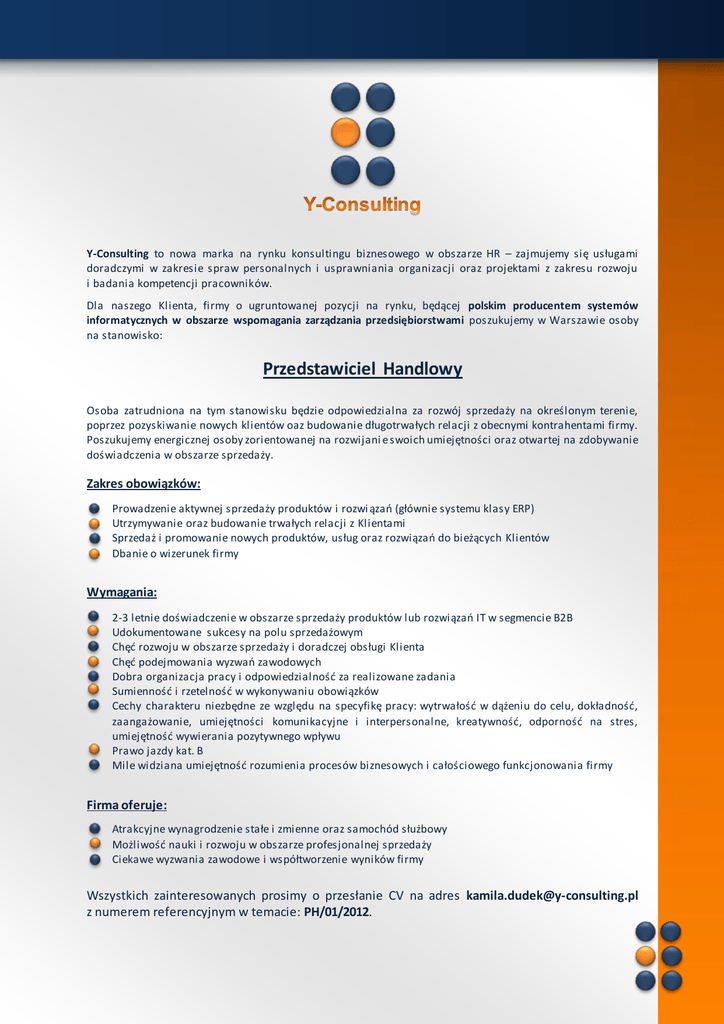 Y-Consulting to nowa marka na rynku konsultingu biznesowego w obszarze HR – zajmujemy się usługami doradczymi w zakresie spraw personalnych i usprawniania organizacji oraz projektami z zakresu rozwoju i badania kompetencji pracowników. Dla naszego Klienta, firmy o ugruntowanej pozycji na rynku, będącej polskim producentem systemów informatycznych w obszarze wspomagania zarządzania przedsiębiorstwami poszukujemy w Warszawie osoby na stanowisko: Przedstawiciel Handlowy Osoba zatrudniona na tym stanowisku będzie odpowiedzialna za rozwój sprzedaży na określonym terenie, poprzez pozyskiwanie nowych klientów oaz budowanie długotrwałych relacji z obecnymi kontrahentami firmy. Poszukujemy energicznej osoby zorientowanej na rozwijani e swoich umiejętności oraz otwartej na zdobywanie doświadczenia w obszarze sprzedaży. Zakres obowiązków: Prowadzenie aktywnej sprzedaży produktów i rozwi ązao (głównie systemu klasy ERP) Utrzymywanie oraz budowanie trwałych relacji z Klientami Sprzedaż i promowanie nowych produktów, usług oraz rozwiązao do bieżących Klientów Dbanie o wizerunek firmy Wymagania: 2-3 letnie doświadczenie w obszarze sprzedaży produktów lub rozwiązao IT w segmencie B2B Udokumentowane sukcesy na polu sprzedażowym Chęd rozwoju w obszarze sprzedaży i doradczej obsługi Klienta Chęd podejmowania wyzwao zawodowych Dobra organizacja pracy i odpowiedzialnośd za realizowane zadania Sumiennośd i rzetelnośd w wykonywaniu obowiązków Cechy charakteru niezbędne ze względu na specyfikę pracy: wytrwałośd w dążeniu do celu, dokładnośd, zaangażowanie, umiejętności komunikacyjne i interpersonalne, kreatywnośd, odpornośd na stres, umiejętnośd wywierania pozytywnego wpływu Prawo jazdy kat. B Mile widziana umiejętnośd rozumienia procesów biznesowych i całościowego funkcjonowania firmy Firma oferuje: Atrakcyjne wynagrodzenie stałe i zmienne oraz samochód służbowy Możliwośd nauki i rozwoju w obszarze profesjonalnej sprzedaży Ciekawe wyzwania zawodowe i współtworzenie wyników firmy Wszystkich zainteresowanych prosimy o przesłanie CV na adres [email protected] z numerem referencyjnym w temacie: PH/01/2012.