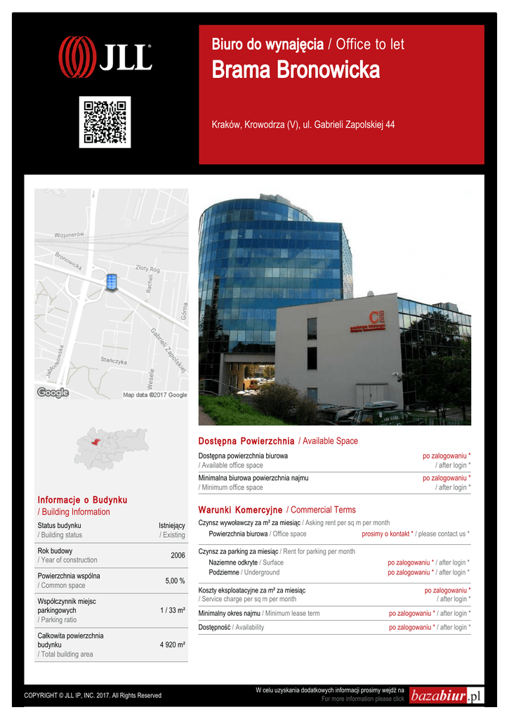 Biuro do wynajęcia / Office to let Brama Bronowicka Kraków, Krowodrza (V), ul. Gabrieli Zapolskiej 44 Dostępna Powierzchnia / Available Space Informacje o Budynku / Building Information Status budynku / Building status Dostępna powierzchnia biurowa / Available office space po zalogowaniu * / after login * Minimalna biurowa powierzchnia najmu / Minimum office space po zalogowaniu * / after login * Warunki Komercyjne / Commercial Terms Istniejący / Existing Rok budowy / Year of construction 2006 Powierzchnia wspólna / Common space 5,00 % Czynsz wywoławczy za m² za miesiąc / Asking rent per sq m per month Powierzchnia biurowa / Office space prosimy o kontakt * / please contact us * Czynsz za parking za miesiąc / Rent for parking per month Naziemne odkryte / Surface Podziemne / Underground po zalogowaniu * / after login * po zalogowaniu * / after login * Koszty eksploatacyjne za m² za miesiąc / Service charge per sq m per month Współczynnik miejsc parkingowych / Parking ratio 1 / 33 m² Całkowita powierzchnia budynku / Total building area 4 920 m² COPYRIGHT © JLL IP, INC. 2017. All Rights Reserved po zalogowaniu * / after login * Minimalny okres najmu / Minimum lease term po zalogowaniu * / after login * Dostępność / Availability po zalogowaniu * / after login * W celu uzyskania dodatkowych informacji prosimy wejdź na For more information please click Dostępna Powierzchnia / Available Space Piętro / Floor Powierzchnia wolna / Vacant space Dostępność / Availability 0-0 prosimy o kontakt * / please contact us * prosimy o kontakt * / please contact us * 1 prosimy o kontakt * / please contact us * prosimy o kontakt * / please contact us * 8 prosimy o kontakt * / please contact us * prosimy o kontakt * / please contact us * Razem / Total po zalogowaniu * / after login * Standardowe Wykończenie / Standard Fit-Out Typowy Plan Piętra / Typical Floor Plan Klimatyzacja / Air conditioning Podnoszone podłogi / Raised floor Podwieszany sufit / Suspended ceiling Okablowanie telefoniczne / Telephone cabling Okablowanie komputerowe / Computer cabling Okablowanie elektryczne / Power cabling Tryskacze / Sprinklers Czujniki dymu / Smoke detectors Wykładzina / Carpeting Podział powierzchni ściankami / Wall partitioning Recepcja / Reception Ochrona budynku / Security Kable światłowodowe / Fiber optics Kontrola dostępu do budynku / Access control Uchylne okna / Openable windows Dwustronne zasilanie / Emergency power supply BMS / BMS W celu uzyskania dodatkowych informacji lub zorganizowania spotkania prosimy o kontakt: / For more information or to arrange a viewing please contact: +48 12 294 94 30 Niniejsze warunki mają charakter wyłącznie informacyjny i nie stanowią części wiążącej oferty lub umowy. / The Property Particulars are for information purposes only and do not form any part of binding offer or contract. COPYRIGHT © JLL IP, INC. 2017. All Rights Reserved W celu uzyskania dodatkowych informacji prosimy wejdź na For more information please click
