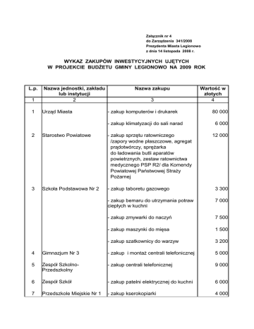 Załącznik nr 4 do Zarządzenia 341/2008 Prezydenta Miasta Legionowo z dnia 14 listopada 2008 r. WYKAZ ZAKUPÓW INWESTYCYJNYCH UJĘTYCH W PROJEKCIE BUDŻETU GMINY LEGIONOWO NA 2009 ROK L.p. 1 1 Nazwa jednostki, zakładu lub instytucji 2 Urząd Miasta Nazwa zakupu 3 - zakup komputerów i drukarek - zakup klimatyzacji do sali narad Wartość w złotych 4 80 000 6 000 12 000 2 Starostwo Powiatowe - zakup sprzętu ratowniczego /zapory wodne płaszczowe, agregat prądotwórczy, sprężarka do ładowania butli aparatów powietrznych, zestaw ratownictwa medycznego PSP R2/ dla Komendy Powiatowej Państwowej Straży Pożarnej 3 Szkoła Podstawowa Nr 2 - zakup taboretu gazowego 3 300 - zakup bemaru do utrzymania potraw ciepłych w kuchni 7 000 - zakup zmywarki do naczyń 7 500 - zakup maszynki do mięsa 1 500 - zakup szatkownicy do warzyw 3 200 4 Gimnazjum Nr 3 - zakup i montaż centrali telefonicznej 5 000 5 Zespół SzkolnoPrzedszkolny - zakup centrali telefonicznej 9 000 6 Zespół Szkół - zakup patelni elektrycznej do kuchni 6 000 7 Przedszkole Miejskie Nr 1 - zakup kserokopiarki 4 000 8 Przedszkole Miejskie Nr 5 - zakup szafy chłodniczej 3 800 9 Przedszkole Miejskie Nr 7 - zakup zmywarki z wyparzaczem 4 500 - zakup wyposażenia kuchni 10 11 Przedszkole Miejskie Nr 9 - zakup klimatyzacji do magazynu żywnościowego 4 300 - zakup stołów i blatów do kuchni 11 300 Przedszkole Miejskie Nr 10 - zakup patelni elektrycznej - zakup maszynki do mielenia 12 13 Przedszkole Miejskie Nr 12 - zakup zmywarki do naczyń Ośrodek Pomocy Społecznej 10 000 5 000 3 500 5 120 - zakup szatkownicy do warzyw 3 900 - zakup szafy chłodniczej 6 600 - zakup samochodu 50 000 - zakup i wdrożenie Elektronicznego Obiegu Dokumentów 53 000 14 Żłobek Miejski - zakup i instalacja klimatyzatora 10 000 15 Muzeum Historyczne - zakup namiotów na imprezy plenerowe 10 000 16 Miejski Ośrodek Kultury - zakup samochodu dostawczego 50 000 RAZEM 375 520 wz Prezydenta Miasta Piotr Zadrożny Zastępca Prezydenta