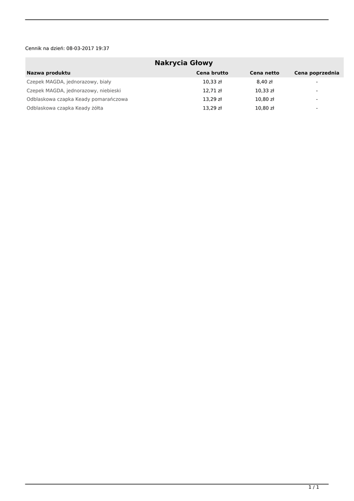 Cennik na dzień: 08-03-2017 19:37 Nakrycia Głowy Nazwa produktu Cena brutto Cena netto Cena poprzednia Czepek MAGDA, jednorazowy, biały 10,33 zł 8,40 zł - Czepek MAGDA, jednorazowy, niebieski 12,71 zł 10,33 zł - Odblaskowa czapka Keady pomarańczowa 13,29 zł 10,80 zł - Odblaskowa czapka Keady żółta 13,29 zł 10,80 zł - 1/1 Powered by TCPDF (www.tcpdf.org)