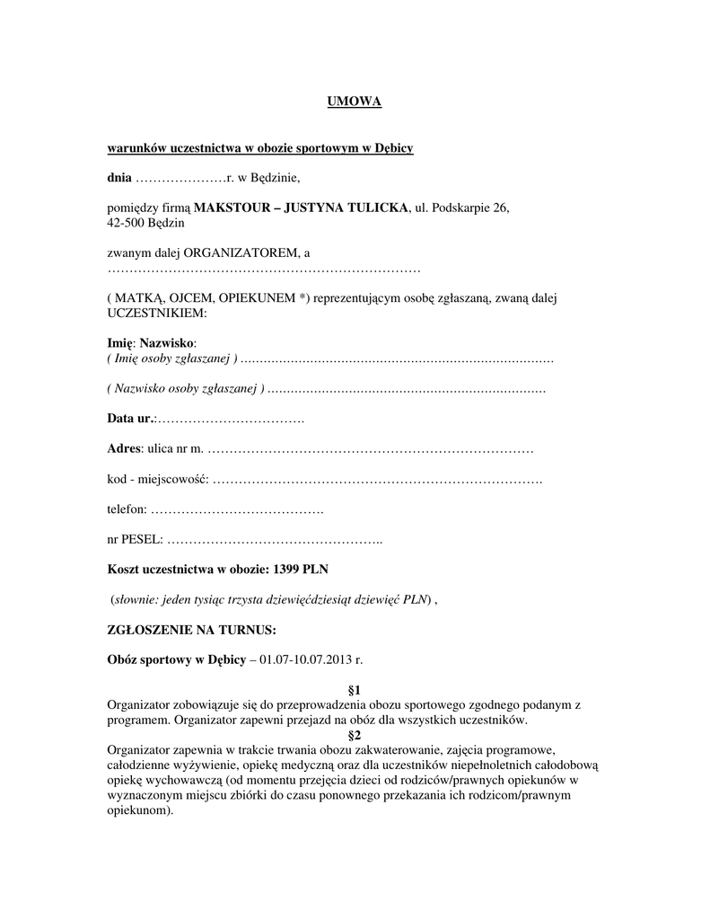 UMOWA warunków uczestnictwa w obozie sportowym w D bicy dnia …………………r. w B dzinie, pomi dzy firm MAKSTOUR – JUSTYNA TULICKA, ul. Podskarpie 26, 42-500 B dzin zwanym dalej ORGANIZATOREM, a ……………………………………………………………… ( MATK , OJCEM, OPIEKUNEM *) reprezentuj cym osob zgłaszan , zwan dalej UCZESTNIKIEM: Imi : Nazwisko: ( Imi osoby zgłaszanej ) ……………………………………………………………………… ( Nazwisko osoby zgłaszanej ) ……………………………………………………………… Data ur.:……………………………. Adres: ulica nr m. ………………………………………………………………… kod - miejscowo : …………………………………………………………………. telefon: …………………………………. nr PESEL: ………………………………………….. Koszt uczestnictwa w obozie: 1399 PLN (słownie: jeden tysi c trzysta dziewi dziesi t dziewi PLN) , ZGŁOSZENIE NA TURNUS: Obóz sportowy w D bicy – 01.07-10.07.2013 r. §1 Organizator zobowi zuje si do przeprowadzenia obozu sportowego zgodnego podanym z programem. Organizator zapewni przejazd na obóz dla wszystkich uczestników. §2 Organizator zapewnia w trakcie trwania obozu zakwaterowanie, zaj cia programowe, całodzienne wy ywienie, opiek medyczn oraz dla uczestników niepełnoletnich całodobow opiek wychowawcz (od momentu przej cia dzieci od rodziców/prawnych opiekunów w wyznaczonym miejscu zbiórki do czasu ponownego przekazania ich rodzicom/prawnym opiekunom). §3 Niepełnoletni uczestnik mo e zosta przyj ty na obóz TYLKO I WYŁ CZNIE na podstawie poprawnie wypełnionej i podpisanej Karty Kwalifikacyjnej dostarczonej organizatorowi przed rozpocz ciem obozu. §4 Uczestnik wnosi pełn opłat z tytułu uczestnictwa w obozie do dnia 01.06.2013 r. Uczestnik zobowi zuje si do dokonania wpłaty zaliczki w okre lonym terminie, w celu zarezerwowania sobie miejsca na udział w obozie i na przejazd. W przypadku rezygnacji z udziału w obozie zaliczka jest bezzwrotna – podlega zwrotowi tylko w przypadku odwołania imprezy z winy organizatora. Koszty rezygnacji z obozu: - do 30 dni przed rozpocz ciem obozu potr cana jest kwota 500zł jako koszty zaliczkowe zwi zane z rezerwacj o rodka - przy rezygnacji krótszej ni 14 dni od rozpocz cia obozu potr cane jest 100% ceny. §5 Uczestnik zostanie ubezpieczony od nast pstw nieszcz liwych wypadków na czas trwania obozu przez organizatora. Je li uczestnik jest osob niepełnoletni , w razie wypadku lub nagłej choroby, rodzice zostan powiadomieni na adres wg danych podanych w Karcie Kwalifikacyjnej. §6 Uczestnik zobowi zany jest do przestrzegania polece organizatora zwi zanych z uczestnictwem w obozie, a w szczególno ci Regulaminu Obozu i stanowi jej integraln cz . W razie niesubordynacji, na wniosek organizatora, uczestnik mo e zosta skre lony z listy uczestników obozu bez zwrotu kosztów uczestnictwa w obozie. W przypadku osób niepełnoletnich, rodzice zobowi zani s wówczas do natychmiastowego odebrania dziecka z miejsca pobytu na własny koszt. §7 Wszystkie zmiany niniejszej umowy wymagaj formy pisemnej. §8 W sprawach nie unormowanych umow stosowane b d ogólnie obowi zuj ce przepisy, a w tym Kodeks Cywilny. §9 Niniejsza umowa została sporz dzona w dwóch jednobrzmi cych egzemplarzach, po jednym dla ka dej ze stron. ……………………………….. (Organizator) ….......…………………………….. (data i czytelny podpis rodziców uczestnika niepełnoletniego)