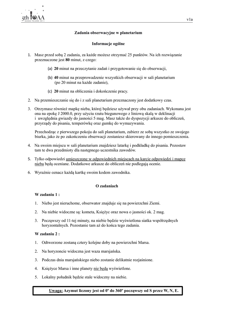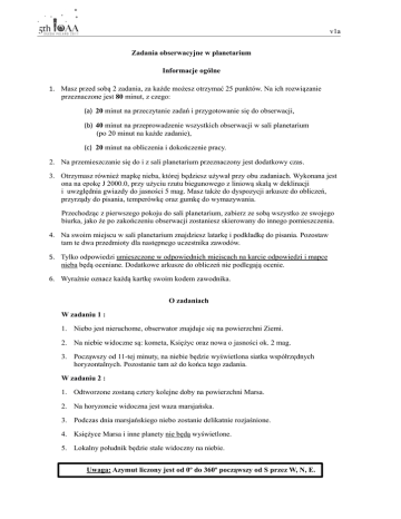 Kod zawodnika: v1a Zadania obserwacyjne w planetarium Informacje ogólne 1. Masz przed sobą 2 zadania, za każde możesz otrzymać 25 punktów. Na ich rozwiązanie przeznaczone jest 80 minut, z czego: (a) 20 minut na przeczytanie zadań i przygotowanie się do obserwacji, (b) 40 minut na przeprowadzenie wszystkich obserwacji w sali planetarium (po 20 minut na każde zadanie), (c) 20 minut na obliczenia i dokończenie pracy. 2. Na przemieszczanie się do i z sali planetarium przeznaczony jest dodatkowy czas. 3. Otrzymasz również mapkę nieba, której będziesz używał przy obu zadaniach. Wykonana jest ona na epokę J 2000.0, przy użyciu rzutu biegunowego z liniową skalą w deklinacji i uwzględnia gwiazdy do jasności 5 mag. Masz także do dyspozycji arkusze do obliczeń, przyrządy do pisania, temperówkę oraz gumkę do wymazywania. Przechodząc z pierwszego pokoju do sali planetarium, zabierz ze sobą wszystko ze swojego biurka, jako że po zakończeniu obserwacji zostaniesz skierowany do innego pomieszczenia. 4. Na swoim miejscu w sali planetarium znajdziesz latarkę i podkładkę do pisania. Pozostaw tam te dwa przedmioty dla następnego uczestnika zawodów. 5. Tylko odpowiedzi umieszczone w odpowiednich miejscach na karcie odpowiedzi i mapce nieba będą oceniane. Dodatkowe arkusze do obliczeń nie podlegają ocenie. 6. Wyraźnie oznacz każdą kartkę swoim kodem zawodnika. O zadaniach W zadaniu 1 : 1. Niebo jest nieruchome, obserwator znajduje się na powierzchni Ziemi. 2. Na niebie widoczne są: kometa, Księżyc oraz nowa o jasności ok. 2 mag. 3. Począwszy od 11-tej minuty, na niebie będzie wyświetlona siatka współrzędnych horyzontalnych. Pozostanie tam aż do końca tego zadania. W zadaniu 2 : 1. Odtworzone zostaną cztery kolejne doby na powierzchni Marsa. 2. Na horyzoncie widoczna jest waza marsjańska. 3. Podczas dnia marsjańskiego niebo zostanie delikatnie rozjaśnione. 4. Księżyce Marsa i inne planety nie będą wyświetlone. 5. Lokalny południk będzie stale widoczny na niebie. Uwaga: Azymut liczony jest od 0º do 360º począwszy od S przez W, N, E. Kod zawodnika: v1a Zadania obserwacyjne w planetarium 1. Ziemia A) Na dołączonej mapie nieba zaznacz krzyżykiem i oznacz literą „N” nową. Zaznacz także Księżyc (użyj symbolu Księżyca) oraz naszkicuj kształt i położenie komety. B) W poniższej tabeli zakreśl tylko te obiekty, które znajdują się nad horyzontem astronomicznym. Uwaga: za każdą błędną odpowiedź stracisz jeden punkt. M 20 – Mgławica Trójlistna Koniczyna o Cet – Mira δ CMa – Wezen α Cyg – Deneb M 57 – Mgławica Pierścień β Per – Algol δ Cep – Alrediph α Boo – Arktur M 44 – Praesepe (Żłóbek, Gromada Ul) C) Kiedy siatka współrzędnych będzie widoczna, zaznacz na mapie północną część lokalnego południka (od zenitu do horyzontu) oraz północny biegun ekliptyczny (krzyżykiem oraz literą „P”). D) Dla wyświetlanego nieba podaj: szerokość geograficzną obserwatora: φ=........., miejscowy czas gwiazdowy: θ=........., zakreśl miesiąc odpowiadający dacie odtwarzanej nocy: Styczeń, Luty, Marzec, Kwiecień, Maj, Lipiec, Sierpień, Wrzesień, Październik, Listopad, Czerwiec, Grudzień. E) Podaj nazwy obiektów, których przybliżone współrzędne horyzontalne wynoszą: azymut A 1 = 45 º i wysokość h 1 = 58 º : ........................ , azymut A 2 = 278 º i wysokość h 2 = 20 º : ........................ . (W miarę możliwości użyj oznaczeń Bayera, skrótów Międzynarodowej Unii Astronomicznej lub numerów Messiera, albo nazw łacińskich lub angielskich) F) Podaj współrzędne horyzontalne (azymut i wysokość): Syriusza (α CMa): A3 = . . . . . . . . . . . ; h3 = . . . . . . . . . . . . Galaktyki w Andromedzie (M 31): A4 = . . . . . . . . . . . ; h4 = . . . . . . . . . . . . G) Podaj współrzędne równikowe gwiazdy wskazywanej na niebie czerwoną strzałką: α=................; δ=................ Kod zawodnika: v1a 2. Mars H) Podaj szerokość areograficzną (marsjańską) obserwatora: φ = . . . . . . . . I) Podaj wysokość nad horyzontem gwiazd w górnej (hu) i dolnej (hl) kulminacji: Polluks (β Gem) : hu = . . . . . . . . . . ; hl = . . . . . . . . . . , Deneb (α Cyg) hl = . . . . . . . . . . , hu = . . . . . . . . . . ; J) Podaj areocentryczną (marsjańską) deklinację gwiazd: Regulus (α Leo) δ=.......... . Toliman (α Cen) δ=.......... . K) Zilustruj na poniższych diagramach swój tok rozumowania w zadaniach (I) i (J): Zenit S Zenit N ● S N ● Nadir Nadir L) Na mapie nieba zaznacz krzyżykiem i oznacz literą „M” marsjański północny biegun nieba. M) Podaj azymut obserwatora widzianego z bazy marsjańskiej: A=......... . N) Określ położenie bazy na powierzchni Marsa, zakreślając właściwą odpowiedź: a. w pobliżu równika b. w pobliżu północnego zwrotnika c. w pobliżu północnego koła podbiegunowego d. w pobliżu bieguna północnego O) Poniższa oś czasu przedstawia rok marsjański z zaznaczonymi porami roku na półkuli północnej. Zaznacz na osi datę odpowiadającą sytuacji odtwarzanej w planetarium. wiosna lato jesień zima t