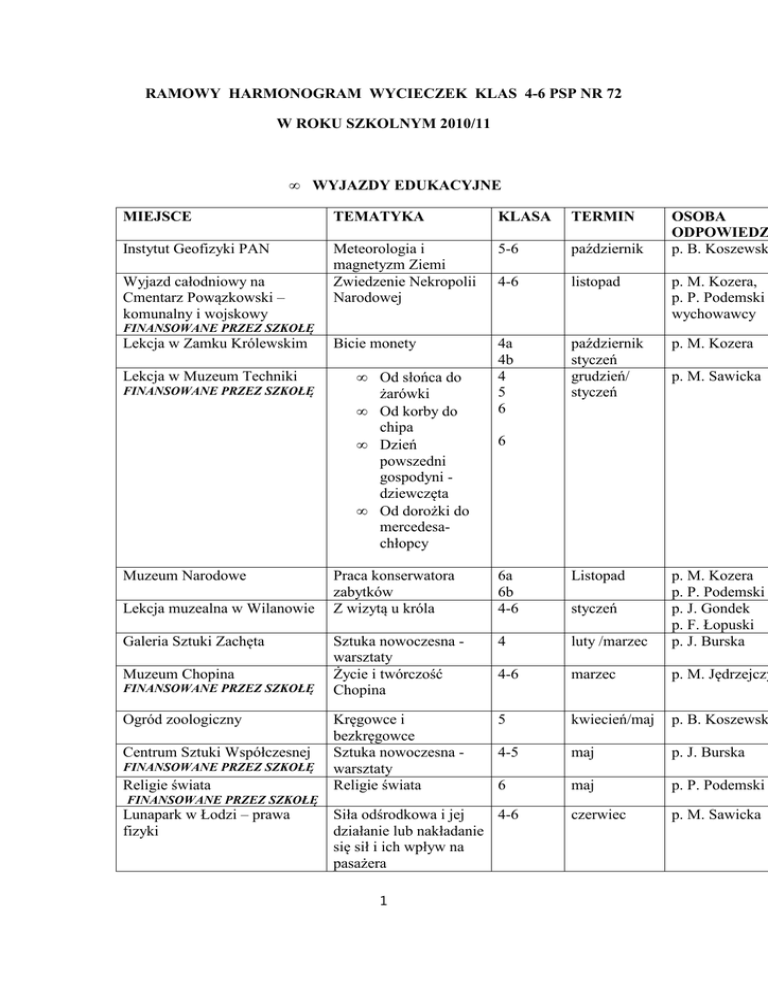 RAMOWY HARMONOGRAM WYCIECZEK KLAS 4-6 PSP NR 72 W ROKU SZKOLNYM 2010/11 • WYJAZDY EDUKACYJNE MIEJSCE TEMATYKA KLASA TERMIN Instytut Geofizyki PAN Meteorologia i magnetyzm Ziemi Zwiedzenie Nekropolii Narodowej 5-6 październik 4-6 listopad p. M. Kozera, p. P. Podemski wychowawcy Bicie monety 4a 4b 4 5 6 październik styczeń grudzień/ styczeń p. M. Kozera Wyjazd całodniowy na Cmentarz Powązkowski – komunalny i wojskowy OSOBA ODPOWIEDZ p. B. Koszewsk FINANSOWANE PRZEZ SZKOŁĘ Lekcja w Zamku Królewskim Lekcja w Muzeum Techniki • FINANSOWANE PRZEZ SZKOŁĘ • • • Muzeum Narodowe Lekcja muzealna w Wilanowie Galeria Sztuki Zachęta Muzeum Chopina FINANSOWANE PRZEZ SZKOŁĘ Ogród zoologiczny Centrum Sztuki Współczesnej FINANSOWANE PRZEZ SZKOŁĘ Religie świata Od słońca do żarówki Od korby do chipa Dzień powszedni gospodyni dziewczęta Od dorożki do mercedesachłopcy p. M. Sawicka 6 Praca konserwatora zabytków Z wizytą u króla 6a 6b 4-6 Listopad Sztuka nowoczesna warsztaty Życie i twórczość Chopina 4 luty /marzec p. M. Kozera p. P. Podemski p. J. Gondek p. F. Łopuski p. J. Burska 4-6 marzec p. M. Jędrzejczy Kręgowce i bezkręgowce Sztuka nowoczesna warsztaty Religie świata 5 kwiecień/maj p. B. Koszewsk 4-5 maj p. J. Burska 6 maj p. P. Podemski czerwiec p. M. Sawicka styczeń FINANSOWANE PRZEZ SZKOŁĘ Lunapark w Łodzi – prawa fizyki Siła odśrodkowa i jej 4-6 działanie lub nakładanie się sił i ich wpływ na pasażera 1 • ZIELONA SZKOŁA MIEJSCE TEMAT KLASY TERMIN Kaszuby Tatry Polskie i Słowackie Wyjazd edukacyjny Wyjazd krajoznawczo integracyjny 4-6 4-6 wrzesień 11-15 kwietnia • STOWARZYSZENIE „NOWE HORYZONTY” – WARSZTATY FILMOWE DLA UCZNIÓW , KTÓRZY ZAPISALI SIĘ NA POCZĄTKU ROKU SZKOLNEGO. OSOBA ODPOWIEDZIALNA - P. E.KAMIŃSKA. TYTUŁ Krokodyle z przedmieścia Orps Święta Karli Indianin Max Minski Pelikan Kameleon powraca Zoomers Mów mi Axel TERMIN 27 października 29 listopada 17 grudnia 18 stycznia 07 lutego 14 marca 14 kwietnia 11 maja 06 czerwca • WYJŚCIA WIECZORNE 2 OSOBA ODPOWIEDZ p. B. Koszewsk P. B. Koszewsk MIEJSCE TEMATYKA KLASA TERMIN Opera Narodowa – wieczorne wyjście Filharmonia Narodowa Wesele Figara 4-6 grudzień OSOBA ODPOWIEDZIALNA p. M. Jędrzejczyk Orkiestry świata 4-6 luty p. M. Jędrzejczyk Powyższy harmonogram ma charakter ramowy i może ulec zmianie. 3