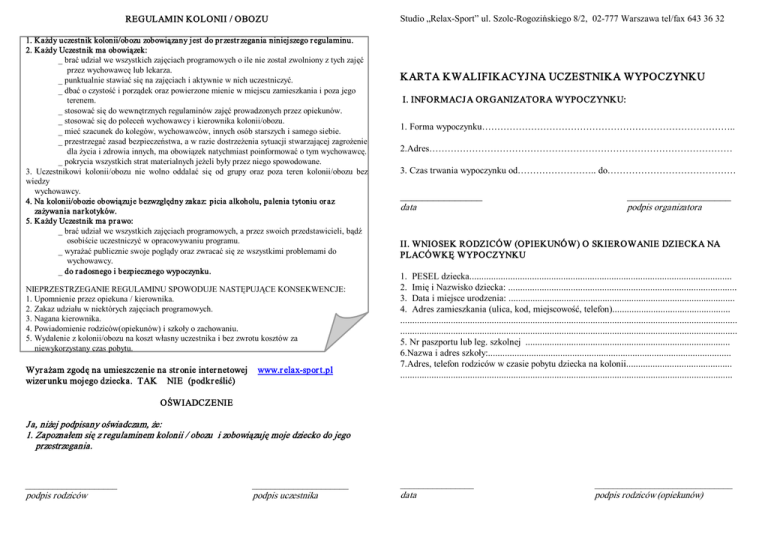 REGULAMIN KOLONII / OBOZU 1. Każdy uczestnik kolonii/obozu zobowiązany jest do pr zestr zegania niniejszego r egulaminu. 2. Każdy Uczestnik ma obowiązek: _ brać udział we wszystkich zajęciach programowych o ile nie został zwolniony z tych zajęć przez wychowawcę lub lekarza. _ punktualnie stawiać się na zajęciach i aktywnie w nich uczestniczyć. _ dbać o czystość i porządek oraz powierzone mienie w miejscu zamieszkania i poza jego terenem. _ stosować się do wewnętrznych regulaminów zajęć prowadzonych przez opiekunów. _ stosować się do poleceń wychowawcy i kierownika kolonii/obozu. _ mieć szacunek do kolegów, wychowawców, innych osób starszych i samego siebie. _ przestrzegać zasad bezpieczeństwa, a w razie dostrzeżenia sytuacji stwarzającej zagrożenie dla życia i zdrowia innych, ma obowiązek natychmiast poinformować o tym wychowawcę. _ pokrycia wszystkich strat materialnych jeżeli były przez niego spowodowane. 3. Uczestnikowi kolonii/obozu nie wolno oddalać się od grupy oraz poza teren kolonii/obozu bez wiedzy wychowawcy. 4. Na kolonii/obozie obowiązuje bezwzględny zakaz: picia alkoholu, palenia tytoniu or az zażywania nar kotyków. 5. Każdy Uczestnik ma pr awo: _ brać udział we wszystkich zajęciach programowych, a przez swoich przedstawicieli, bądź osobiście uczestniczyć w opracowywaniu programu. _ wyrażać publicznie swoje poglądy oraz zwracać się ze wszystkimi problemami do wychowawcy. _ do r adosnego i bezpiecznego wypoczynku. NIEPRZESTRZEGANIE REGULAMINU SPOWODUJE NASTĘPUJĄCE KONSEKWENCJE: 1. Upomnienie przez opiekuna / kierownika. 2. Zakaz udziału w niektórych zajęciach programowych. 3. Nagana kierownika. 4. Powiadomienie rodziców(opiekunów) i szkoły o zachowaniu. 5. Wydalenie z kolonii/obozu na koszt własny uczestnika i bez zwrotu kosztów za niewykorzystany czas pobytu. Wyr ażam zgodę na umieszczenie na str onie inter netowej www.r elaxspor t.pl wizer unku mojego dziecka. TAK NIE (podkr eślić) Studio „RelaxSport” ul. SzolcRogozińskiego 8/2, 02777 Warszawa tel/fax 643 36 32 KARTA KWALIFIKACYJ NA UCZESTNIKA WYPOCZYNKU I. INFORMACJ A ORGANIZATORA WYPOCZYNKU: 1. Forma wypoczynku……………………………………………………………………….. 2.Adres……………………………………………………………………………………… 3. Czas trwania wypoczynku od…………………….. do…………………………………… _______________ ___________________ data podpis organizatora II. WNIOSEK RODZICÓW (OPIEKUNÓW) O SKIEROWANIE DZIECKA NA PLACÓWKĘ WYPOCZYNKU 1. PESEL dziecka............................................................................................................. 2. Imię i Nazwisko dziecka: ............................................................................................... 3. Data i miejsce urodzenia: .............................................................................................. 4. Adres zamieszkania (ulica, kod, miejscowość, telefon)................................................. ............................................................................................................................................ ............................................................................................................................................ 5. Nr paszportu lub leg. szkolnej ..................................................................................... 6.Nazwa i adres szkoły:..................................................................................................... 7.Adres, telefon rodziców w czasie pobytu dziecka na kolonii............................................ .......................................................................................................................................... OŚWIADCZENIE J a, niżej podpisany oświadczam, że: 1. Zapoznałem się z regulaminem kolonii / obozu i zobowiązuję moje dziecko do jego przestrzegania. ____________________ podpis rodziców _____________________ podpis uczestnika ________________ ______________________________ data podpis rodziców (opiekunów) III . INFORMACJ A RODZICÓW(OPIEKUNÓW)O STANIE ZDROWIA (np: na co dziecko jest uczulone, jak znosi jazdę samochodem, czy pr zyjmuje stale leki i w jakich dawkach, czy nosi apar at or todontyczny lub okular y) ............................................................................................................................................. ............................................................................................................................................. ............................................................................................................................................. ………………………………………………………………………………………………… .............................................................................................................................................. VII. POTWIERDZENIE POBYTU DZIECKA NA WYPOCZYNKU Dziecko przebywa na ……………………………………........................................................................................ (forma i adres miejsca wypoczynku) od dnia………………………. do dnia…………………………………………………... ……………………….. …………………………………………... data czytelny podpis kierownika wypoczynku STWERDZAM, ZE PODALAM(EM WSZTSTKIE ZNANE MI INFORMACJE O DZIECKU, KTÓRE MOGĄ POMÓC A ZAPEWNIENIU WŁAŚCIWEJ OPIEKI DZIECKA W CZASIE TRAWANIA WYPOCZYNKU. …………………………… ……………………………………….. (data) (podpis matki, ojca lub opiekuna) IV. INFORMACJ A O SZCZEPIENIACH lub pr zedstawienie książeczki zdr owia z aktualnym wpisem szczepień Szczepienia ochronne(podać rok; tężec……………