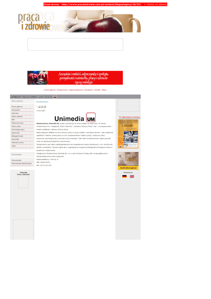 Zrzut strony: http://www.pracaizdrowie.com.pl/content/blogcategory/19/37/ | Strona głów na | W ydaw nictw o | Rada programow a | New sletter | Kontakt | Sklep | Menu główne Wydawnictwo Strona głów na * Aktualności 14.02.2007 Interview Dobre praktyki W najnowszym numerze BHP Medycyna pracy Wydawnictwo Unimedia Sp. z o.o. funkcjonuje na rynku polskim od 2006 roku. W ofercie Praw o pracy w ydaw niczej m.in.: miesięcznik „Praca i Zdrow ie”, „Leksykon Ochrony Pracy” oraz – w przygotow aniu – Psychologia pracy kolejne publikacje z zakresu ochrony pracy. Ergonomia Naszą misją jest działanie na rzecz ochrony pracy na rynku polskim, rozumianej szeroko – jako połączenie Biologia/chemia zagadnień z zakresu: praw a pracy (w tym: bezpieczeństw a i higieny pracy), medycyny pracy, Konteksty Polecamy strony ergonomii, psychologii pracy i procesów jej humanizacji. Tylko takie komplementarne ujęcie pozw olić może na napraw dę bezpieczne w arunki pracy. W ydaw nictw o jest także w spółorganizatorem lub organizatorem imprez branżow ych, m.in. konferencji, Video szkoleń, seminariów . Czynnie w łącza się w organizację lub w sparcie przedsięw zięć promujących zdrow e i bezpieczne miejsca pracy. Zamówienia Udziałow cem W ydaw nictw a Unimedia Sp. z o.o. jest Universum Verlag, lider na specjalistycznym niemieckojęzycznym rynku prasow ym. Prenumerata Prenumerata elektroniczna Kapitał zakładow y: 240 tys. zł KRS: 0000143470 NIP: 527-21-23-570 Telewizja Pracy i Zdrowia Mediadaten <--kliknij na adresie Zrzut strony: http://www.pracaizdrowie.com.pl/content/blogcategory/19/37/ DESIGN BY GRAPHIPLUS.PL <--kliknij na adresie