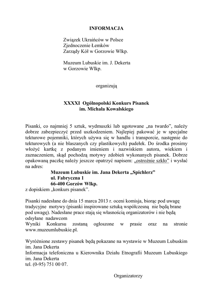 INFORMACJA Związek Ukraińców w Polsce Zjednoczenie Łemków Zarządy Kół w Gorzowie Wlkp. Muzeum Lubuskie im. J. Dekerta w Gorzowie Wlkp. organizują XXXXI Ogólnopolski Konkurs Pisanek im. Michała Kowalskiego Pisanki, co najmniej 5 sztuk, wydmuszki lub ugotowane „na twardo”, należy dobrze zabezpieczyć przed uszkodzeniem. Najlepiej pakować je w specjalne tekturowe pojemniki, których używa się w handlu i transporcie, następnie do tekturowych (a nie blaszanych czy plastikowych) pudełek. Do środka prosimy włożyć kartkę z podanym imieniem i nazwiskiem autora, wiekiem i zaznaczeniem, skąd pochodzą motywy zdobień wykonanych pisanek. Dobrze opakowaną paczkę należy jeszcze opatrzyć napisem: „ostrożnie szkło” i wysłać na adres: Muzeum Lubuskie im. Jana Dekerta „Spichlerz” ul. Fabryczna 1 66-400 Gorzów Wlkp. z dopiskiem „konkurs pisanek”. Pisanki nadesłane do dnia 15 marca 2013 r. oceni komisja, biorąc pod uwagę tradycyjne motywy (pisanki inspirowane sztuką współczesną nie będą brane pod uwagę). Nadesłane prace stają się własnością organizatorów i nie będą odsyłane nadawcom Wyniki Konkursu zostaną ogłoszone w prasie oraz na stronie www.muzeumlubuskie.pl. Wyróżnione zestawy pisanek będą pokazane na wystawie w Muzeum Lubuskim im. Jana Dekerta Informacja telefoniczna u Kierownika Działu Etnografii Muzeum Lubuskiego im. Jana Dekerta tel. (0-95) 751 00 07. Organizatorzy