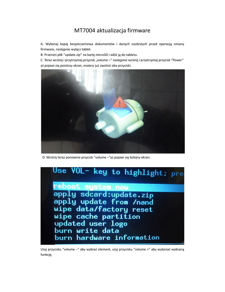 MT7004 aktualizacja firmware A. Wykonaj kopię bezpieczeństwa dokumentów i danych osobistych przed operacją zmiany firmware, następnie wyłącz tablet. B. Przenieś plik “update.zip” na kartę microSD i włóż ją do tabletu. C. Teraz wciśnij i przytrzymaj przycisk „volume –“ następnie wciśnij i przytrzymaj przycisk “Power” aż pojawi się poniższy ekran, możesz już zwolnić oba przyciski. D. Wciśnij teraz ponownie przycisk “volume –“aż pojawi się kolejny ekran: Użyj przycisku “volume –“ aby wybrać element, użyj przycisku “volume +” aby wykonać wybraną funkcję. Wykonaj kolejne kroki: 1. Wipe data/factory reset. 2. Yes -– delete all user data 3. Wipe cache partition. 4. Apply SDcard: update.zip 5. Update.zip 6. Reboot system now