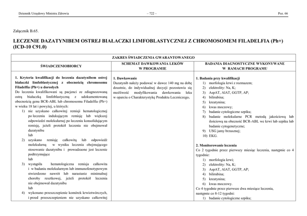 Dziennik Urzędowy Ministra Zdrowia – 722 – Poz. 66 Załącznik B.65. LECZENIE DAZATYNIBEM OSTREJ BIAŁACZKI LIMFOBLASTYCZNEJ Z CHROMOSOMEM FILADELFIA (Ph+) (ICD-10 C91.0) ZAKRES ŚWIADCZENIA GWARANTOWANEGO ŚWIADCZENIOBIORCY 1. Kryteria kwalifikacji do leczenia dazatynibem ostrej białaczki limfoblastycznej z obecnością chromosomu Filadelfia (Ph+) u dorosłych Do leczenia kwalifikowani są pacjenci ze zdiagnozowaną ostrą białaczką limfoblastyczną z udokumentowaną obecnością genu BCR-ABL lub chromosomu Filadelfia (Ph+) w wieku 18 lat i powyżej, u których: 1) nie uzyskano całkowitej remisji hematologicznej po leczeniu indukującym remisję lub większej odpowiedzi molekularnej po leczeniu konsolidującym remisję, jeżeli protokół leczenia nie obejmował dazatynibu lub 2) uzyskano remisję całkowitą lub odpowiedź molekularną w wyniku leczenia obejmującego stosowanie dazatynibu i prowadzaone jest leczenie podtrzymujące lub 3) wystąpiła hematologiczna remisja całkowita i w badaniu molekularnym lub immunofenotypowym stwierdzono nawrót lub narastanie minimalnej choroby resztkowej, jeżeli protokół leczenia nie obejmował dazatynibu lub 4) wykonano przeszczepienie komórek krwiotwórczych, i przed przeszczepieniem nie uzyskano całkowitej SCHEMAT DAWKOWANIA LEKÓW W PROGRAMIE BADANIA DIAGNOSTYCZNE WYKONYWANE W RAMACH PROGRAMU 1. Dawkowanie Dazatynib należy podawać w dawce 140 mg na dobę doustnie, do indywidualnej decyzji pozostawia się możliwość modyfikowania dawkowania leku w oparciu o Charakterystykę Produktu Leczniczego. 1. Badania przy kwalifikacji 1) morfologia krwi z rozmazem; 2) elektrolity: Na, K; 3) AspAT, AlAT, GGTP, AP; 4) bilirubina; 5) kreatynina; 6) kwas moczowy; 7) badanie cytologiczne szpiku; 8) badanie molekularne PCR metodą jakościową lub ilościową na obecność BCR-ABL we krwi lub szpiku lub badanie cytogenetyczne; 9) USG jamy brzusznej; 10) EKG. 2. Monitorowanie leczenia Co 2 tygodnie przez pierwszy miesiąc leczenia, następnie co 4 tygodnie: 1) morfologia krwi; 2) elektrolity: Na, K; 3) AspAT, AlAT, GGTP, AP; 4) bilirubina; 5) kreatynina; 6) kwas moczowy. Co 4 tygodnie przez pierwsze dwa miesiące leczenia, następnie co 8-12 tygodni: 1) badanie cytologiczne szpiku; Dziennik Urzędowy Ministra Zdrowia odpowiedzi molekularnej lub 5) wystąpiła wznowa hematologiczna choroby, jeżeli protokół leczenia nie obejmował dazatynibu lub 6) wystąpiły objawy nietolerancji imatynibu w trakcie wcześniejszej terapii w stopniu uniemożliwiającym dalsze jego stosowanie lub 7) stwierdzono pierwotne zajęcie ośrodkowego układu nerwowego (OUN). Do programu włączani są również pacjenci ze zdiagnozowaną ostrą białaczką limfoblastyczną z udokumentowaną obecnością genu BCR-ABL lub chromosomu Filadelfia (Ph+), którzy uprzednio byli leczeni dazatynibem w ramach chemioterapii niestandardowej oraz nowo zdiagnozowani pacjenci, którzy rozpoczęli terapię w okresie od 1 stycznia 2015 r. do 31 marca 2015 r. i rozpoczynając leczenie spełniali kryteria kwalifikacji do programu. 2. Określenie czasu leczenia w programie 1) u chorych nie poddanych transplantacji komórek krwiotwórczych leczenie dazatynibem należy kontynuować do czasu progresji choroby; 2) u chorych poddanych transplantacji komórek krwiotwórczych leczenie dazatynibem należy kontynuować do czasu uzyskania całkowitej odpowiedzi molekularnej, a następnie rozważyć kontynuowanie leczenia przez kolejne dwa lata lub do czasu progresji choroby. 3. Kryteria wyłączenia z programu 1) wystąpienie objawów nietolerancji dazatynibu; 2) progresja choroby w trakcie leczenia dazatynibem. – 723 – Poz. 66 2) badanie molekularne PCR metodą ilościową na obecność BCR-ABL we krwi lub szpiku lub badanie cytogenetyczne. 3. Monitorowanie programu: 1) gromadzenie w dokumentacji medycznej pacjenta danych dotyczących monitorowania leczenia i każdorazowe ich przedstawianie na żądanie kontrolerów Narodowego Funduszu Zdrowia; 2) uzupełnienie danych zawartych w rejestrze (SMPT) dostępnym za pomocą aplikacji internetowej udostępnionej przez OW NFZ, z częstotliwością zgodną z opisem programu oraz na zakończenie leczenia; 3) przekazywanie informacji sprawozdawczorozliczeniowych do NFZ: informacje przekazuje się do NFZ w formie papierowej lub w formie elektronicznej, zgodnie z wymaganiami opublikowanymi przez Narodowy Fundusz Zdrowia. Dziennik Urzędowy Ministra Zdrowia – 724 – Poz. 66