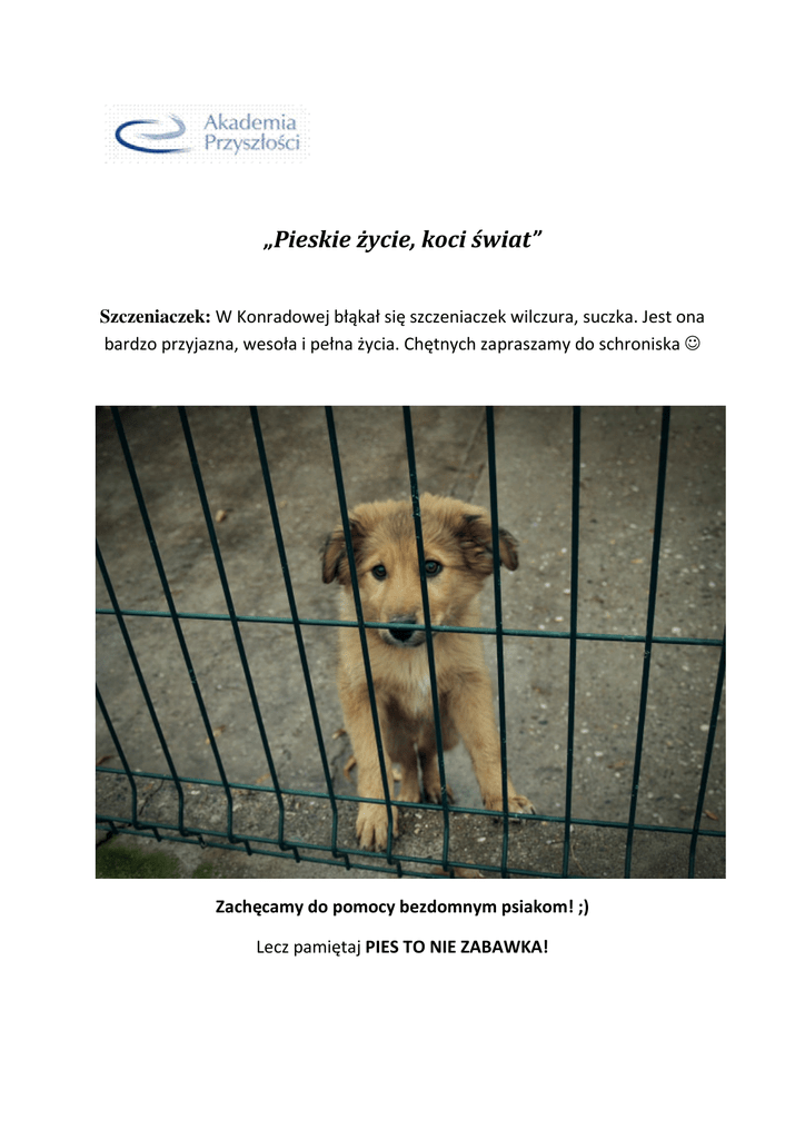 „Pieskie życie, koci świat” Szczeniaczek: W Konradowej błąkał się szczeniaczek wilczura, suczka. Jest ona bardzo przyjazna, wesoła i pełna życia. Chętnych zapraszamy do schroniska ☺ Zachęcamy do pomocy bezdomnym psiakom! ;) Lecz pamiętaj PIES TO NIE ZABAWKA! „Pieskie życie, koci świat” Bokserka: Starszą suczka Boksera znaleziona w Kamiennej Górze. Jak na starszą jest bardzo aktywna i sympatyczna. Może czeka właśnie na ciebie? Zachęcamy do pomocy bezdomnym psiakom! ;) Lecz pamiętaj PIES TO NIE ZABAWKA! „Pieskie życie, koci świat” Ciapek :Młoda suczka została przywieziona do schroniska niedawno. Jest spokojna i cicha, ale bardzo miła. Zapraszamy do schroniska w celu zapoznania się z nią bliżej! Zachęcamy do pomocy bezdomnym psiakom! ;) Lecz pamiętaj PIES TO NIE ZABAWKA! „Pieskie życie, koci świat” Mieszaniec: Na ul. Bohaterów Warszawy w Nysie została znaleziona brązowa suczka mieszańca boksera- Saba. Prawdopodobnie jej właściciel mieszka na ul. Batalionów. Więcej informacji w schronisku w Konradowej. Zachęcamy do pomocy bezdomnym psiakom! ;) Lecz pamiętaj PIES TO NIE ZABAWKA!