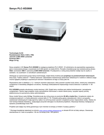 Sanyo PLC-XD2600 Technologia 3LCD Rozdzielczość XGA (1.024 x 768) Jasność 2.600 ANSI Lumenów Kontrast 500:1 Waga 2.6 kg Nowy projektor LCD Sanyo PLC-XD2600 to następca projektora PLC-XR201. W odróżnieniu do poprzednika wyposażony jest w nowoczesną lampę o żywotności do 6.000 godzin (w trybie ECO). Ponadto charakteryzuje się rozdzielczością obrazu XGA, kontrastem 500:1 i jasnością 2.600 ANSI lumenów. W połączeniu z cichą pracą idealnie nadaje się do użytku w szkołach, na uczelniach i w ośrodkach szkoleniowych. Obsługuje on opracowaną przez Sanyo technologię, dzięki której możliwa jest projekcja na powierzchniach kolorowych. Dwa tryby "Tablica zielona" i "Tablica kolorowa" odpowiednio dostosowują udział barw składowych w widmie w efekcie czego można oglądać projekcję w poprawnych kolorach niezależnie od tego co służy jako tło. Wyposażony jest w obiektyw z 1.2 - krotnym zoomem optycznym, który pozwoli uzyskać duży obraz, nawet przy ustawieniu urządzenia w niewielkiej odległości od ekranu. Korekcję zniekształcenia trapezowego można dokonać w zakresie +/- 30 stopni. PLC-XD2600 posiada wbudowany moduł sieciowy LAN. Dzięki temu możliwe jest zdalne kontrolowanie i zarządzanie urządzeniem. Oprócz tego projektor może samodzielnie informować o swoim stanie pracy, wysyłać raporty pocztą elektroniczną na wyznaczony adres administratora. Nowy model Sanyo waży 2.6 kg. Charakteryzuje się cichą pracą na poziomie 29 dB w trybie Eco. Urządzenie należy do energooszczędnych i w trybie gotowości zużywa tylko 0.7 W. Posiada pełną gamę zabezpieczeń, które w przypadku zastosowań edukacyjnych mają ogromny wpływ na ochronę przed użyciem urządzenia przez niepowołane osoby. Należy do nich funkcja blokady klawiatury, wyłączająca przyciski sterujące na obudowie projektora. Aktywacja klawiszy następuje po wpisaniu prawidłowego kodu PIN. Projektor jest objęty trzy letnią gwarancją w tym również na lampę (z limitem 2 tysięcy godzin).* * Wymaga bezpłatnej rejestracji na stronie www.sanyo-polska.pl/gwarancja w okresie 90 dni od daty zakupu. Gwarancja standardowa to 3 lata na projektor / 90 dni na lampę (max. 300 godzin)