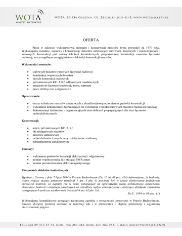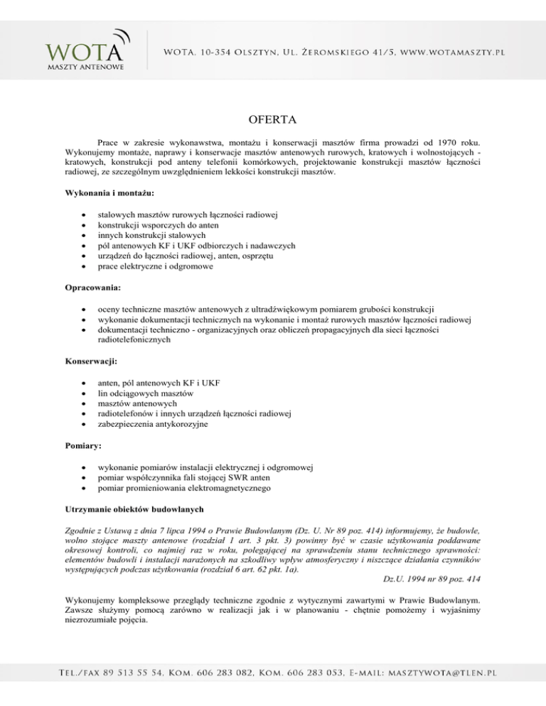 OFERTA Prace w zakresie wykonawstwa, montażu i konserwacji masztów firma prowadzi od 1970 roku. Wykonujemy montaże, naprawy i konserwacje masztów antenowych rurowych, kratowych i wolnostojących kratowych, konstrukcji pod anteny telefonii komórkowych, projektowanie konstrukcji masztów łączności radiowej, ze szczególnym uwzględnieniem lekkości konstrukcji masztów. Wykonania i montażu: stalowych masztów rurowych łączności radiowej konstrukcji wsporczych do anten innych konstrukcji stalowych pól antenowych KF i UKF odbiorczych i nadawczych urządzeń do łączności radiowej, anten, osprzętu prace elektryczne i odgromowe Opracowania: oceny techniczne masztów antenowych z ultradźwiękowym pomiarem grubości konstrukcji wykonanie dokumentacji technicznych na wykonanie i montaż rurowych masztów łączności radiowej dokumentacji techniczno - organizacyjnych oraz obliczeń propagacyjnych dla sieci łączności radiotelefonicznych Konserwacji: anten, pól antenowych KF i UKF lin odciągowych masztów masztów antenowych radiotelefonów i innych urządzeń łączności radiowej zabezpieczenia antykorozyjne Pomiary: wykonanie pomiarów instalacji elektrycznej i odgromowej pomiar współczynnika fali stojącej SWR anten pomiar promieniowania elektromagnetycznego Utrzymanie obiektów budowlanych Zgodnie z Ustawą z dnia 7 lipca 1994 o Prawie Budowlanym (Dz. U. Nr 89 poz. 414) informujemy, że budowle, wolno stojące maszty antenowe (rozdział 1 art. 3 pkt. 3) powinny być w czasie użytkowania poddawane okresowej kontroli, co najmiej raz w roku, polegającej na sprawdzeniu stanu technicznego sprawności: elementów budowli i instalacji narażonych na szkodliwy wpływ atmosferyczny i niszczące działania czynników występujących podczas użytkowania (rozdział 6 art. 62 pkt. 1a). Dz.U. 1994 nr 89 poz. 414 Wykonujemy kompleksowe przeglądy techniczne zgodnie z wytycznymi zawartymi w Prawie Budowlanym. Zawsze służymy pomocą zarówno w realizacji jak i w planowaniu - chętnie pomożemy i wyjaśnimy niezrozumiałe pojęcia.