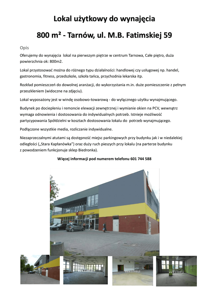 Lokal użytkowy do wynajęcia 800 m² - Tarnów, ul. M.B. Fatimskiej 59 Opis Oferujemy do wynajęcia lokal na pierwszym piętrze w centrum Tarnowa, Całe piętro, duża powierzchnia ok: 800m2. Lokal przystosować można do różnego typu działalności: handlowej czy usługowej np. handel, gastronomia, fitness, przedszkole, szkoła tańca, przychodnia lekarska itp. Rozkład pomieszczeń do dowolnej aranżacji, do wykorzystania m.in. duże pomieszczenie z pełnym przeszkleniem (widoczne na zdjęciu). Lokal wyposażony jest w windę osobowo-towarową - do wyłącznego użytku wynajmującego. Budynek po dociepleniu i remoncie elewacji zewnętrznej i wymianie okien na PCV, wewnątrz wymaga odnowienia i dostosowania do indywidualnych potrzeb. Istnieje możliwość partycypowania Spółdzielni w kosztach dostosowania lokalu do potrzeb wynajmującego. Podłączone wszystkie media, rozliczanie indywidualne. Niezaprzeczalnymi atutami są dostępność miejsc parkingowych przy budynku jak i w niedalekiej odległości („Stara Kapłanówka”) oraz duży ruch pieszych przy lokalu (na parterze budynku z powodzeniem funkcjonuje sklep Biedronka). Więcej informacji pod numerem telefonu 601 744 588