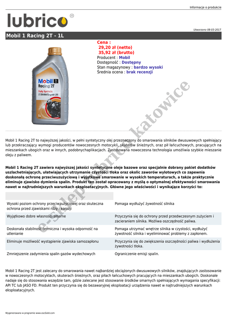 Informacje o produkcie Utworzono 08-03-2017 Mobil 1 Racing 2T - 1L Cena : 29,20 zł (netto) 35,92 zł (brutto) ka to w ic e Producent : Mobil Dostępność : Dostępny Stan magazynowy : bardzo wysoki Średnia ocena : brak recenzji lu br ic o Mobil 1 Racing 2T to najwyższej jakości, w pełni syntetyczny olej przeznaczony do smarowania silników dwusuwowych spełniający lub przekraczający wymogi producentów nowoczesnych motocykli, skuterów śnieżnych, oraz pił łańcuchowych, pracujących na mieszankach ubogich oraz w innych, podobnychaplikacjach. Zastosowana nowoczesna technologia umożliwia szybkie mieszanie oleju z paliwem. ep Mobil 1 Racing 2T zawiera najwyższej jakości syntetyczne oleje bazowe oraz specjalnie dobrany pakiet dodatków uszlachetniających, ułatwiających utrzymanie czystości tłoka oraz okolic zaworów wylotowych co zapewnia doskonałą ochronę przeciwuzużyciową i wyjątkowe smarowanie w wysokich temperaturach, a także praktycznie eliminuje zjawisko dymienia spalin. Produkt ten został opracowany z myślą o optymalnej efektywności smarowania nawet w najtrudniejszych warunkach eksploatacyjnych. Główne jego właściwości i wynikające korzyści to: Pomaga wydłużyć żywotność silnika Wyjątkowo dobre własności smarne Przyczynia się do ochrony przed przedwczesnym zużyciem i zacieraniem silnika. Możliwa oszczędność paliwa. Doskonała stabilność termiczna i wysoka odporność na utlenianie Pomaga utrzymać wnętrze silnika w czystości, wydłużyć żywotność silnika i wyeliminować problemy z zapłonem. Eliminuje możliwość wystąpienie zjawiska samozapłonu Przyczynia się do zwiększenia oszczędności paliwa i wydłużenia żywotności tłoka. Zmniejszenie zadymienia spalin gazów wydechowych Ograniczenie emisji spalin. es kl Wysoki poziom ochrony przeciwzużyciowej oraz skuteczna ochrona przed zjawiskami rdzy i korozji Mobil 1 Racing 2T jest zalecany do smarowania nawet najbardziej obciążonych dwusuwowych silników, znajdujących zastosowanie w nowoczesnych motocyklach, skuterach śnieżnych, oraz piłach łańcuchowych pracujących na mieszankach ubogich. Doskonale nadaje się do stosowania wszędzie tam, gdzie zalecane jest stosowanie środków smarnych spełniających wymagania specyfikacji: API TC lub JASO FD. Produkt ten przyczynia się do bezawaryjnej eksploatacji urządzenia nawet w najtrudniejszych warunkach eksploatacyjnych. Wygenerowano w programie www.oscGold.com Specyfikacje Mobil 1 Racing 2T spełnia wymagania poniższych specyfikacji: API TC ISO E-GC, E-GD JASO FC, FD SAE Klasa 1 Klasa 2 e Dostępne opcje Mobil 1 Racing 2T - 1L es kl ep lu br ic o ka to w ic » Rodzaj: Olej motocyklowy.