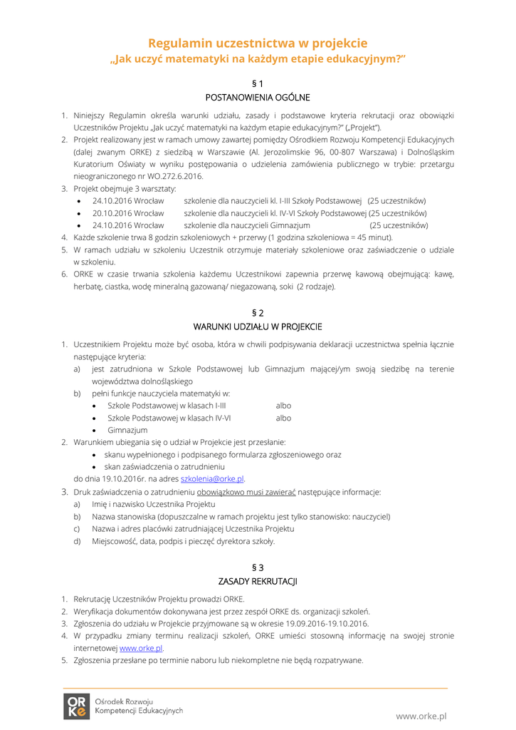 Regulamin uczestnictwa w projekcie „Jak uczyć matematyki na każdym etapie edukacyjnym?” §1 POSTANOWIENIA OGÓLNE 1. Niniejszy Regulamin określa warunki udziału, zasady i podstawowe kryteria rekrutacji oraz obowiązki Uczestników Projektu „Jak uczyć matematyki na każdym etapie edukacyjnym?” („Projekt”). 2. Projekt realizowany jest w ramach umowy zawartej pomiędzy Ośrodkiem Rozwoju Kompetencji Edukacyjnych (dalej zwanym ORKE) z siedzibą w Warszawie (Al. Jerozolimskie 96, 00-807 Warszawa) i Dolnośląskim Kuratorium Oświaty w wyniku postępowania o udzielenia zamówienia publicznego w trybie: przetargu nieograniczonego nr WO.272.6.2016. 3. Projekt obejmuje 3 warsztaty: 24.10.2016 Wrocław szkolenie dla nauczycieli kl. I-III Szkoły Podstawowej (25 uczestników) 20.10.2016 Wrocław szkolenie dla nauczycieli kl. IV-VI Szkoły Podstawowej (25 uczestników) 24.10.2016 Wrocław szkolenie dla nauczycieli Gimnazjum (25 uczestników) 4. Każde szkolenie trwa 8 godzin szkoleniowych + przerwy (1 godzina szkoleniowa = 45 minut). 5. W ramach udziału w szkoleniu Uczestnik otrzymuje materiały szkoleniowe oraz zaświadczenie o udziale w szkoleniu. 6. ORKE w czasie trwania szkolenia każdemu Uczestnikowi zapewnia przerwę kawową obejmującą: kawę, herbatę, ciastka, wodę mineralną gazowaną/ niegazowaną, soki (2 rodzaje). §2 WARUNKI UDZIAŁU W PROJEKCIE 1. Uczestnikiem Projektu może być osoba, która w chwili podpisywania deklaracji uczestnictwa spełnia łącznie następujące kryteria: a) jest zatrudniona w Szkole Podstawowej lub Gimnazjum mającej/ym swoją siedzibę na terenie województwa dolnośląskiego b) pełni funkcje nauczyciela matematyki w: Szkole Podstawowej w klasach I-III albo Szkole Podstawowej w klasach IV-VI albo Gimnazjum 2. Warunkiem ubiegania się o udział w Projekcie jest przesłanie: skanu wypełnionego i podpisanego formularza zgłoszeniowego oraz skan zaświadczenia o zatrudnieniu do dnia 19.10.2016r. na adres [email protected]. 3. Druk zaświadczenia o zatrudnieniu obowiązkowo musi zawierać następujące informacje: a) Imię i nazwisko Uczestnika Projektu b) Nazwa stanowiska (dopuszczalne w ramach projektu jest tylko stanowisko: nauczyciel) c) Nazwa i adres placówki zatrudniającej Uczestnika Projektu d) Miejscowość, data, podpis i pieczęć dyrektora szkoły. §3 ZASADY REKRUTACJI 1. Rekrutację Uczestników Projektu prowadzi ORKE. 2. Weryfikacja dokumentów dokonywana jest przez zespół ORKE ds. organizacji szkoleń. 3. Zgłoszenia do udziału w Projekcie przyjmowane są w okresie 19.09.2016-19.10.2016. 4. W przypadku zmiany terminu realizacji szkoleń, ORKE umieści stosowną informację na swojej stronie internetowej www.orke.pl. 5. Zgłoszenia przesłane po terminie naboru lub niekompletne nie będą rozpatrywane. www.orke.pl 6. Osoby zgłoszone w terminie i spełniające warunki udziału w Projekcie zostaną wpisane na listę Uczestników, zgodnie z kolejnością zgłoszeń. 7. Każda grupa szkoleniowa może liczyć max. 25 osób (podstawowa lista Uczestników). 8. W przypadku zapełnienia podstawowej listy Uczestników, osoby zgłoszone w terminie i spełniające warunki udziału w Projekcie, zostaną wpisane na listę rezerwową. 9. Do objęcia udziału w szkoleniu zakwalifikowani zostaną jedynie Uczestnicy znajdujący się na podstawowej liście Uczestników. 10. Udział w szkoleniu Uczestnika z listy rezerwowej jest możliwy w przypadku rezygnacji Uczestnika z listy podstawowej, najpóźniej jeden dzień przed terminem szkolenia dla danej grupy nauczycieli. Propozycja udziału w zastępstwie za rezygnującego uczestnika zostanie złożona Uczestnikom z listy rezerwowej zgodnie z kolejnością zgłoszeń. 11. W chwili zapełnienia miejsc na podstawowych listach Uczestników, osoby zakwalifikowane do udziału w szkoleniu oraz osoby z list rezerwowych zostaną poinformowane mailowo, na adres e-miał wskazany przez uczestnika w formularzu zgłoszeniowym. Osoby zakwalifikowane do udziału w Projekcie wraz z powiadomieniem o zakwalifikowaniu otrzymają także informacje organizacyjne (adres, data, godziny zajęć). §4 UPRAWNIENIA I OBOWIĄZKI UCZESTNIKÓW PROJEKTU 1. Uczestnik Projektu uprawniony jest do: nieodpłatnego udziału w Projekcie (szkoleniu), otrzymania bezpłatnych materiałów szkoleniowych, skorzystania z bezpłatnych przerw kawowych zapewnionych w czasie trwania zajęć. 2. Uczestnicy Projektu zobowiązani są do uczestnictwa w 8 godzinach szkolenia na które przesłali swoje zgłoszenie. 3. Uczestnik Projektu zobowiązuje się do wypełniania list obecności oraz ankiet oceniających zajęcia prowadzone w ramach Projektu. 4. Z własnej przyczyny Uczestnik, który został zakwalifikowany, może zrezygnować z udziału w Projekcie przed rozpoczęciem szkolenia, informując o tym pisemnie ORKE, nie później jednak niż na 5 dni roboczych przed rozpoczęciem szkolenia. 5. W przypadku rezygnacji w czasie krótszym niż 5 dni przed terminem szkolenia, osoba rezygnująca zostanie obciążona pełnym kosztem udziałem 1 Uczestnika w szkoleniu tj. kwotą 83,01zł brutto. 6. ORKE dopuszcza usprawiedliwienie nieobecności spowodowane chorobą lub ważnymi sytuacjami losowymi. Usprawiedliwienie jest dokonywane na podstawie przedstawionego zwolnienia lekarskiego lub innych dokumentów usprawiedliwiających jego nieobecność. 7. W przypadku nieusprawiedliwionej nieobecności na szkoleniu Uczestnik zostanie obciążony pełnym kosztem udziałem 1 Uczestnika w szkoleniu tj. kwotą 83,01zł brutto. 8. W przypadku zaistnienia sytuacji opisanych w § 4 pkt 5 i 7, ORKE upoważnione jest do wystawienia na rzecz Uczestnika faktury VAT. §5 POSTANOWIENIA KOŃCOWE 1. Regulamin wchodzi w życie z dniem 19 września 2016 roku. 2. ORKE zastrzega sobie prawo do zmiany Regulaminu. Informacja o każdorazowej zmianie zostanie zamieszczona na stronie internetowej ORKE: www.orke.pl. 3. Uczestnik Projektu podpisując formularz zgłoszeniowy jednocz