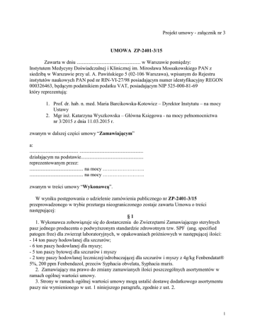Projekt umowy - załącznik nr 3 UMOWA ZP-2401-3/15 Zawarta w dniu ................................................... w Warszawie pomiędzy: Instytutem Medycyny Doświadczalnej i Klinicznej im. Mirosława Mossakowskiego PAN z siedzibą w Warszawie przy ul. A. Pawińskiego 5 (02-106 Warszawa), wpisanym do Rejestru instytutów naukowych PAN pod nr RIN-VI-27/98 posiadającym numer identyfikacyjny REGON 000326463, będącym podatnikiem podatku VAT, posiadającym NIP 525-000-81-69 który reprezentują: 1. Prof. dr. hab. n. med. Maria Barcikowska-Kotowicz – Dyrektor Instytutu – na mocy Ustawy 2. Mgr inż. Katarzyna Wyszkowska – Główna Księgowa - na mocy pełnomocnictwa nr 3/2015 z dnia 11.03.2015 r. zwanym w dalszej części umowy “Zamawiającym” a: ....................................... ................................................... działającym na podstawie.................................................. reprezentowanym przez: ........................................... na mocy ……………………. ........................................... na mocy ……………………. zwanym w treści umowy “Wykonawcą”. W wyniku postępowania o udzielenie zamówienia publicznego nr ZP-2401-3/15 przeprowadzonego w trybie przetargu nieograniczonego zostaje zawarta Umowa o treści następującej: §1 1. Wykonawca zobowiązuje się do dostarczenia do Zwierzętarni Zamawiającego sterylnych pasz jednego producenta o podwyższonym standardzie zdrowotnym tzw. SPF (ang. specified patogen free) dla zwierząt laboratoryjnych, w opakowaniach próżniowych w następującej ilości: - 14 ton paszy hodowlanej dla szczurów; - 6 ton paszy hodowlanej dla myszy; - 5 ton paszy bytowej dla szczurów i myszy - 2 tony paszy hodowlanej leczniczej/odrobaczającej dla szczurów i myszy z 4g/kg Fenbendatat® 5%, 200 ppm Fenbendazol, przeciw Syphacia obvelata, Syphacia muris. 2. Zamawiający ma prawo do zmiany zamawianych ilości poszczególnych asortymentów w ramach ogólnej wartości umowy. 3. Strony w ramach ogólnej wartości umowy mogą ustalić dostawę dodatkowego asortymentu paszy nie wymienionego w ust. 1 niniejszego paragrafu, zgodnie z ust. 2. 1 §2 1. Wykonawca zobowiązuje się do dokonywania dostaw do siedziby Zamawiającego sukcesywnie, w zależności od zużycia wcześniejszych partii paszy, zgodnie z zapotrzebowaniami składanymi przez Zamawiającego. 2. Termin dostawy – do … tygodni od daty złożenia zapotrzebowania przez Zamawiającego. 1. §3 Wartość Umowy stanowiąca wynagrodzenie Wykonawcy za realizację całości dostawy uwzględniająca koszt transportu i ubezpieczenia zgodnie z ofertą z dn. ……………. wynosi: …………................…. netto i będzie powiększona o należny podatek VAT. Zmiany wynagrodzenia należnego wykonawcy w niniejszym postepowaniu będą możliwe w przypadku zmiany: 1) stawki podatku od towarów i usług; 2) wysokości minimalnego wynagrodzenia za prace ustalonego na podstawie art. 2 ust. 3-5 ustawy z dnia 10 października 2002 r. o minimalnym wynagrodzeniu za pracę; 3) zasad podlegania ubezpieczeniom społecznym lub ubezpieczeniu zdrowotnemu lub wysokości stawki składki na ubezpieczenia społeczne lub zdrowotne – jeżeli zmiany te będą miały wpływ na koszty wykonania zamówienia przez wykonawcę. 3. W przypadku, gdy zmianie ulega stawka podatku od towarów i usług wartość netto wynagrodzenia Wykonawcy nie zmieni się, a określona w aneksie wartość brutto wynagrodzenia zostanie wyliczona na podstawie nowych przepisów, od dnia wejścia w życie zmiany. 4. W przypadku, gdy ulega zmianie minimalne wynagrodzenie za pracę, na udokumentowany wniosek Wykonawcy wykazujący dowodnie jej wpływ na wzrost kosztów wykonania Umowy, Strony, ustalają w Aneksie nową wysokość wartości umowy, od dnia wejścia w życie zmiany. 5. W przypadku, gdy ulegają zmianie zasady podlegania ubezpieczeniom społecznym lub ubezpieczeniu zdrowotnemu lub wysokości stawki składki na ubezpieczenia społeczne lub zdrowotne przy zachowaniu dotychczasowej kwoty netto wynagrodzenia osób bezpośrednio wykonujących zamówienie na rzecz Zamawiającego, Strony ustalają w Aneksie nową wysokość wartości umowy, od dnia wejścia w życie zmiany. 2. §4 Ceny jednostkowe netto: 1 kg paszy hodowlanej dla szczurów; symbol ............ .......................... 1 kg paszy hodowlanej dla myszy; symbol ............ .......................... 1 kg paszy bytowej dla szczurów i myszy symbol ........... .......................... symbol ........... .......................... 1 kg paszy hodowlanej leczniczej/odrobaczającej dla szczurów i myszy pozostają stałe na cały okres trwania Umowy. 2 §5 1. Wynagrodzenie będzie płatne w częściach, to znaczy płatności dokonywane będą na faktury wystawiane za poszczególne dostawy. 2. Faktura wystawiona będzie w PLN. W przypadku konieczności przeliczenia waluty nastąpi ono wg mechanizmu określonego w ofercie. 3. Płatności dokonywane będą przelewem na rachunek Wykonawcy podany na fakturze w terminie….. dni od daty otrzymania przez Zamawiającego prawidłowo wystawionej faktury. 4. Za termin zapłaty uznaje się dzień, w którym Zamawiający polecił swojemu bankowi przelać na wskazane w fakturze konto kwotę wynikającą z prawidłowo wystawionej faktury. §6 Wykonawca zobowiązuje się przedstawić certyfikat jakości oferowanej paszy oraz do każdej partii paszy dostarczyć Zamawiającemu certyfikat analizy składu. Opakowania jednostkowe, w przypadku utraty hermetyczności, będą zwracane do wymiany na koszt Wykonawcy, sukcesywnie w miarę zużycia transzy. §7 Strony ustalają kary umowne: - za każdy dzień opóźnienia dostawy powyżej 7 dni Wykonawca zapłaci Zamawiającemu karę umowną w wysokości 0,1% wartości umowy za każdy dzień zwłoki, - w przypadku nieterminowej zapłaty faktury Zamawiający zapłaci Wykonawcy karę umowna w wysokości odsetek ustawowych. Zamawiający 