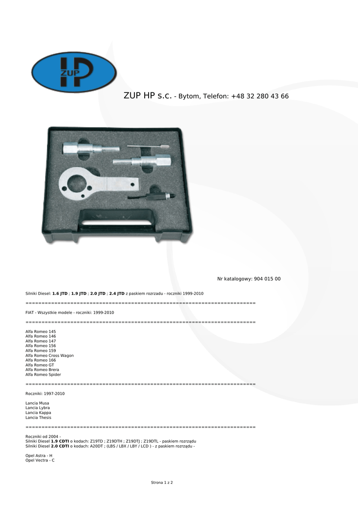 ZUP HP s.c. - Bytom, Telefon: +48 32 280 43 66 Nr katalogowy: 904 015 00 Silniki Diesel: 1.6 JTD ; 1.9 JTD ; 2.0 JTD ; 2.4 JTD z paskiem rozrzadu - roczniki 1999-2010 ======================================================================== FIAT - Wszystkie modele - roczniki: 1999-2010 ======================================================================== Alfa Alfa Alfa Alfa Alfa Alfa Alfa Alfa Alfa Alfa Romeo Romeo Romeo Romeo Romeo Romeo Romeo Romeo Romeo Romeo 145 146 147 156 159 Cross Wagon 166 GT Brera Spider ======================================================================== Roczniki: 1997-2010 Lancia Lancia Lancia Lancia Musa Lybra Kappa Thesis ======================================================================== Roczniki od 2004 Silniki Diesel 1.9 CDTI o kodach: Z19TD ; Z19DTH ; Z19DTJ ; Z19DTL - paskiem rozrządu Silniki Diesel 2.0 CDTI o kodach: A20DT ; (LBS / LBX / LBY / LCD ) - z paskiem rozrządu Opel Astra - H Opel Vectra - C Strona 1 z 2 Opel Signum Opel Zafira - B Opel Insignia ======================================================================== Roczniki od 2004 Silniki Diesel 1.9 TiD o kodach: Z19TD ; Z19DTH - paskiem rozrządu Saab 93 - roczniki 1998-2004 Saab 95 - roczniki 2002-2006 ================================================================================== Typy silników: 1.6 JTD 16V - 198A2.000 ; 198A3.000 ; 198A6.000 ; 350A2.000 1.9 JTD 8V - 323.02 ; 371.01 ; 182B4.000 ; 182B9.000 ; 186A6.000 ; 186A8.000 ; 186A9.000 188A2.000 ; 188A7.000 ; 188B2.000 ; 192A1.000 ; 192A3.000 ; 192A8.000 ; 192A9.000 ; 939A7.000 192B4.000 ; 192B5.000 ; 199A5.000 ; 223A7.000 ; 937A2.000 ; 937A3.000 ; 939A1.000 ; 939A5.000 1.9 JTD 16V - 192A5.000 ; 192B1.000 ; 937A4.000 ; 937A5.000 ; 939A2.000 ; 939A8.000 2.0 JTD 16V - 198A5.000 2.4 JTD 10V - 325.01 ; 342.02 ; 362.02 ; 185A6.000 ; 838A8.000 ; 839A5.000 ; 839A6.000 ; 841C.000 2.4 JTD 20V - 841C.000 ; 841D.000 ; 841G000 ; 841H.000 ; 841M.000 ; 939A3.000 ; 939A9.000 Strona 2 z 2
