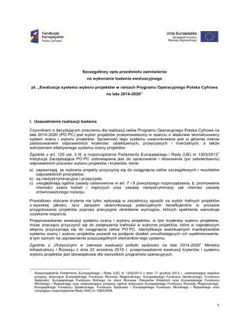 Szczegółowy opis przedmiotu zamówienia na wykonanie badania ewaluacyjnego pt. „Ewaluacja systemu wyboru projektów w ramach Programu Operacyjnego Polska Cyfrowa na lata 2014-2020” I. Uzasadnienie realizacji badania Czynnikiem o decydującym znaczeniu dla realizacji celów Programu Operacyjnego Polska Cyfrowa na lata 2014-2020 (PO PC) jest wybór projektów przeprowadzony w oparciu o właściwie skonstruowany system oceny i wyboru projektów. Sprawność tego systemu uwarunkowana jest w głównej mierze zastosowaniem odpowiednich kryteriów: obiektywnych, przejrzystych i mierzalnych, a także wdrożeniem efektywnego systemu oceny projektów. 1 Zgodnie z art. 125 ust. 3 lit. a rozporządzenia Parlamentu Europejskiego i Rady (UE) nr 1303/2013 Instytucja Zarządzająca PO PC zobowiązana jest do opracowania i stosowania (po zatwierdzeniu) odpowiednich procedur wyboru projektów i kryteriów, które: a) zapewniają, że wybrane projekty przyczynią się do osiągnięcia celów szczegółowych i rezultatów odpowiednich priorytetów; b) są niedyskryminacyjne i przejrzyste; c) uwzględniają ogólne zasady ustanowione w art. 7 i 8 powyższego rozporządzenia, tj. promowanie równości szans kobiet i mężczyzn oraz zasadę niedyskryminacji, jak również zasadę zrównoważonego rozwoju. Prawidłowo dobrane kryteria nie tylko wpływają w zasadniczy sposób na wybór trafnych projektów o wysokiej jakości, lecz zarazem ukierunkowują potencjalnych beneficjentów w procesie przygotowania projektów poprzez precyzyjne określenie wymogów, których spełnienie warunkuje uzyskanie wsparcia. Przeprowadzenie ewaluacji systemu oceny i wyboru projektów, w tym kryteriów wyboru projektów, może znacząco przyczynić się do zwiększenia trafności w wyborze projektów, które w największym stopniu przyczyniają się do osiągnięcia celów PO PC. Identyfikacja ewentualnych mankamentów systemu oceny i wyboru projektów pozwoli na podjęcie działań umożliwiających ich wyeliminowanie, a tym samym na usprawnienie poszczególnych elementów tego systemu. Zgodnie z „Wytycznymi w zakresie ewaluacji polityki spójności na lata 2014-2020” Ministra Infrastruktury i Rozwoju z dnia 22 września 2015 r. przeprowadzenie ewaluacji kryteriów i systemu wyboru projektów jest obowiązkowe dla wszystkich programów operacyjnych. 1 Rozporządzenie Parlamentu Europejskiego i Rady (UE) nr 1303/2013 z dnia 17 grudnia 2013 r. ustanawiające wspólne przepisy dotyczące Europejskiego Funduszu Rozwoju Regionalnego, Europejskiego Funduszu Społecznego, Funduszu Spójności, Europejskiego Funduszu Rolnego na rzecz Rozwoju Obszarów Wiejskich oraz Europejskiego Funduszu Morskiego i Rybackiego oraz ustanawiające przepisy ogólne dotyczące Europejskiego Funduszu Rozwoju Regionalnego, Europejskiego Funduszu Społecznego, Funduszu Spójności i Europejskiego Funduszu Morskiego i Rybackiego oraz uchylające rozporządzenie Rady (WE) nr 1083/2006. 1 II. Cel badania Celem badania jest ocena systemu wyboru projektów, w tym kryteriów ich wyboru, w odniesieniu do wybranych działań Programu Operacyjnego Polska Cyfrowa na lata 2014-2020. W ramach badania oceniona zostanie trafność, efektywność, skuteczność oraz użyteczność tego systemu. Na podstawie wyników badania opracowane zostaną rekomendacje dotyczące ewentualnych zmian w zakresie kryteriów wyboru projektów oraz systemu oceny i wyboru projektów w ramach PO PC, które przyczynią się do zwiększenia skuteczności i efektywności procesu wyboru projektów w kontekście realizacji celów Programu. III. Zakres przedmiotowy badania Badanie będzie się składało z dwóch modułów odpowiadających głównym obszarom przedmiotowym ewaluacji. Moduł I. Kryteria wyboru projektów W ramach modułu I zostaną poddane analizie i ocenie następujące zagadnienia: a) prawidłowość sformułowania kryteriów wyboru projektów, w tym m.in. takie cechy jak: • • • • • • jednoznaczność, obiektywność, mierzalność, poprawność merytoryczna, kompletność i spójność wewnętrzna w ramach poszczególnych konkursów, zgodność z zasadami horyzontalnymi, o których mowa w art. 7 i art. 8 rozporządzenia Parlamentu Europejskiego i Rady (UE) nr 1303/2013; b) skuteczność kryteriów wyboru projektów (trafność ich doboru z punktu widzenia zapewnienia wyboru projektów, które w największym stopniu przyczyniają się do realizacji celów PO PC oraz wpisują w logikę interwencji, jak również umożliwiają wypełnienie zobowiązań wynikających z przyjętych ram wykonania), w tym m.in.: • • • • spójność kryteriów z celami Programu, adekwatność punktacji/znaczenia przypisanego poszczególnym kryteriom w kontekście realizacji celów Programu, trafność doboru kryteriów z punktu widzenia realizacji wskaźników oraz kluczowych etapów wdrażania ujętych w ramach wykonania, zdolność kryteriów do wpływania na przygotowanie projektów o wysokiej jakości w realnym wymiarze (tj. do przeciwdziałania sporządzaniu wniosków, które spełniają wymagane kryteria i osiągają określony poziom punktów, jednak treść wniosku nie znajduje następnie odzwierciedlenia w rzeczywistej wysokiej jakości projektu). Moduł II. System oceny i wyboru projektów W ramach modułu II przeprowadzona zostanie analiza i ocena zasad oraz sposobu realizacji naborów i ocen wniosków składanych w ramach działań objętych badaniem. Obejmie ona m.in. następujące zagadnienia: a) prawidłowość rozplanowania konkursów w odniesieniu do: • celów Programu, w tym możliwości realizacji zobowiązań wynikających z przyjętych ram wykonania, specyfiki projektów, potrzeb oraz możliwości potencjalnych wnioskodawców, potencjału administracyjnego i eksperckiego instytucji organizującej konkursy (przy uwzględnieniu częstotliwości ogłaszania konkursów, specyfiki projektów, kwot alokacji); • • • 2 b) sposób organizacji procesu naboru
