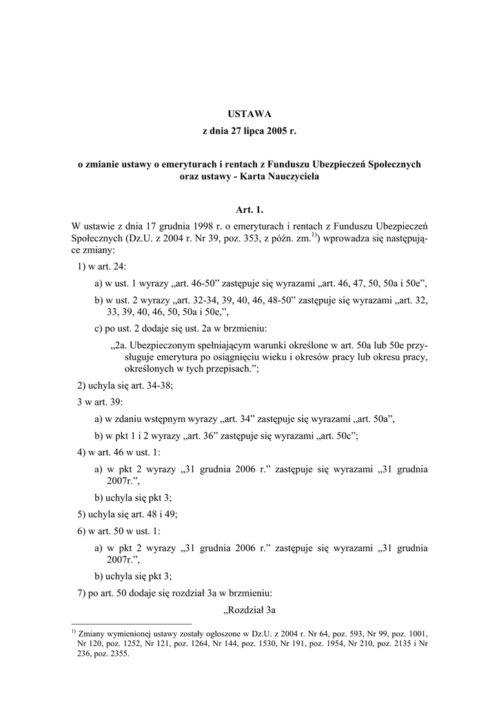 USTAWA z dnia 27 lipca 2005 r. o zmianie ustawy o emeryturach i