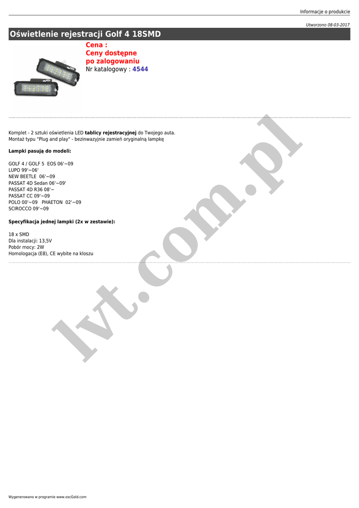 Informacje o produkcie Utworzono 08-03-2017 Oświetlenie rejestracji Golf 4 18SMD Cena : Ceny dostępne po zalogowaniu Nr katalogowy : 4544 l Komplet - 2 sztuki oświetlenia LED tablicy rejestracyjnej do Twojego auta. Montaż typu "Plug and play" - bezinwazyjnie zamień oryginalną lampkę GOLF 4 / GOLF 5 EOS 06'~09 LUPO 99'~06' NEW BEETLE 06'~09 PASSAT 4D Sedan 06'~09' PASSAT 4D R36 08'~ PASSAT CC 09'~09 POLO 00'~09 PHAETON 02'~09 SCIROCCO 09'~09 Specyfikacja jednej lampki (2x w zestawie): lv t. co 18 x SMD Dla instalacji: 13,5V Pobór mocy: 2W Homologacja (E8), CE wybite na kloszu m .p Lampki pasują do modeli: Wygenerowano w programie www.oscGold.com